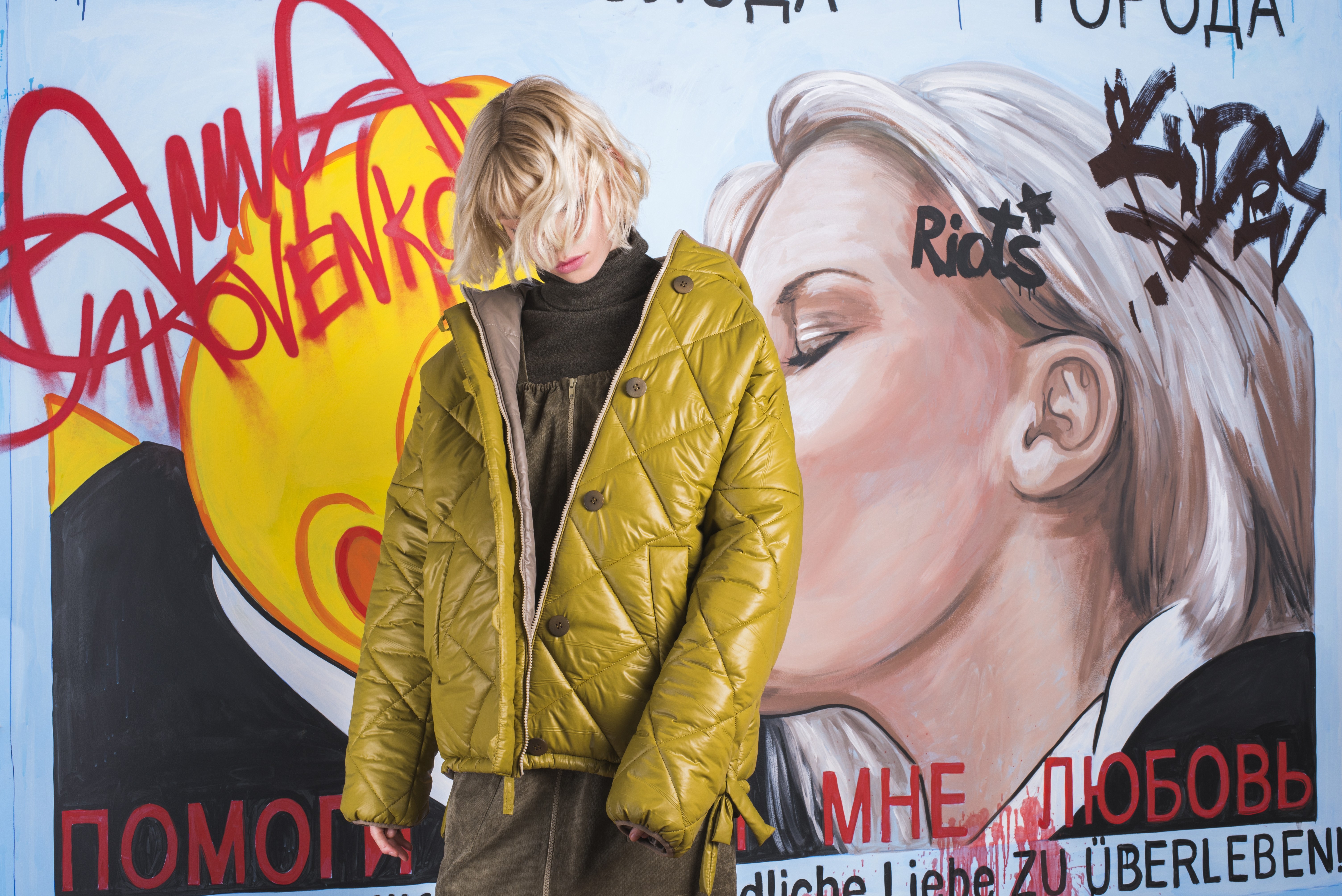 Новая зимняя коллекция бренда ANNA YAKOVENKO посвящена улицам Берлина, неповторимому стилю его жительниц. Яркий образ, несмотря на суровые погодные условия, стал источником вдохновения для дизайнера Анны Яковенко. А чтобы подчеркнуть тему новой коллекции команда ANNA YAKOVENKO решила создать авторское граффити, напоминающее о культовом произведении Дмитрия Врубеля в East Side Gallery, изображающее поцелуй Леонида Брежнева и руководителя ГДР Эриха Хонеккера. «Господи! Помоги мне выжить среди этой смертной любви» (нем. Mein Gott, hilf mir, diese tödliche Liebe zu überleben) – одно из самых известных граффити мира. Украинская художница Александра Степаненко из Q art создала эффектную работу, которая и послужила фоном для съемок рекламного кампейна бренда.