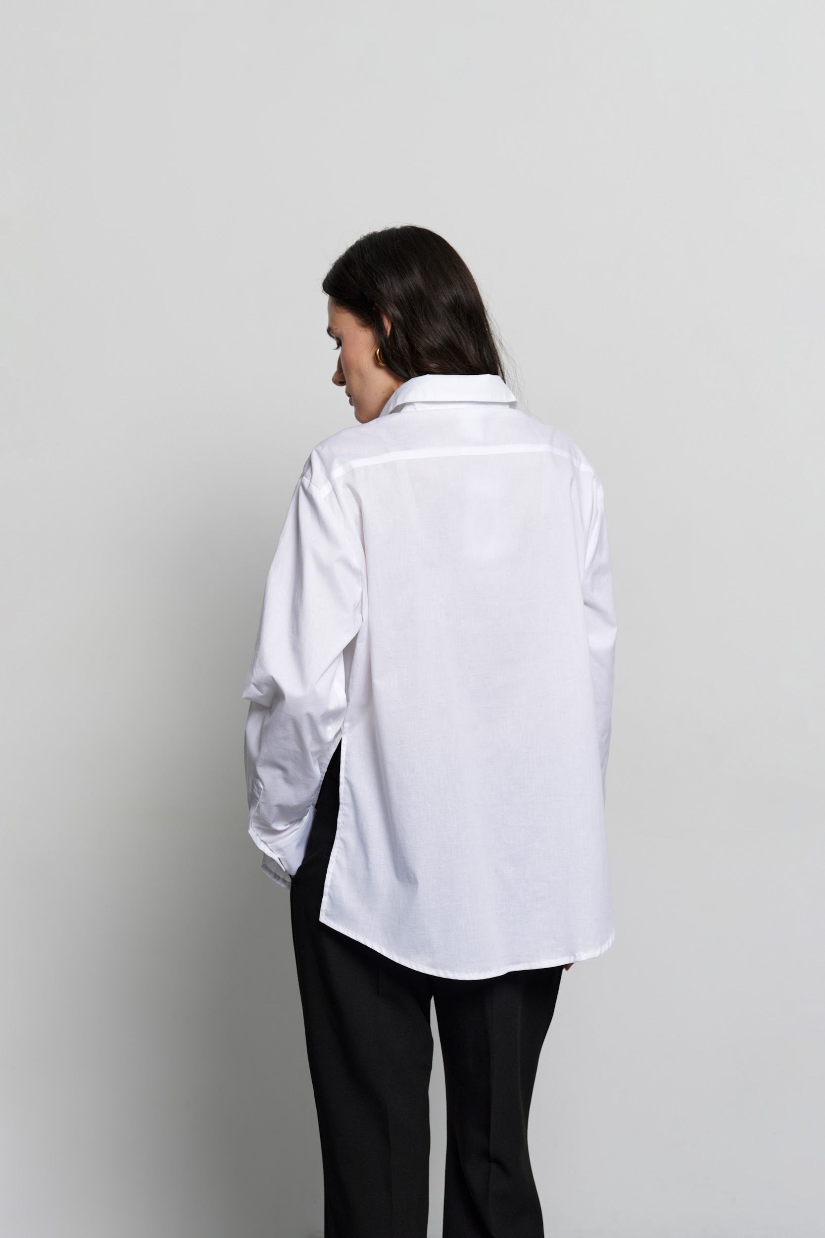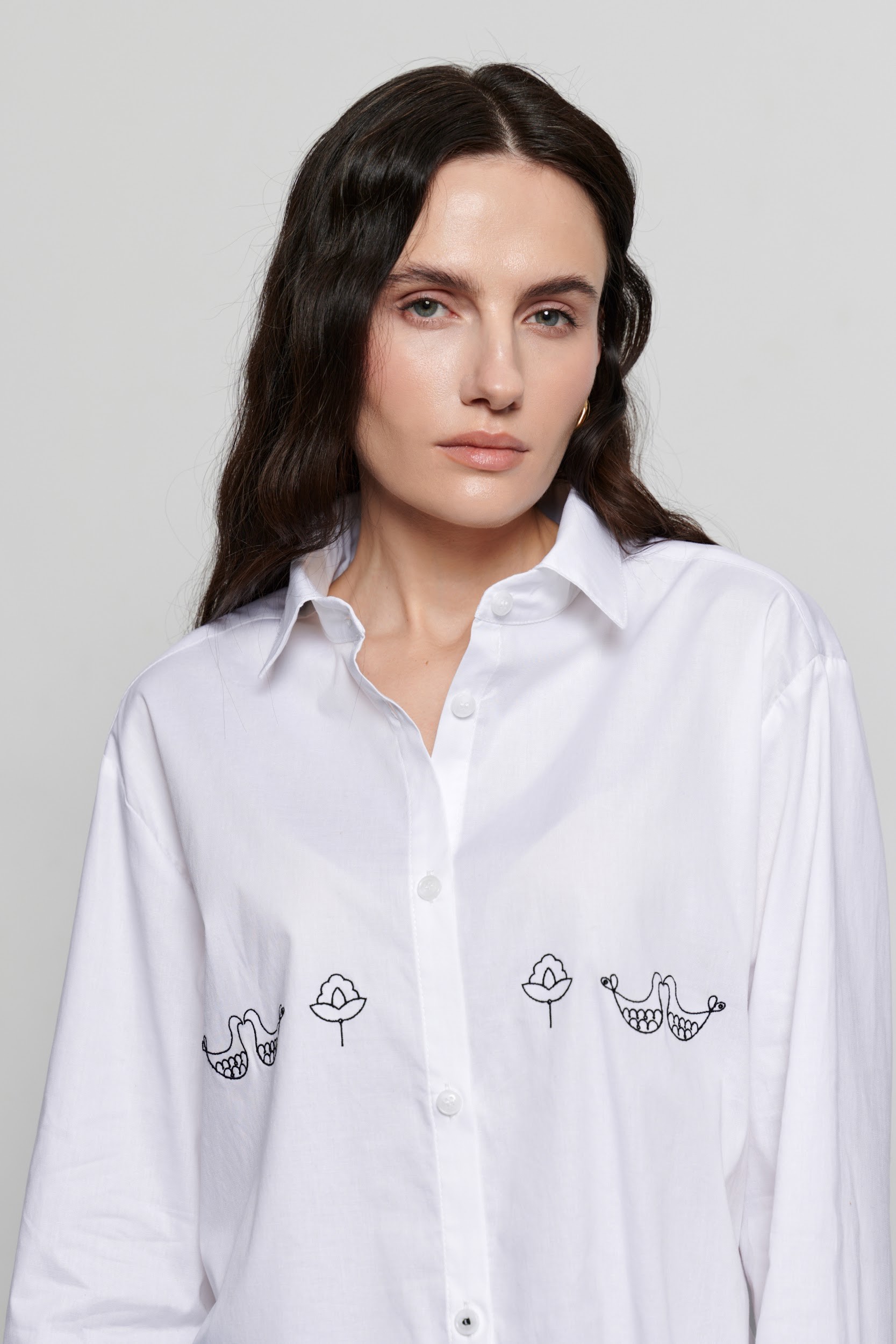 Стриманий силует білої сорочки поєднується з вишивкою натхненою мотивами Опішнянської кераміки. Графічна вишивка зображує стилізовані квіти та птахів, що символізують гармонію та відродження. Сорочка має вільний крій, класичний комір та застібку на ѓудзики, що робить її універсальним елементом як офісного, так і кежуал гардеробу.