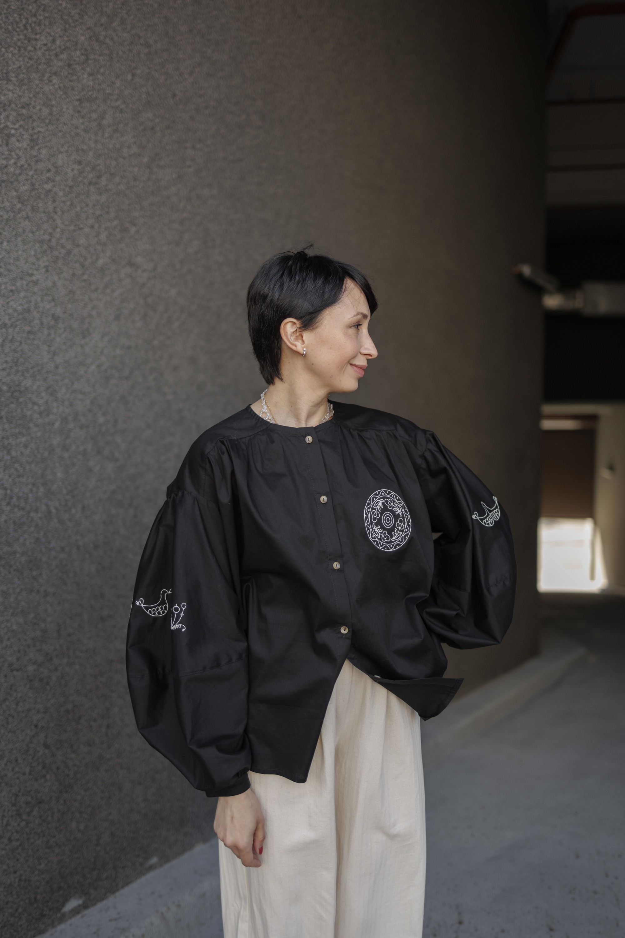 З орнаментом бежевого кольору, виконаним за мотивами Опішнянської кераміки, який відображає автентичні деталі: кругла композиція з квітами на грудях, птахи як символи миру та гармонії на рукавах, а також витончені рослинні елементи, що додають природньої легкості.