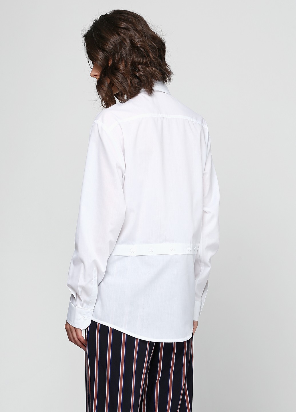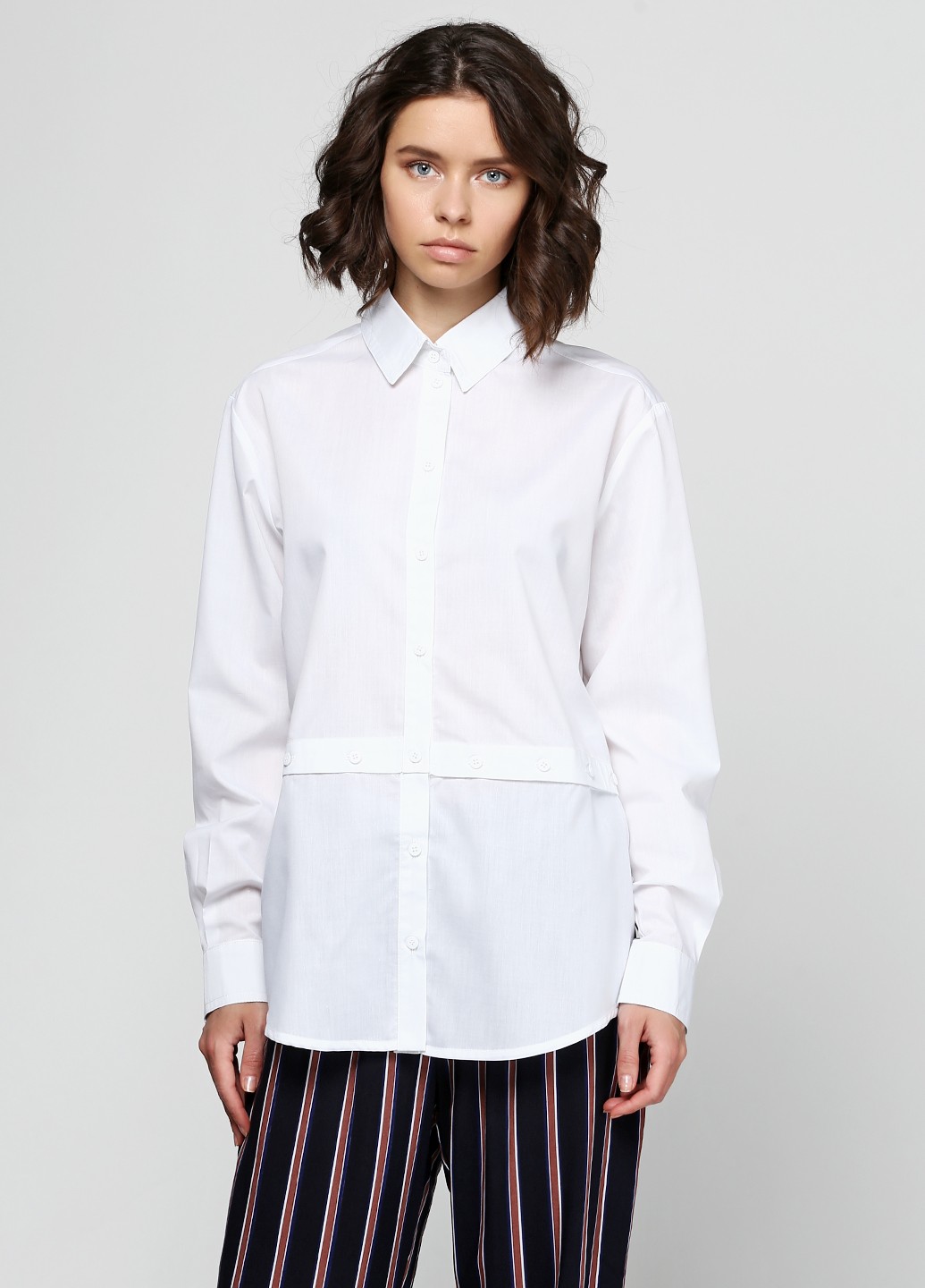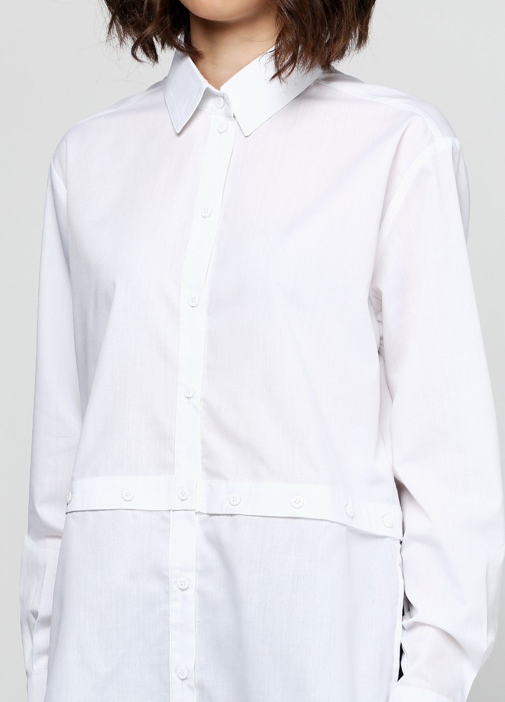 Біла бавовняна сорочка оверсайз з низом, що відстібається. Рукав довгий на манжеті на гудзику. Комір стояче-відкладний, класичний на гудзику. Полиці декоровані горизонтальною планкою на ґудзиках.