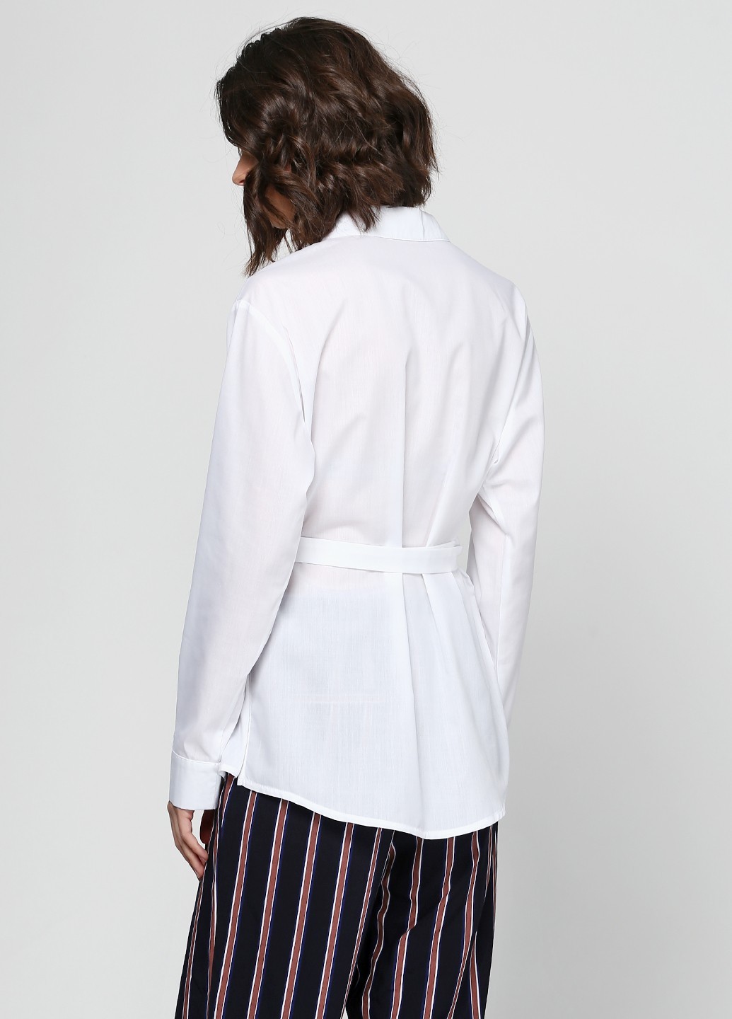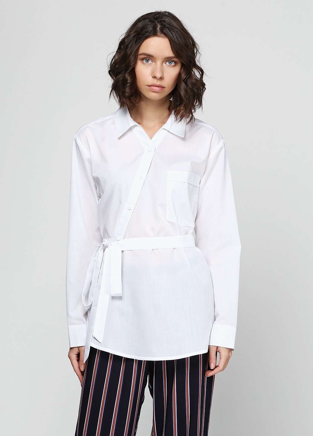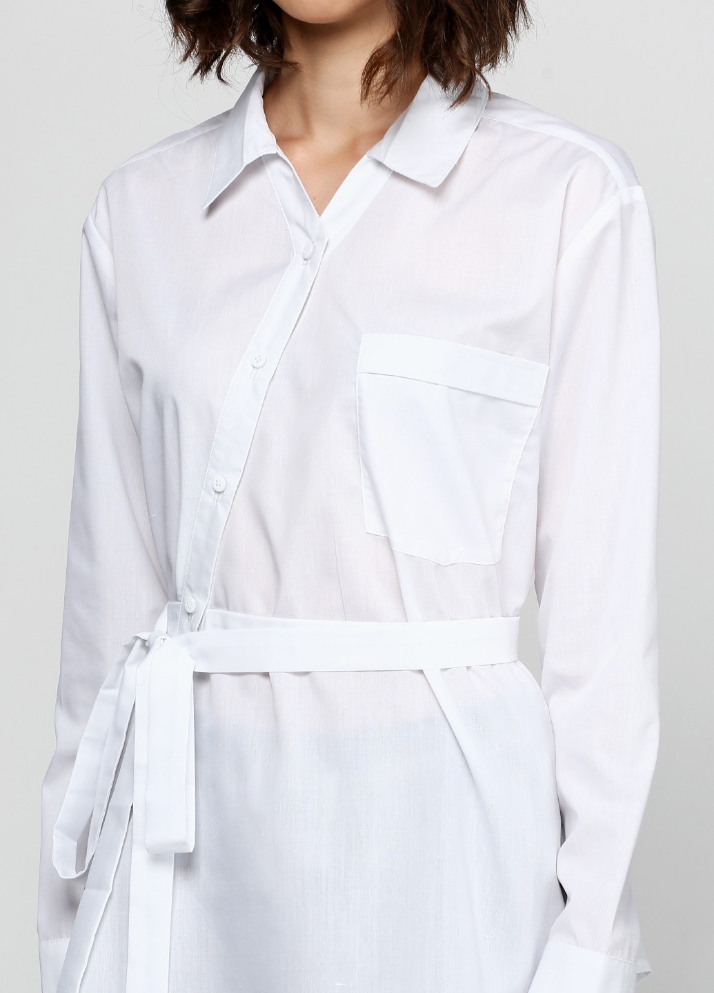 Біла бавовняна сорочка оверсайз з діагональною планкою з гудзиками під пояс. Сорочка прямого силуету. Накладна кишеня на лівій поличці. Рукав довгий на манжеті на гудзику. Комір відкладний.