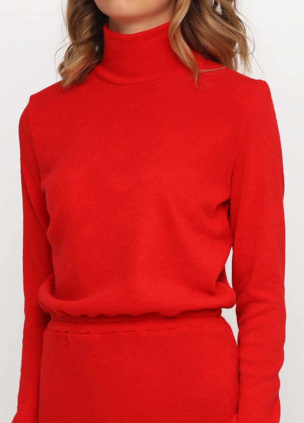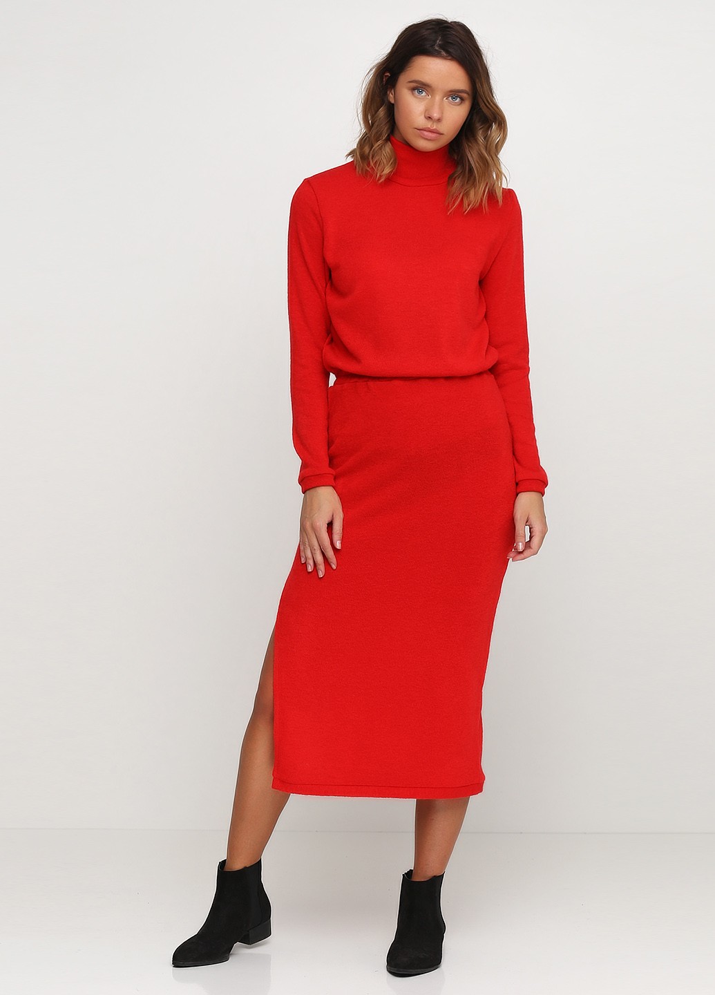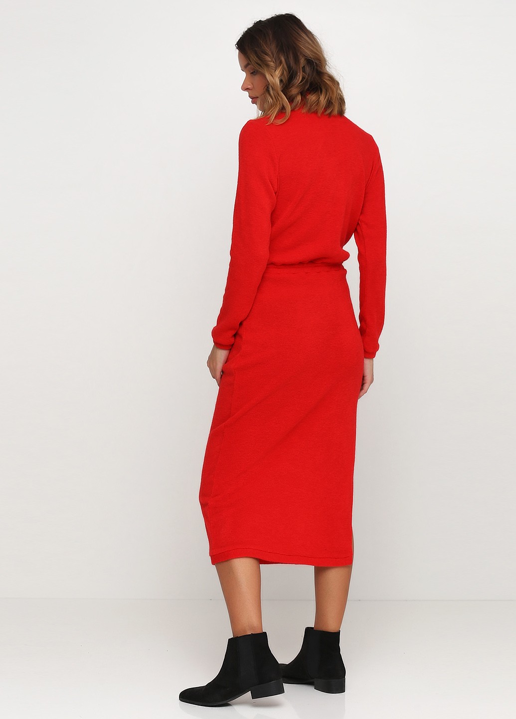 Ангоровое платье-карандаш красного цвета с резинкой на поясе, с длинным втачным рукавом на тонком манжете, низ юбки на тонком манжете, с левой стороны разрез.