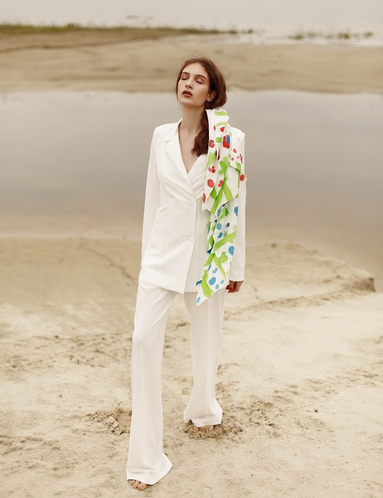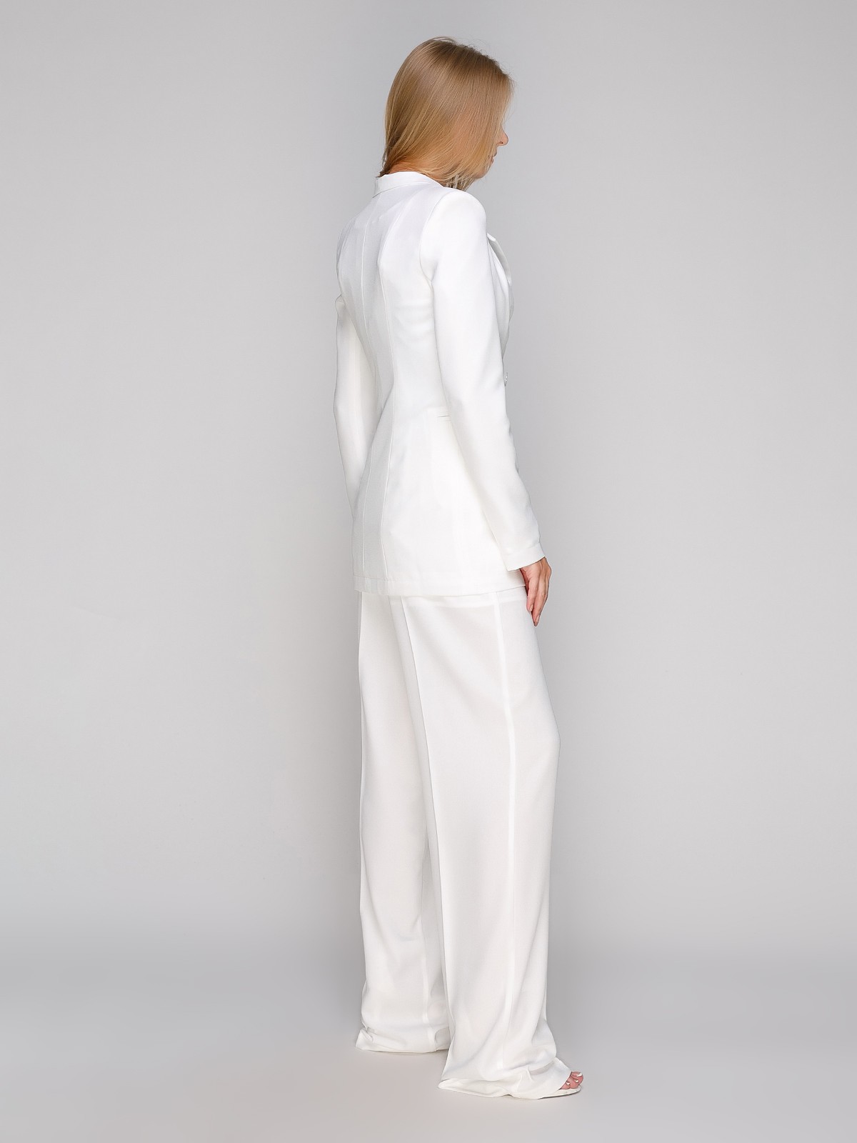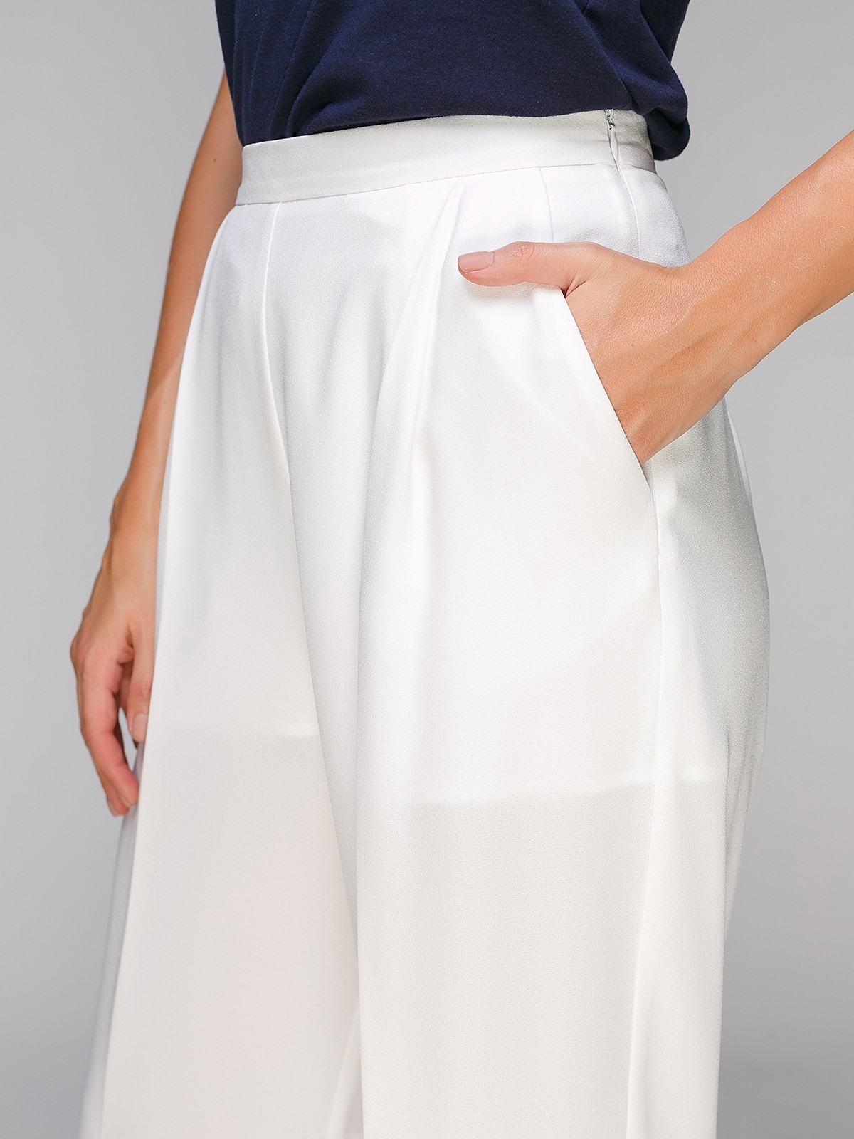 Білі штани палаццо, з пропрасованими стрілками, в бічних швах кишені, в бічному шві замок блискавка. Бавовняна підкладка у вигляді шортиків.