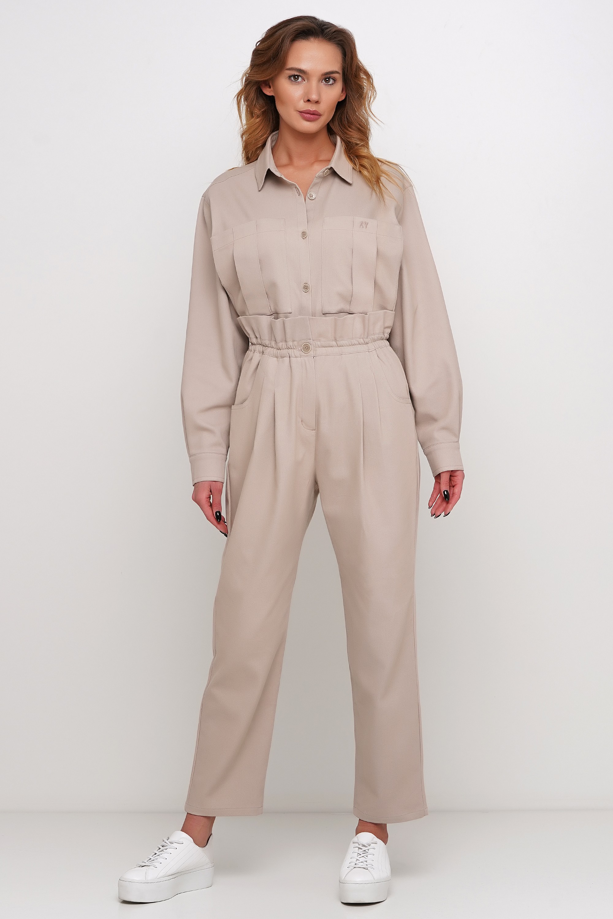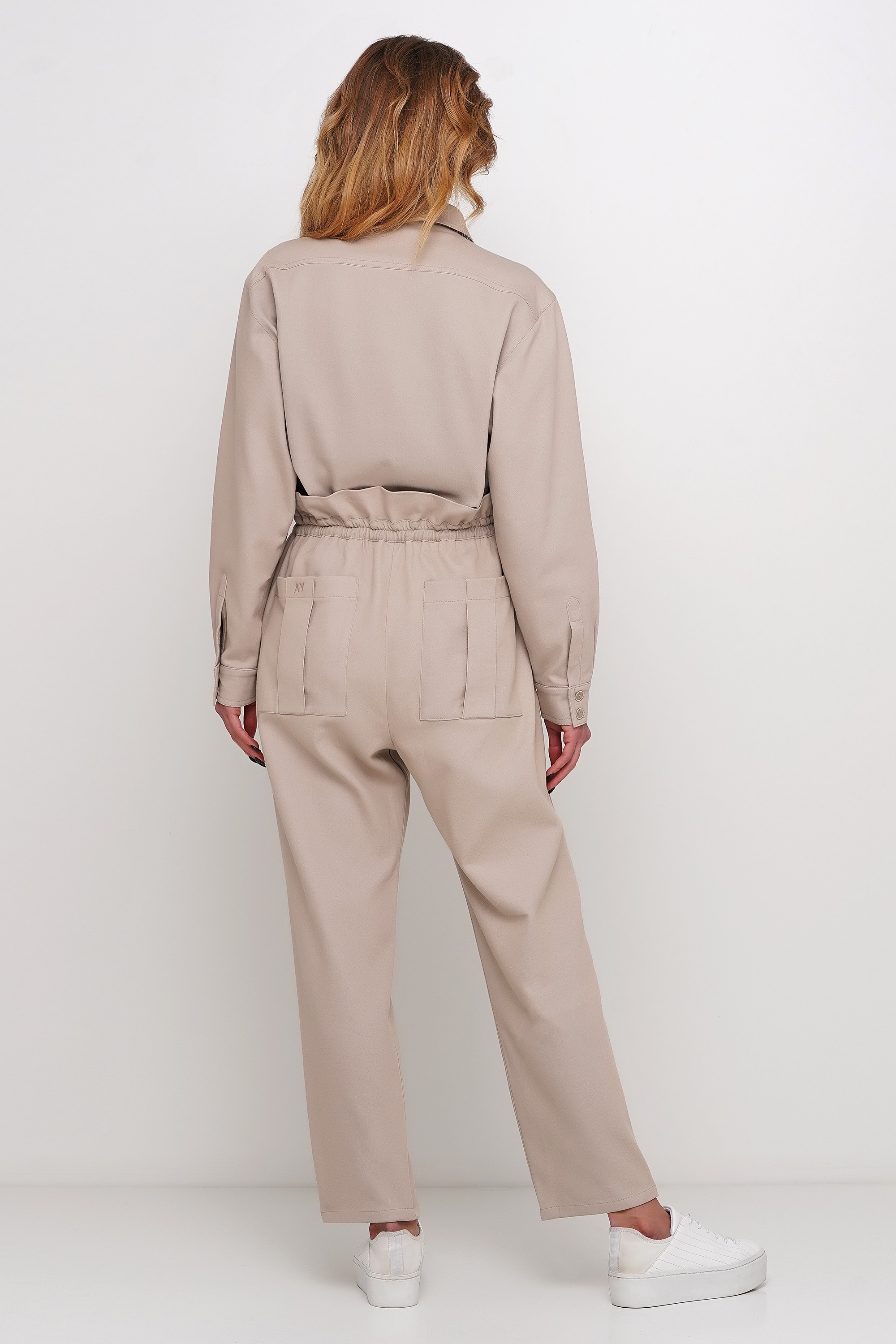 Бежевые широкие джинсы зауженные к низу. С застёжкой молния под резинку, пояс с рюшей. По переду две склады, карманы закруглённой формы. По спинке накладные карманы.