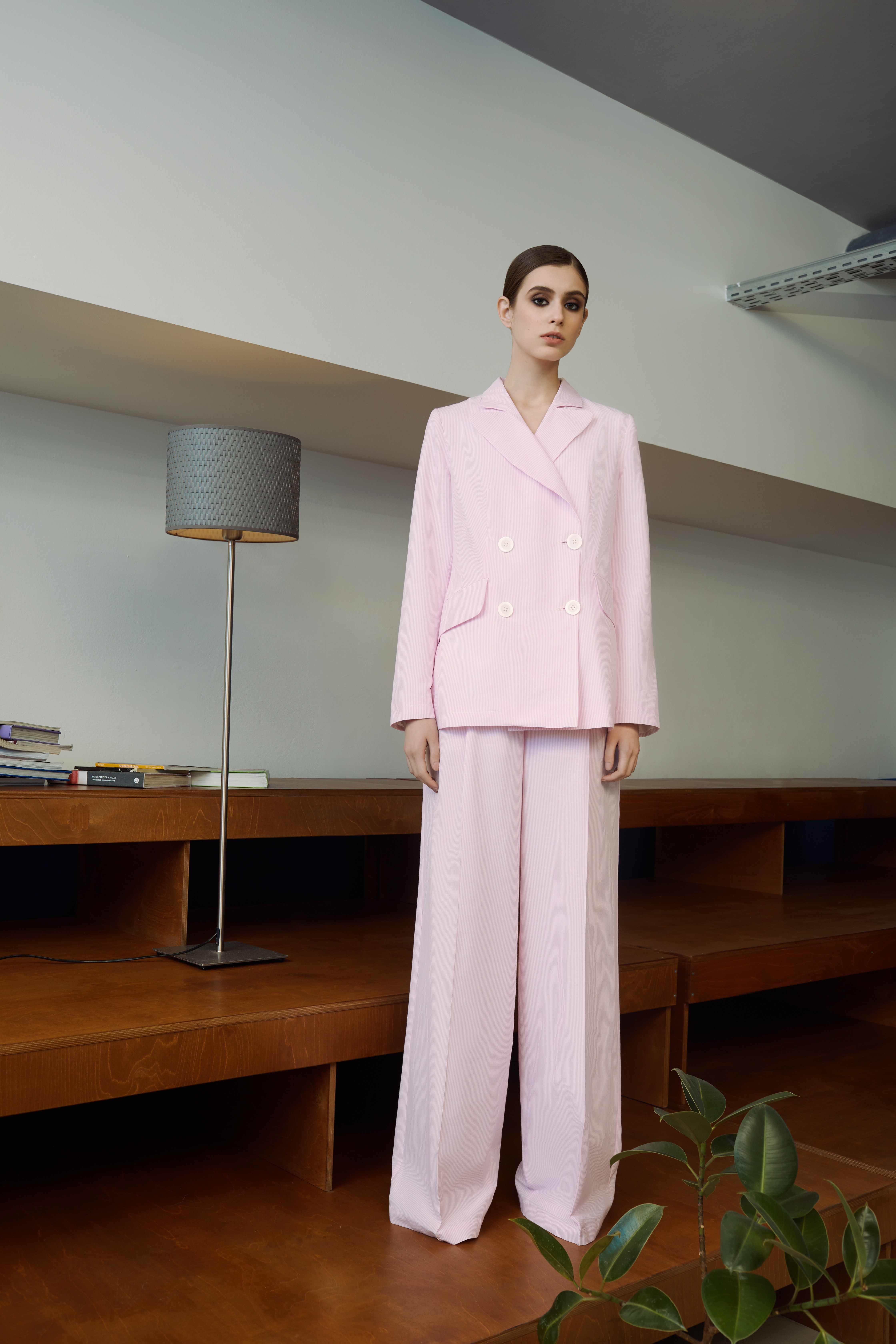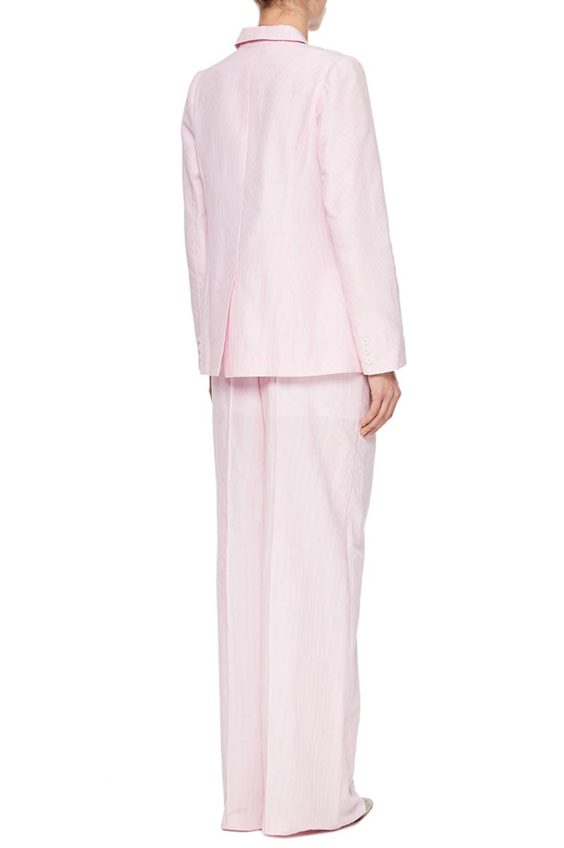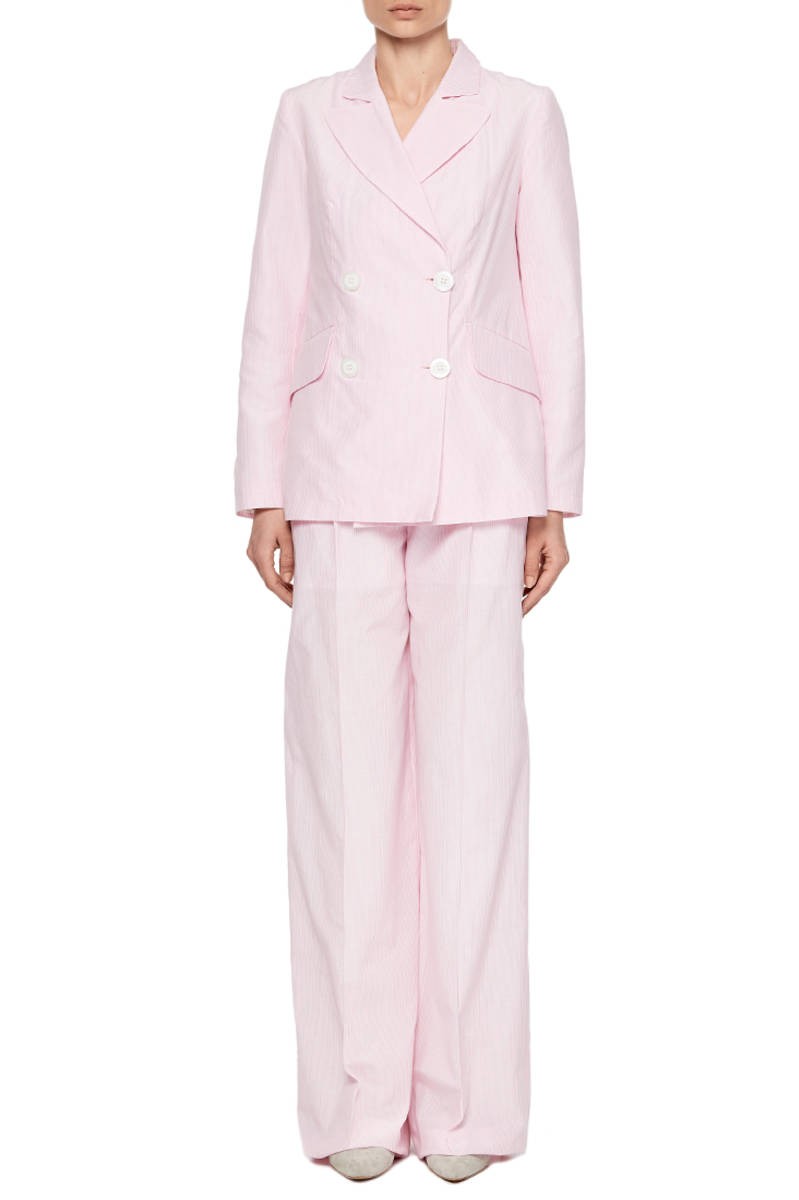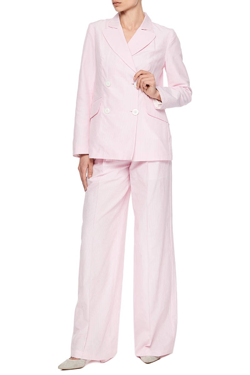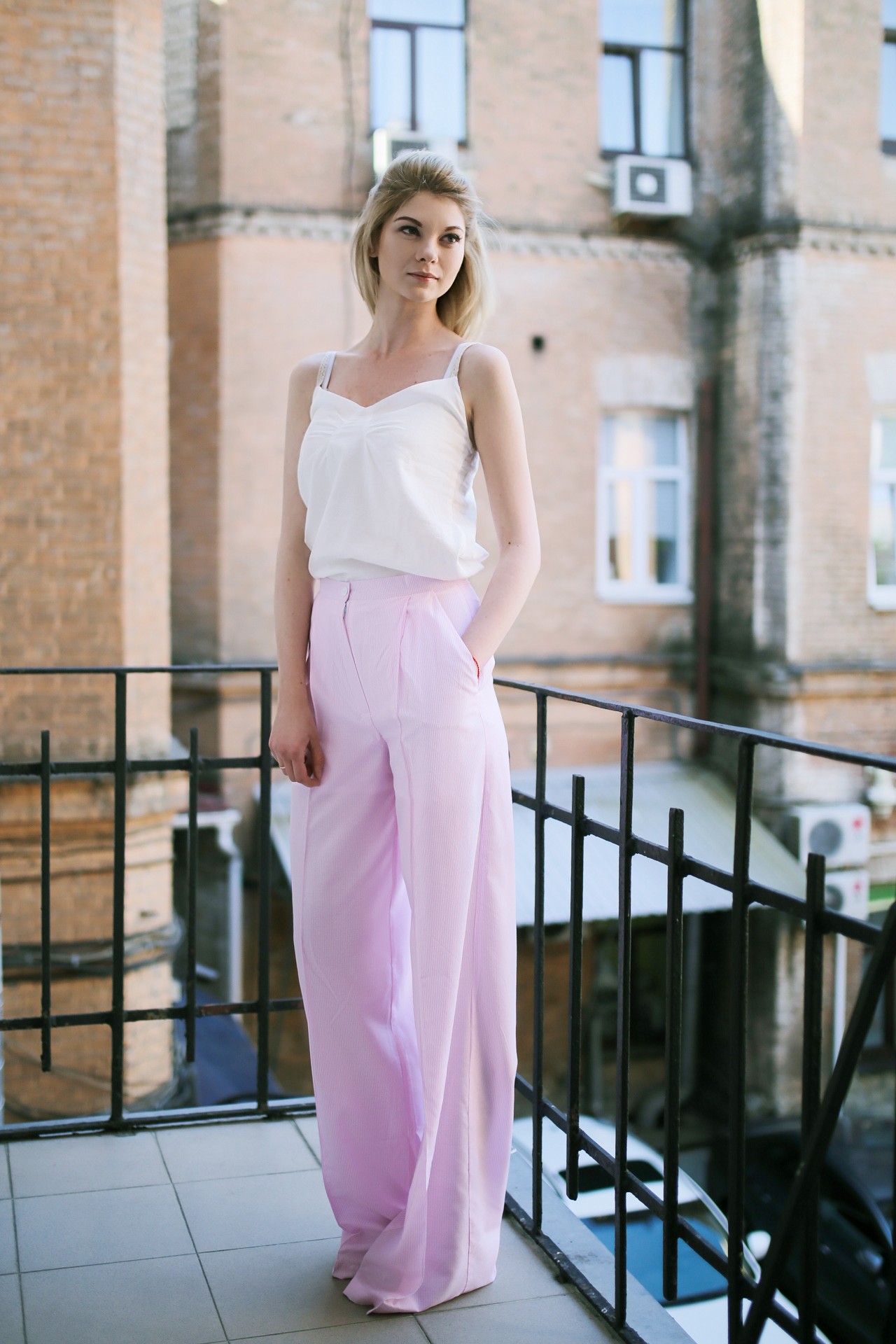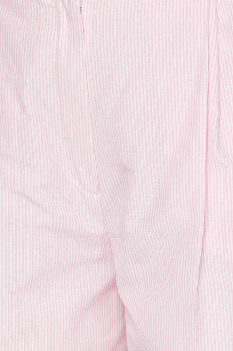 Хлопковые макси брюки на высокой талии клеш от бедра с простроченными стрелками. В розово-белую тонкую полосу. Внутри подклада из тонкого хлопка в виде шорт.