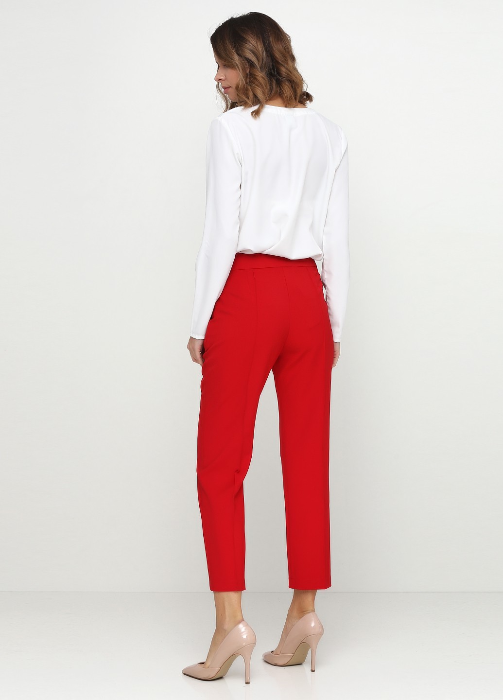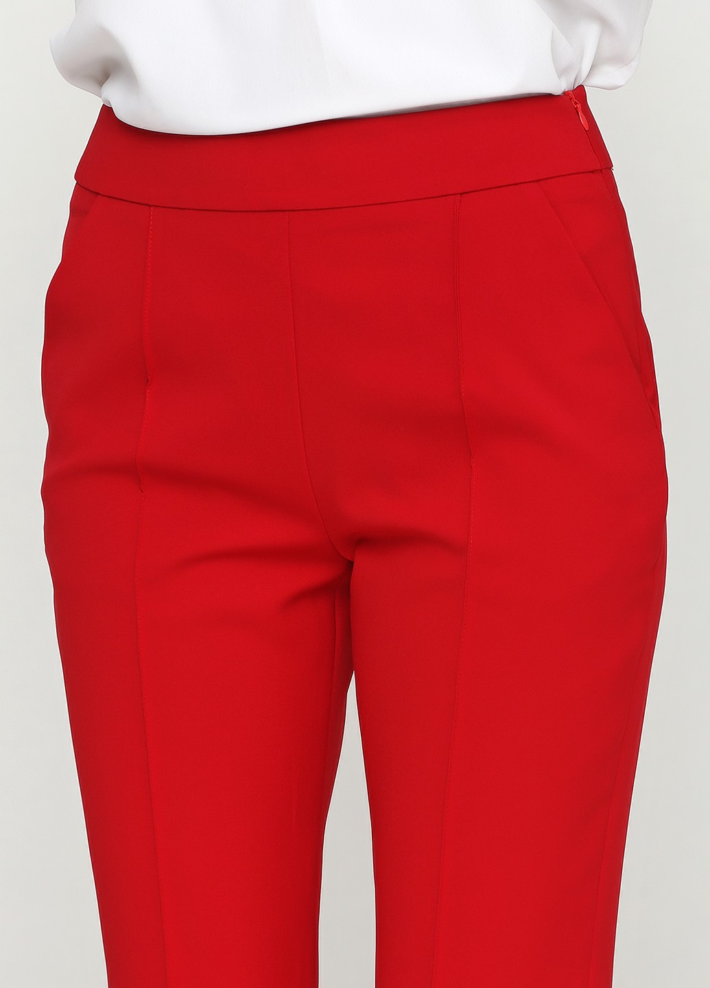 Укороченные зауженые брюки из костюмной ткани красного цвета, с прошитыми стрелками, в боковом шве молния. Универсальные в носке, как в классическом стиле так и в повседневной жизни. Как с жакетом или рубашкой и с лодочками, так и с белой футболкой и кроссовками. Базовая деталь гардероба.