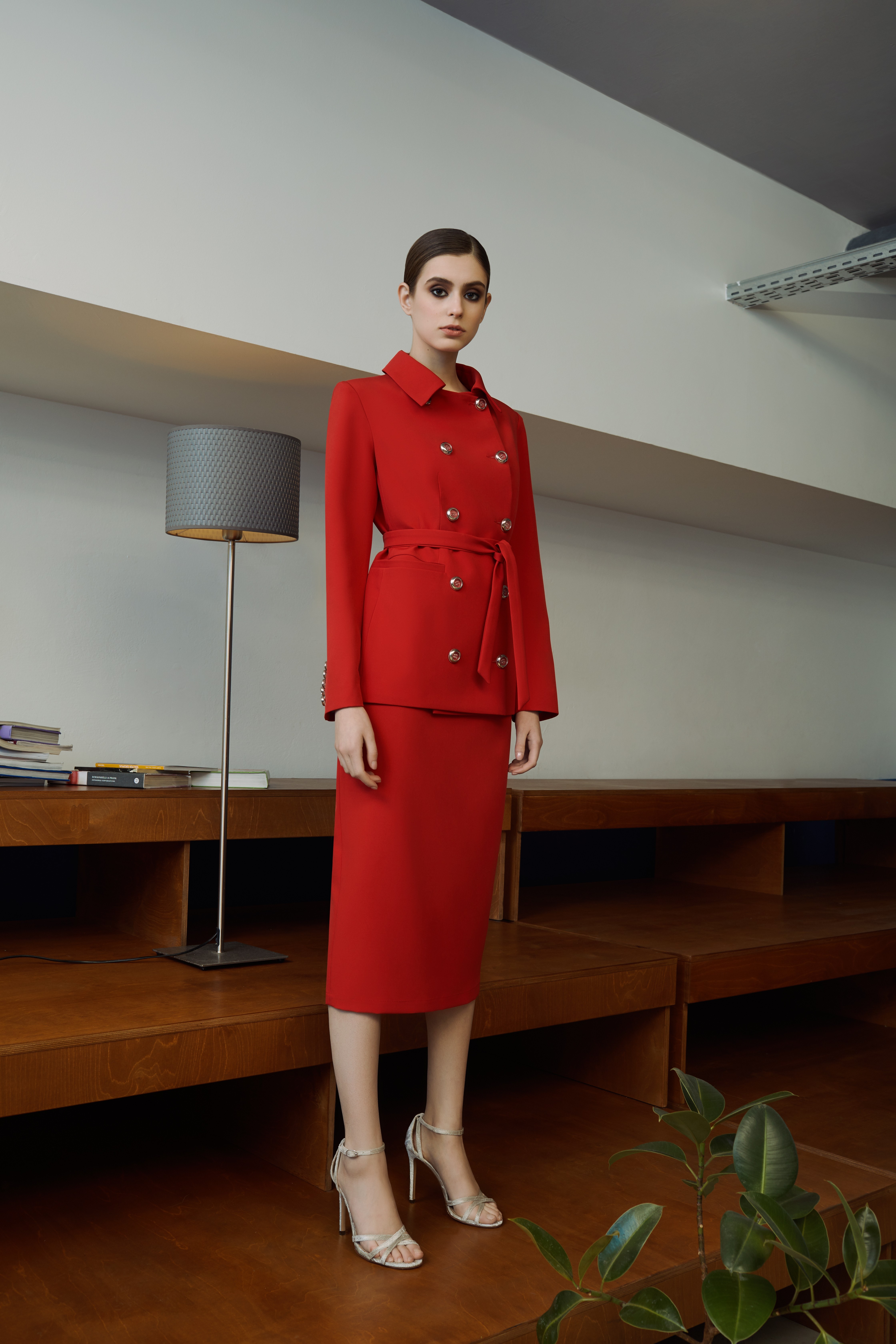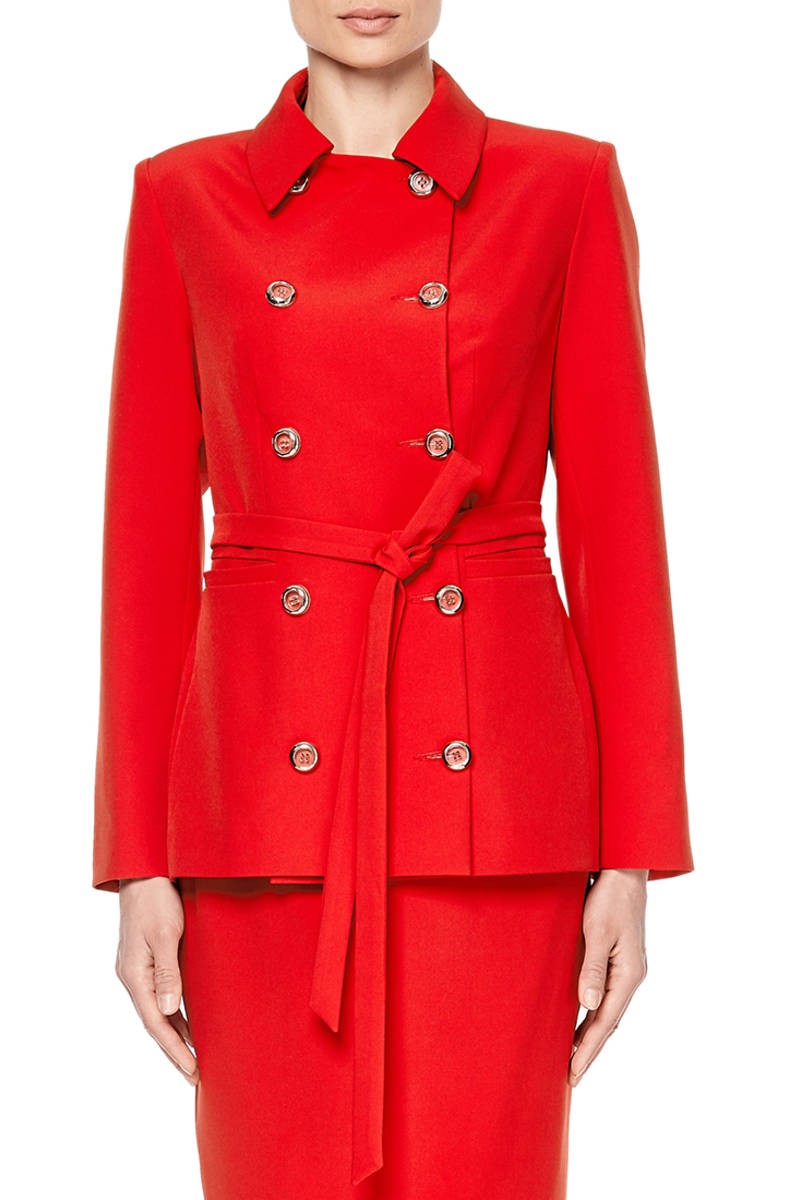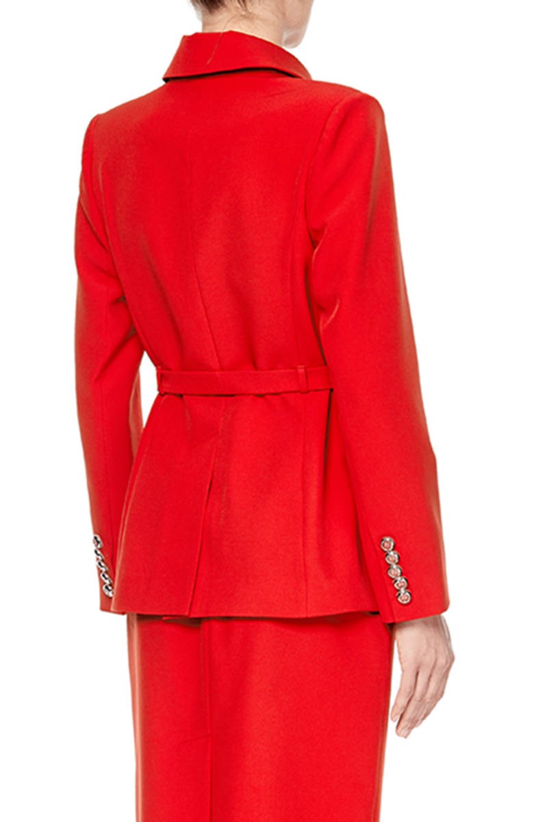 Двубортный жакет приталенного силуэта под пояс и врезными горизонтальными карманами – это роскошная модель из костюмной ткани насыщенного красного цвета, которая хорошо вписывается в офисный и casual стиль, отлично сочетается с коктейльными и вечерними платьями. Насыщенный цвет, облегающий силуэт и пояс отлично подчеркивают достоинства фигуры. Жакет можно сочетать с юбкой-карандаш и классическими брюками из такой же ткани или создавать различные образы с другими по цвету и стилю брюками, платьями, юбками.
