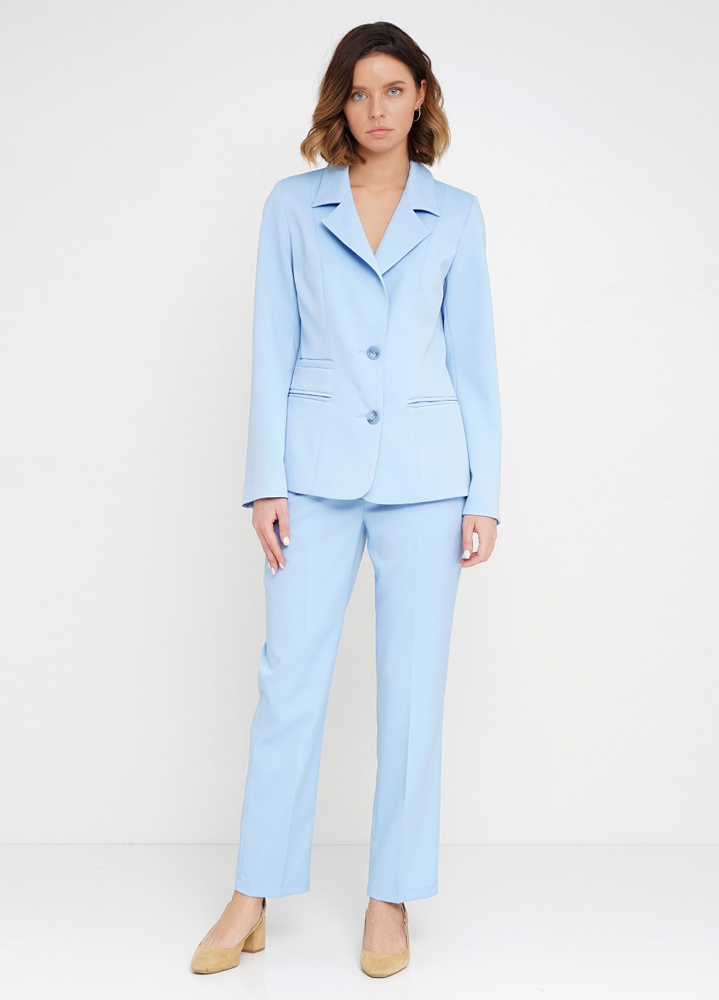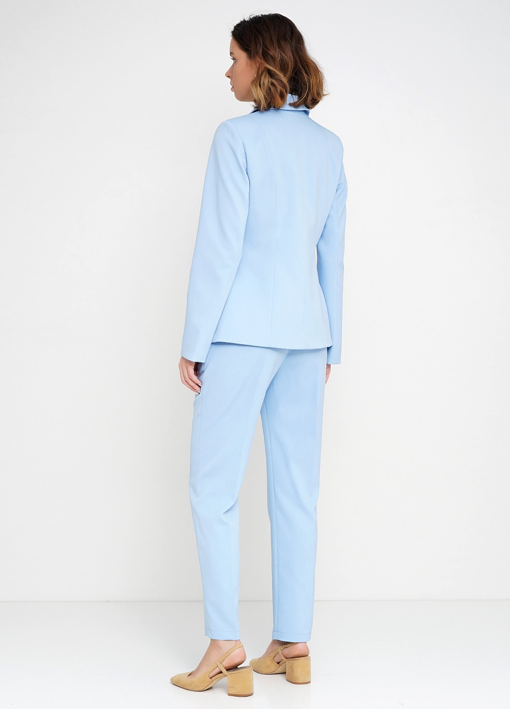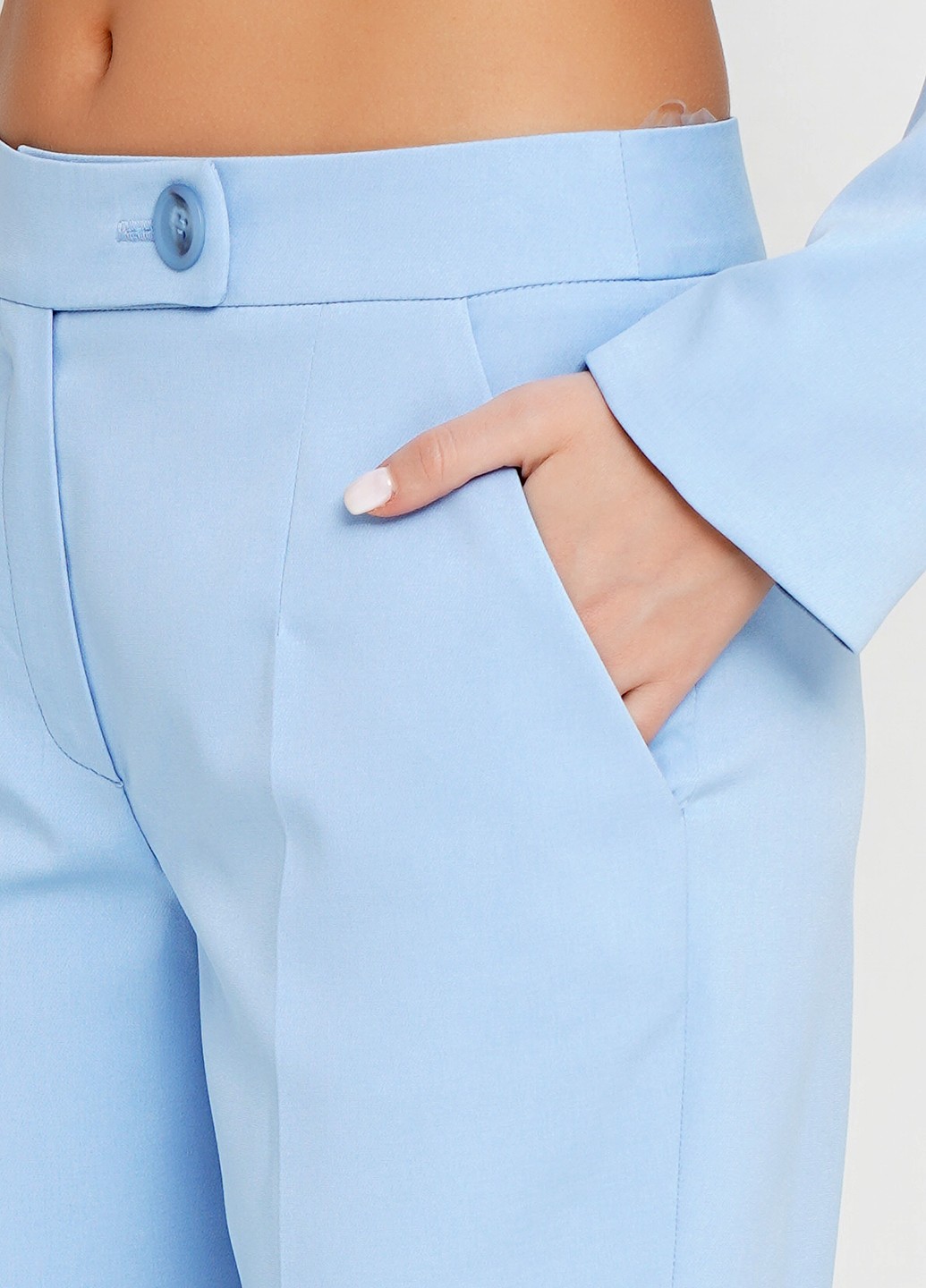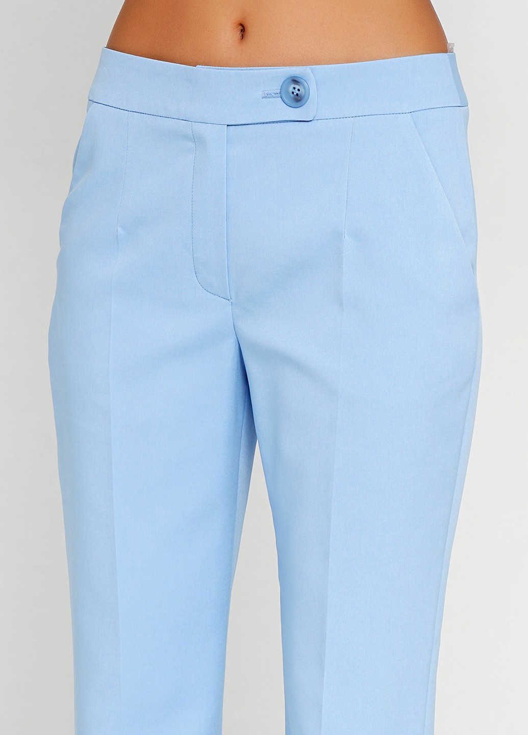 Укороченные зауженые брюки из костюмной ткани голубого цвета, с заутюженными стрелками. Пояс подкройной, по поясу цельнокройный пат, замок молния с гульфиком, корманы косые. Универсальные в носке, как в классическом стиле так и в повседневной жизни. Как с жакетом или рубашкой и с лодочками, так и с белой футболкой и кроссовками.