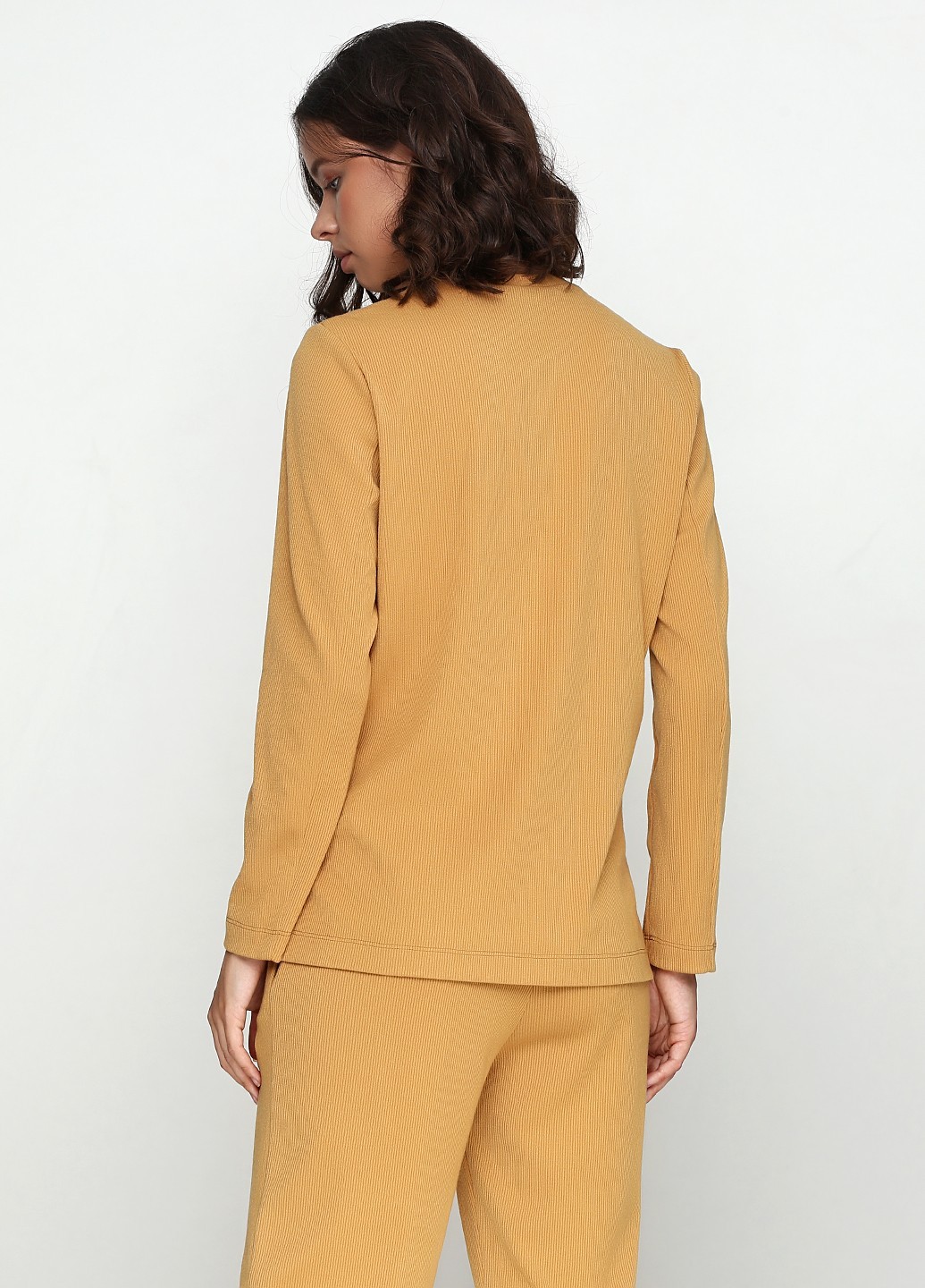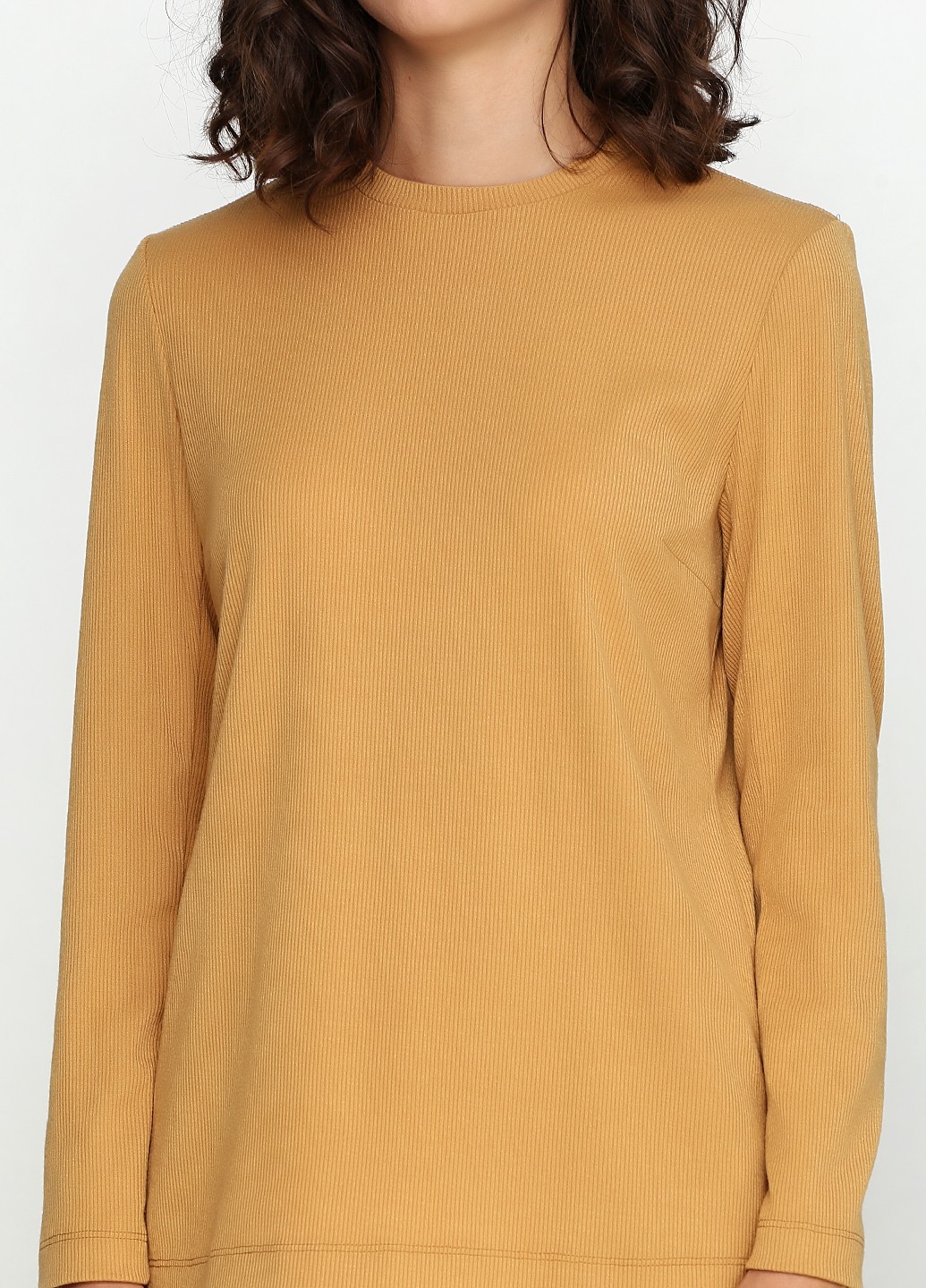Удлиненный трикотажный свитер горчичного цвета, прямого силуэта с круглым вырезом, длинным втачным рукавом, разрезами по бокам.