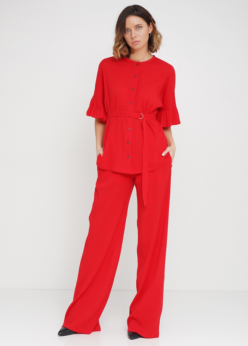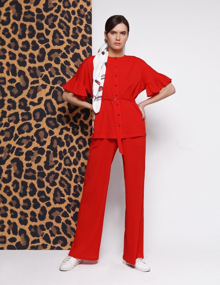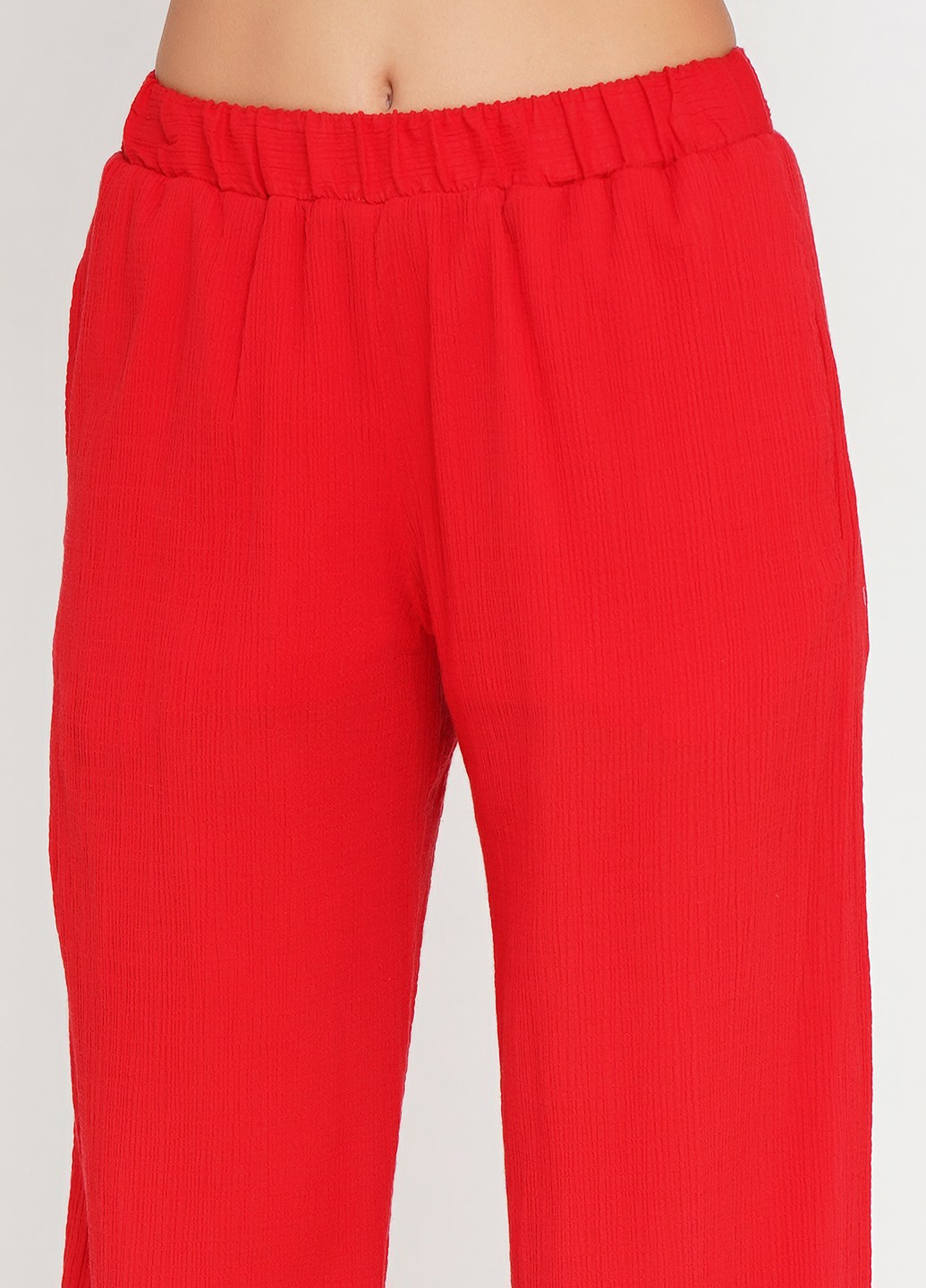 Хлопковые прямые макси брюки красного цвета с подкройным поясом на резинке,с карманами в боковом шве.