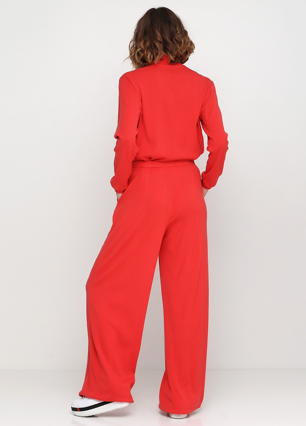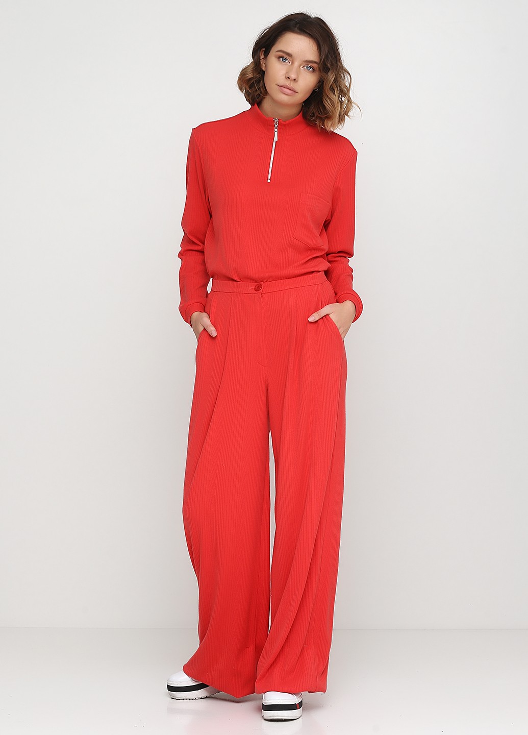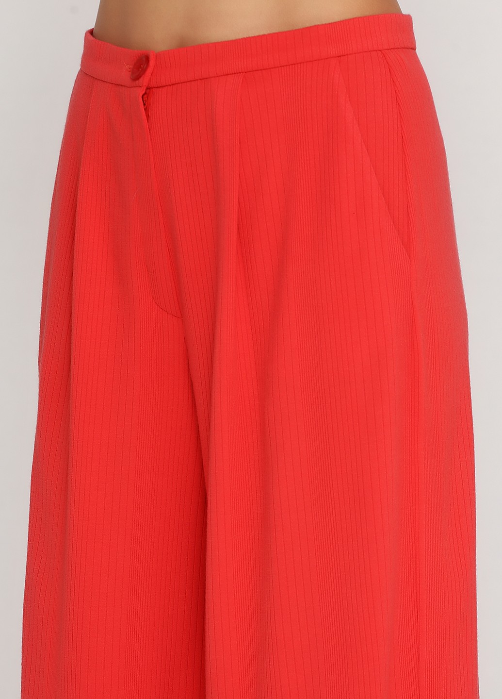 Трикотажные брюки кораллового цвета, свободного силуэта, с заложенными складами, замок молния с гульфиком, с косым боковыми карманами и подкройным поясом.