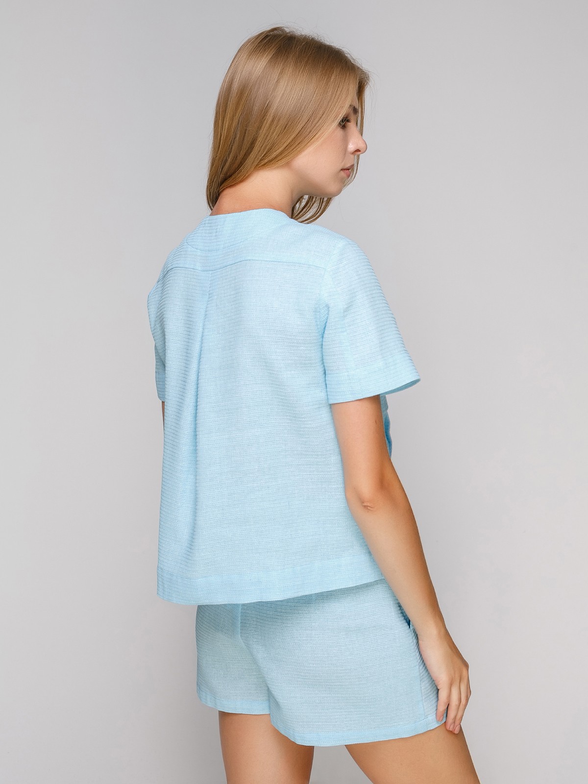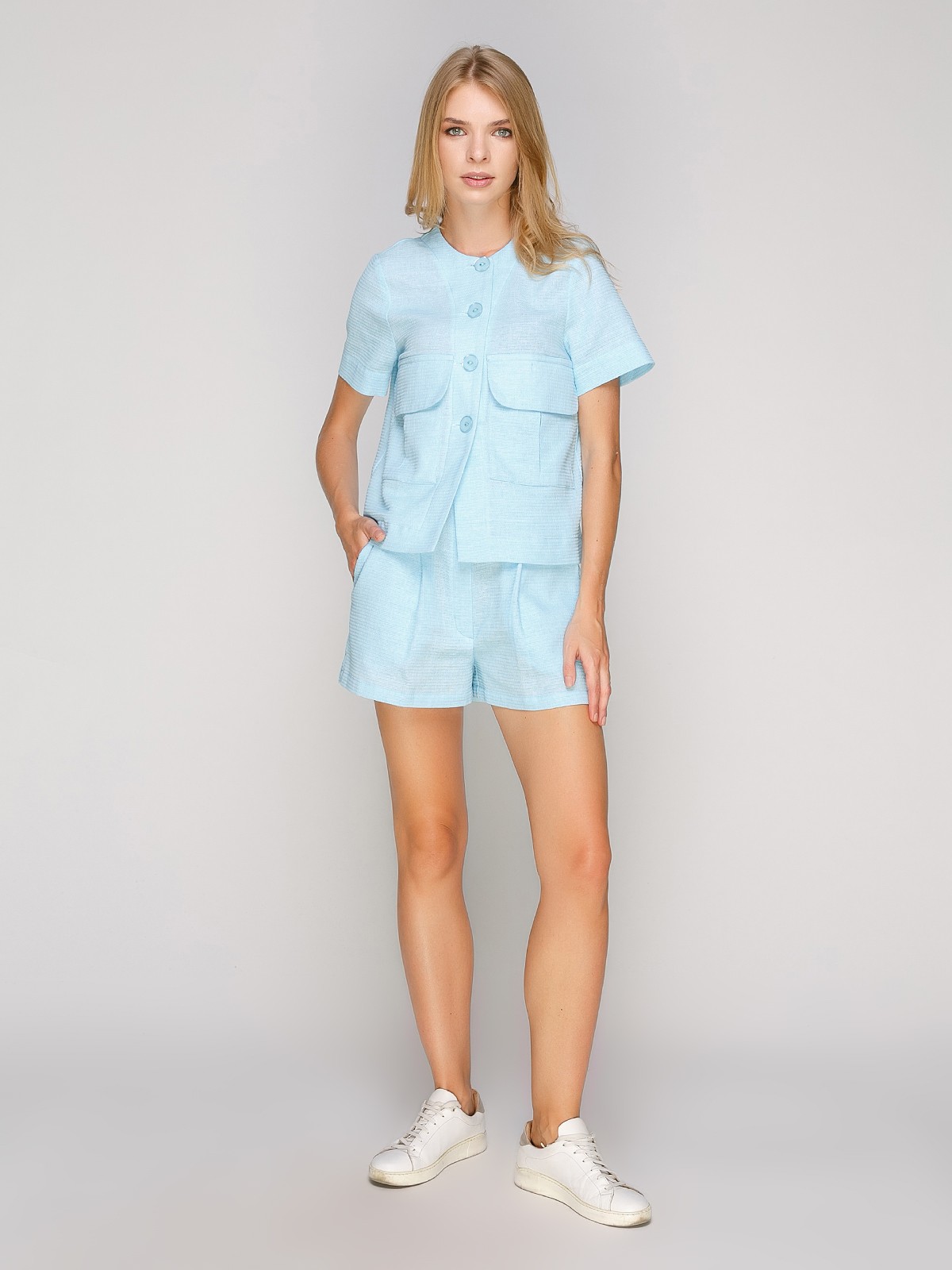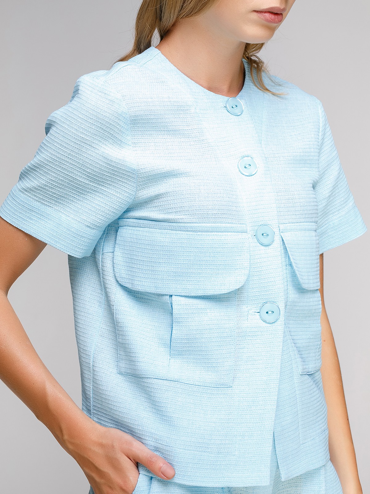 Короткая хлопковая блуза-жакет в небесно голубом цвете, с коротким рукавом и накладными карманами на груди. Летняя блуза будет незаменима для жарких дней в офисе с брюками или юбкой карандаш, на тропическом острове сверх купальника или во время долгих прогулок по улочкам любимого города в комлекте с шортами. Натуральная ткань позволяет дышать нашей коже и приносит чувство комфорта.
