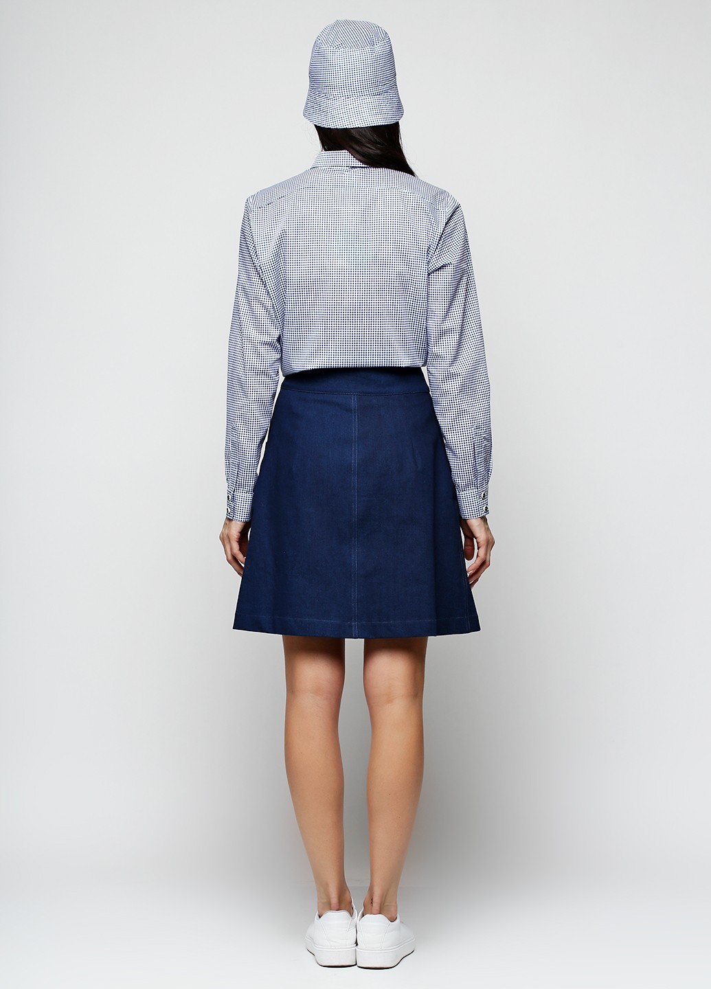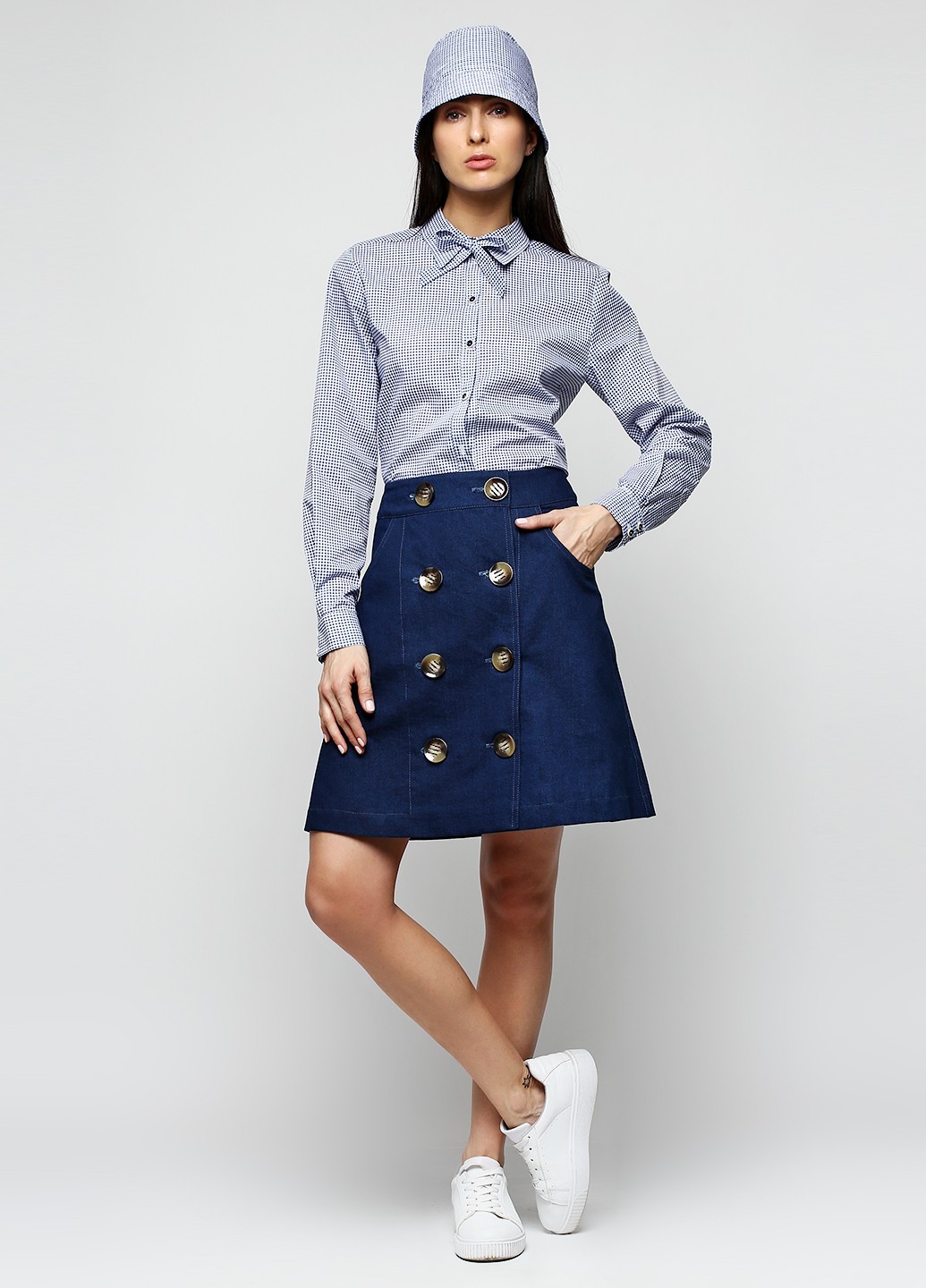Особенности: Короткая юбка на высокой талии. Силуэт трапеция, слегка расклешенная к низу. На запахе с двумя рядами пуговиц. 8 крупных пуговиц серо-бежевого цвета. Косые карманы по бокам.