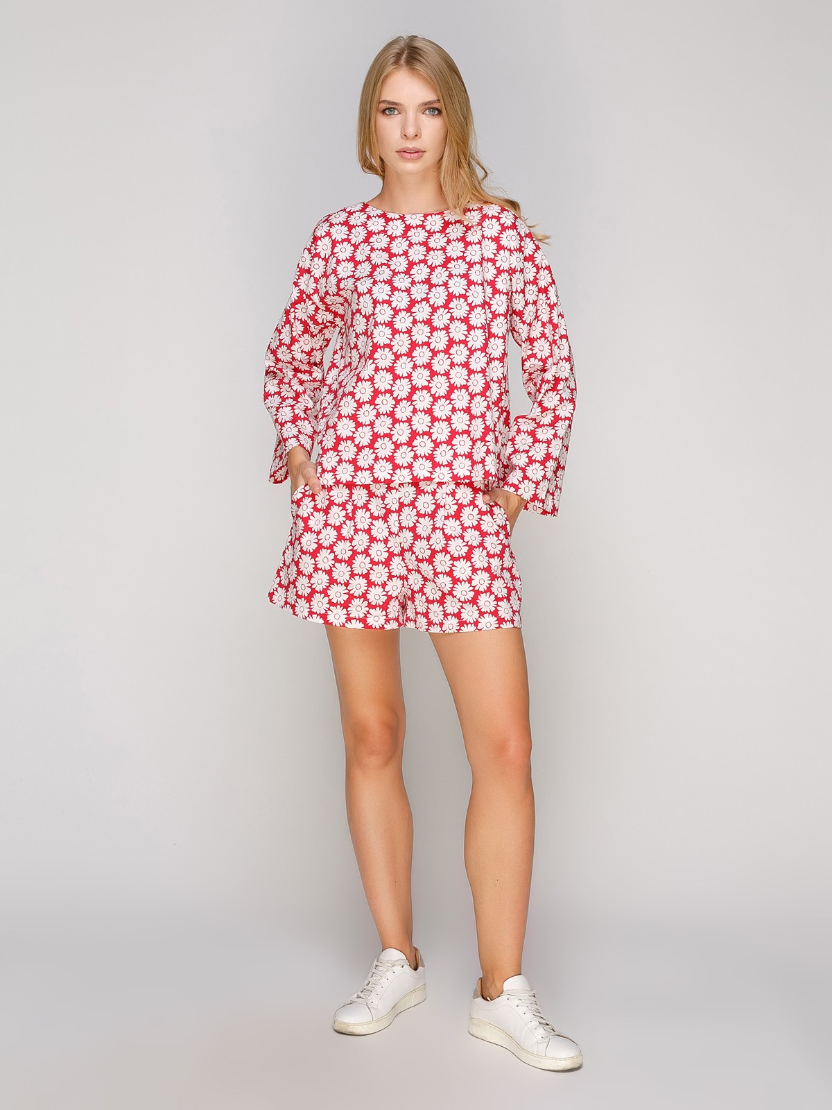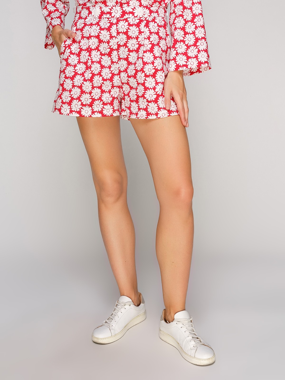 Короткие хлопковые шорты с ярким принтом на высокой посадке с замком молния, боковыми косыми карманами, и двумя складами впереди.