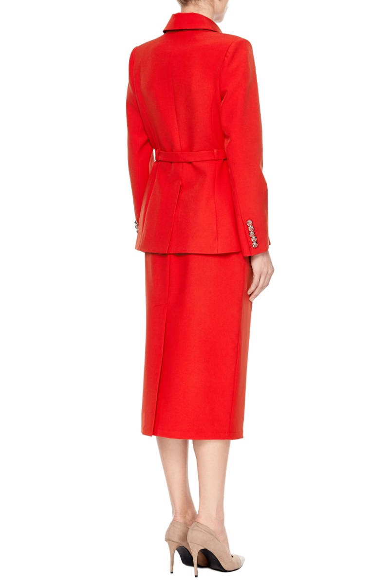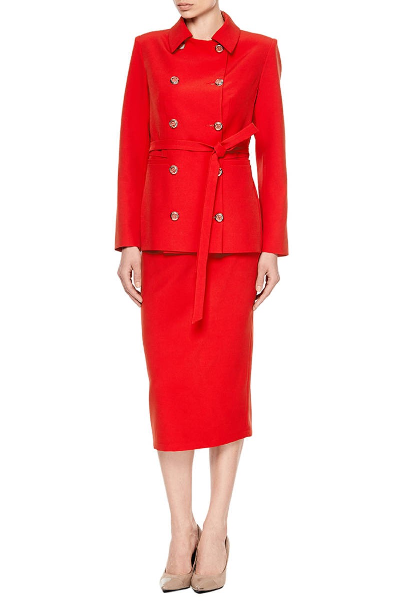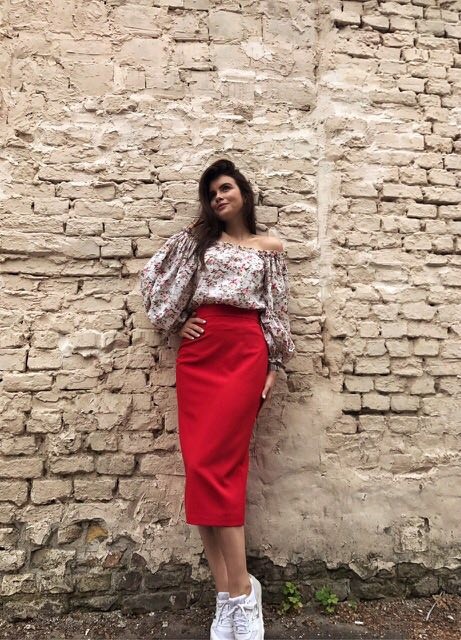Красная юбка-карандаш из костюмной ткани на высокой посадке по талии, замком молния сзади, на вискозной подкладке. Можно сочетать с жакетом и лодочками, базовой футболкой и кроссовками или же топом и босоножками.