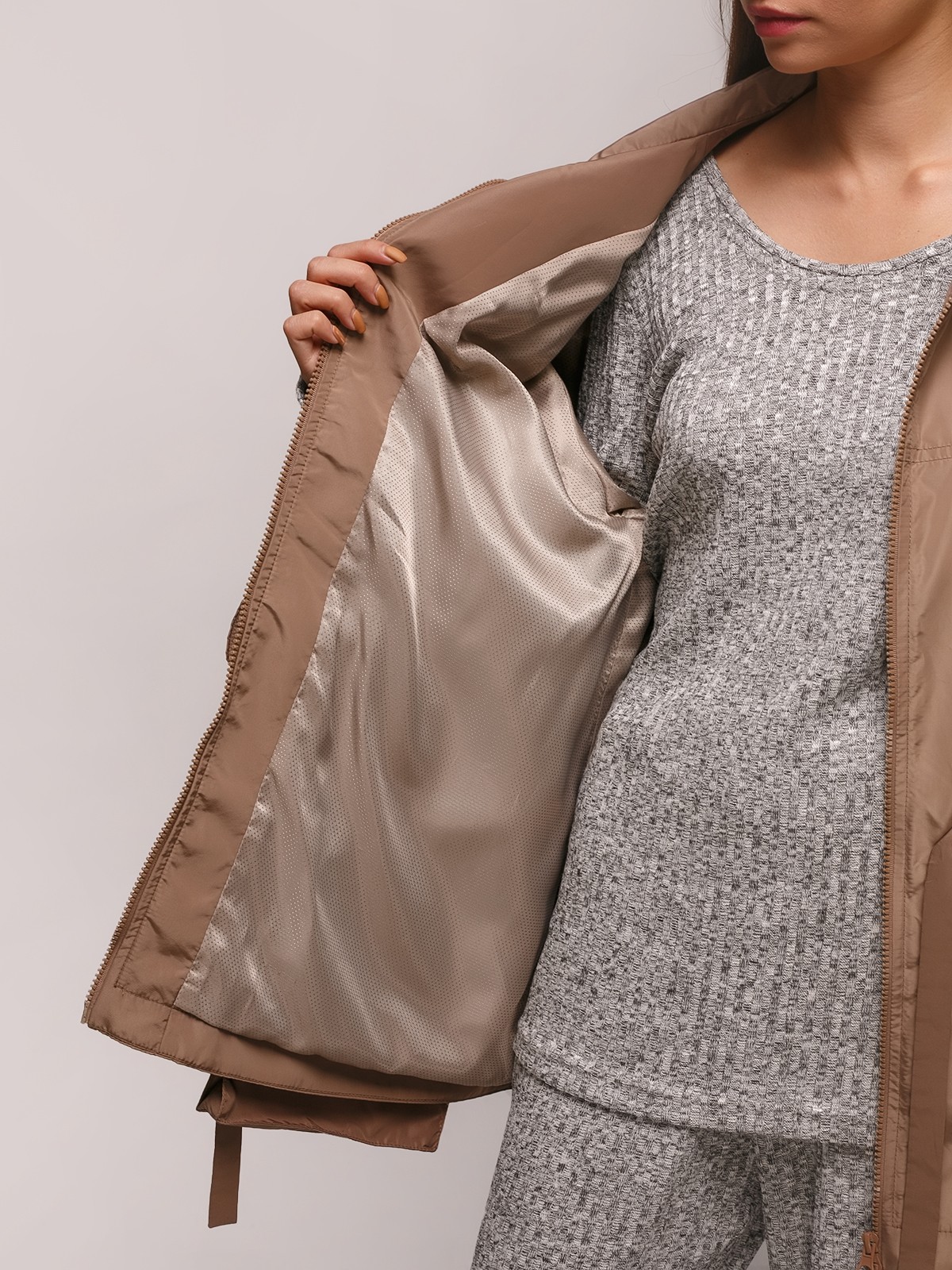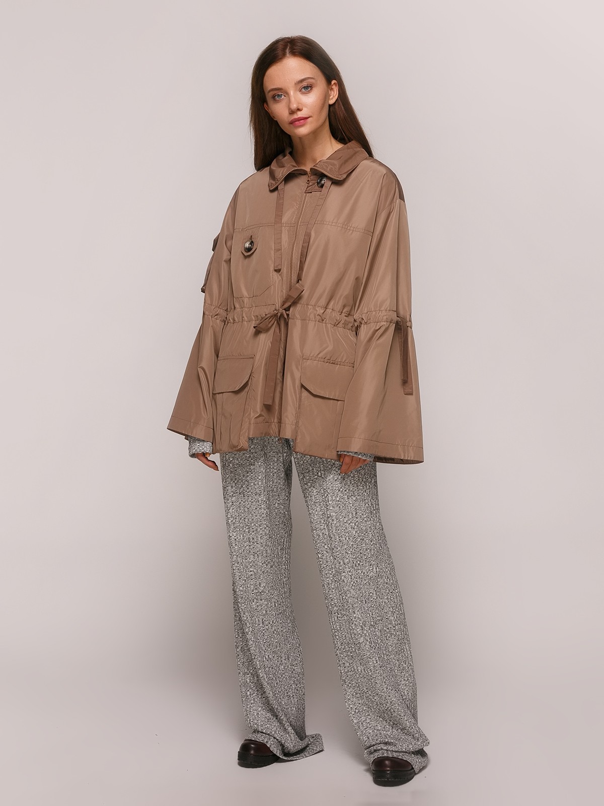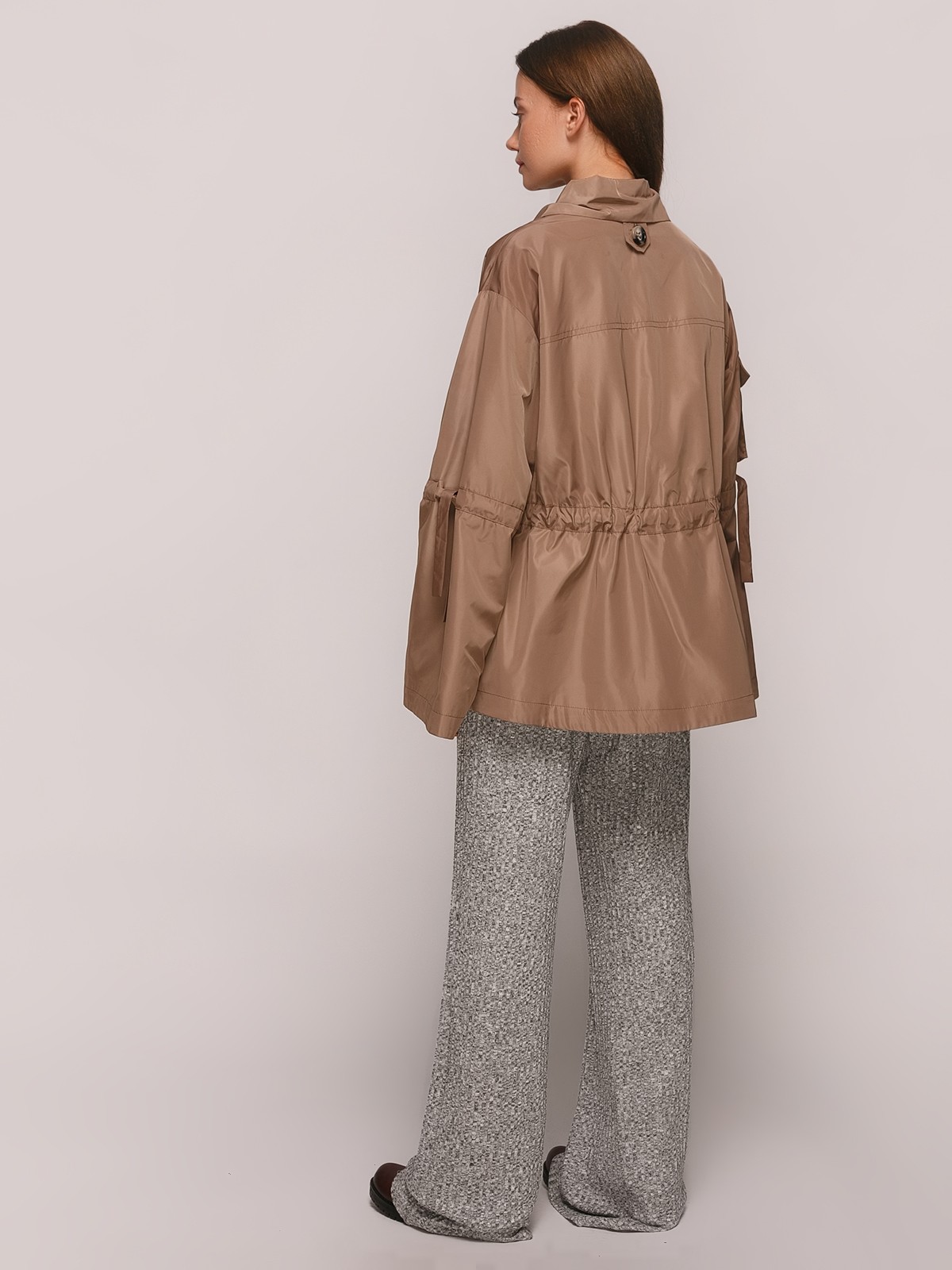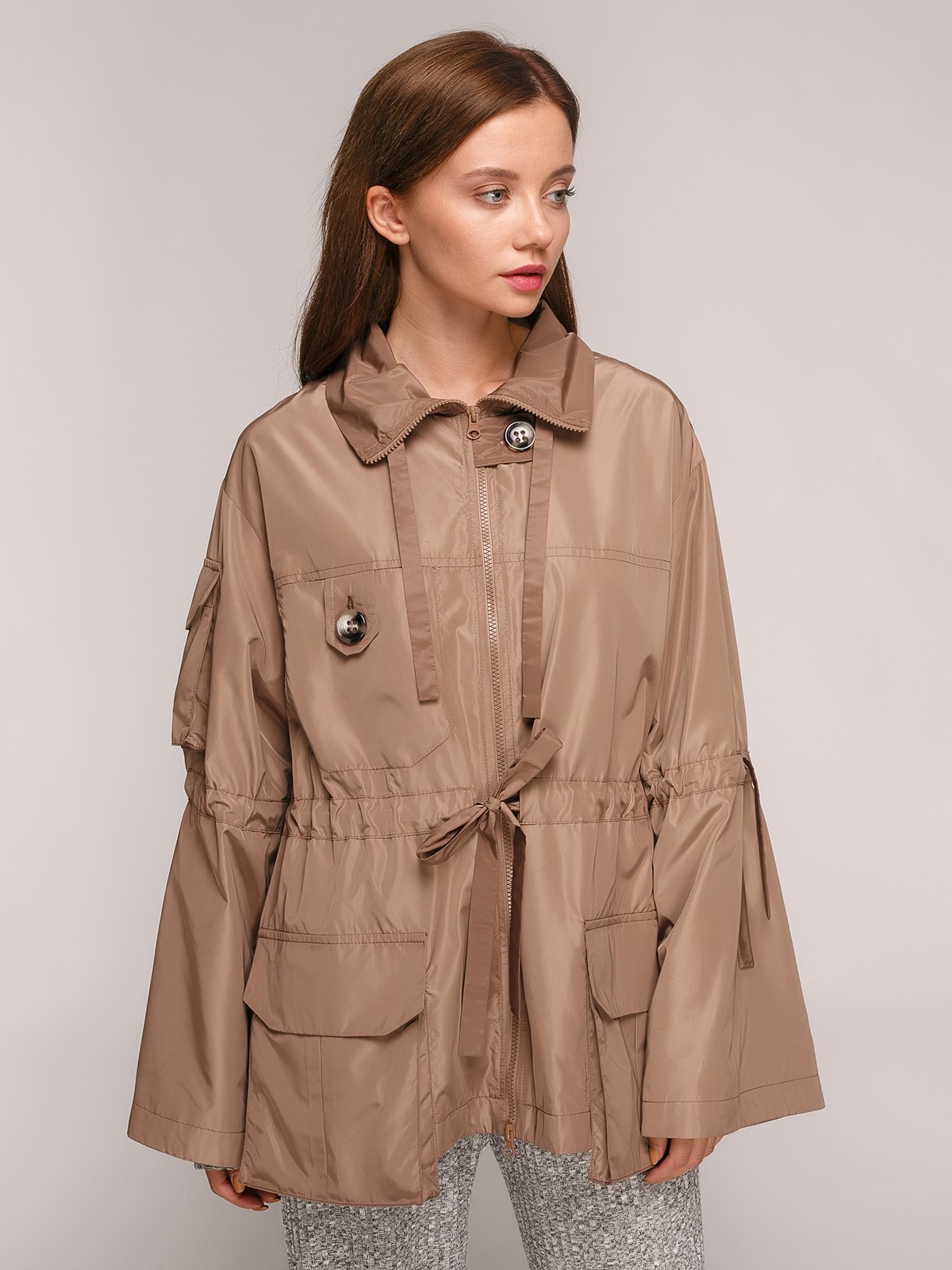 Легкая куртка до средины бедра, с кулиской на талии, квадратными накладными карманами, выступающими ниже изделия, воротником стойка с кулисой, с широким рукавом и кулисой ниже локтя.