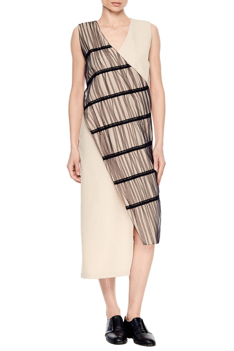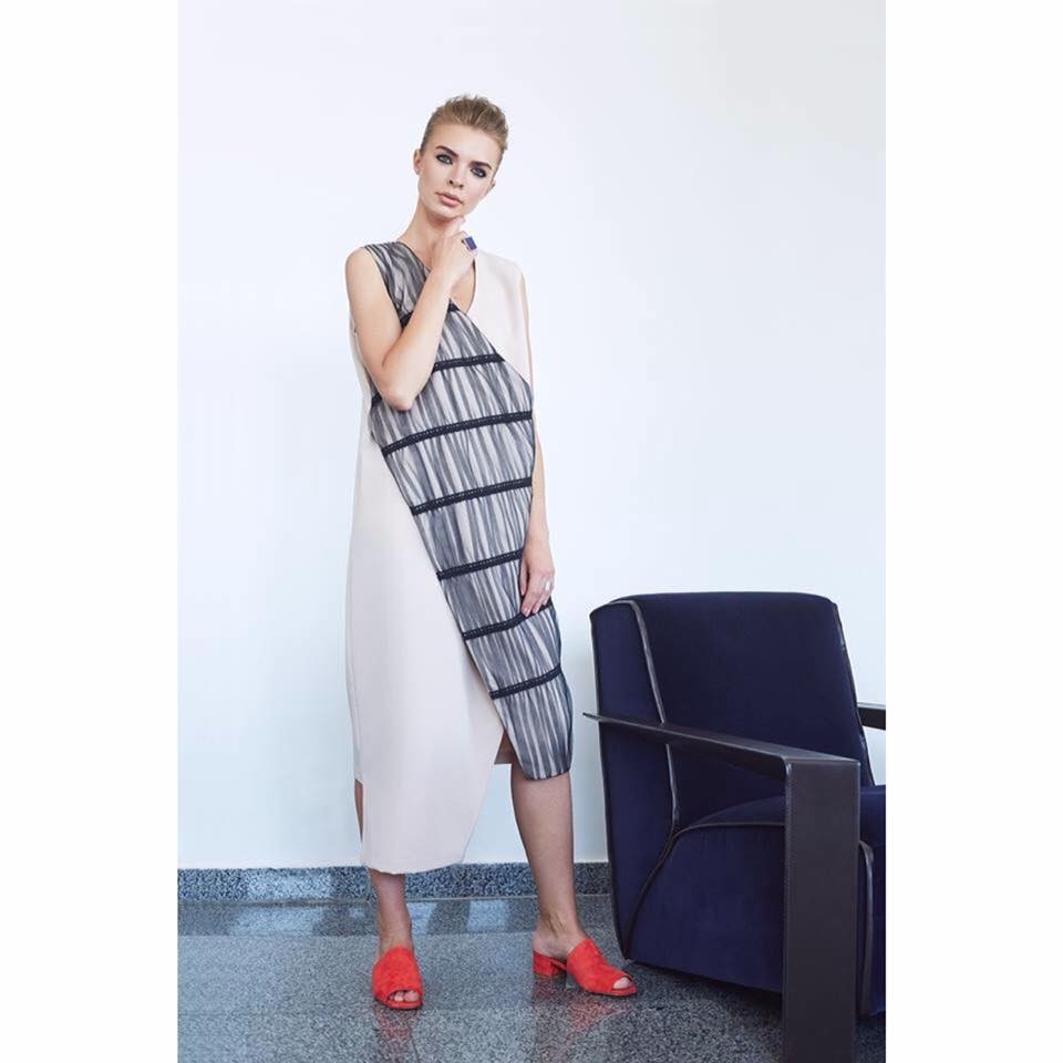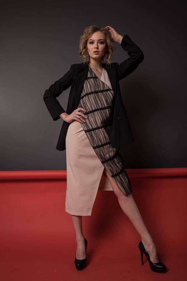 Особливості: Поєднання двох видів тканини: бежева костюмна і бавовняна бежева декорована чорним фатином і бавовняним мереживом. Асиметрія довжини по полиці. V-подібний виріз горловини.