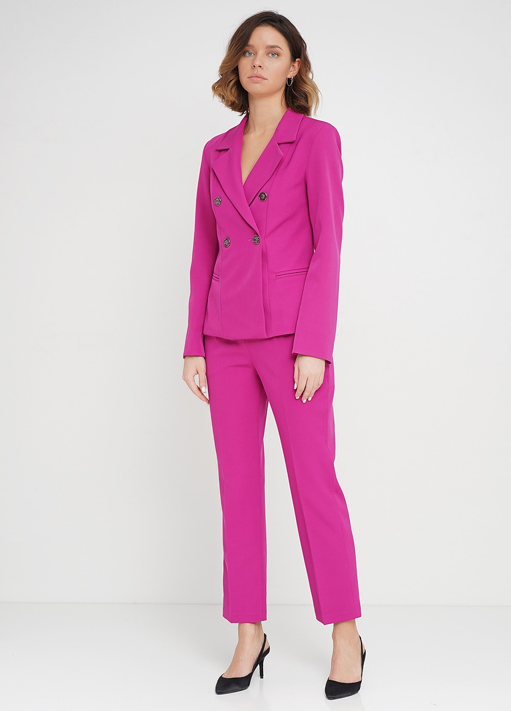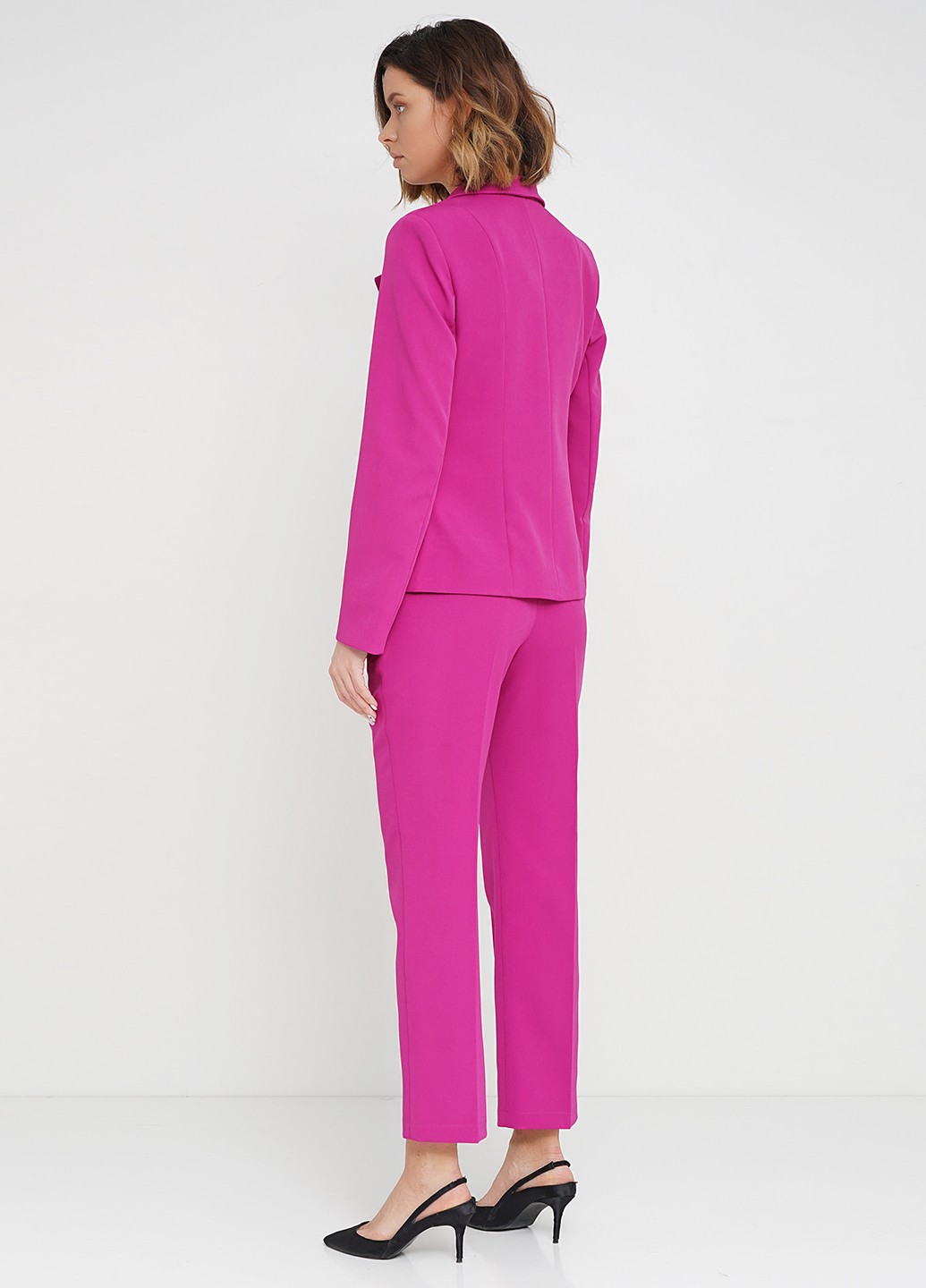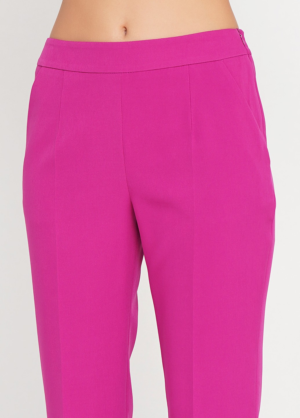 Укороченные зауженые брюки из костюмной ткани в цвете фукси, с проглаженными стрелками, в боковом шве молния. Универсальные в носке, как в классическом стиле так и в повседневной жизни. Как с жакетом или рубашкой и с лодочками, так и с белой футболкой и кроссовками. Базовая деталь гардероба.
