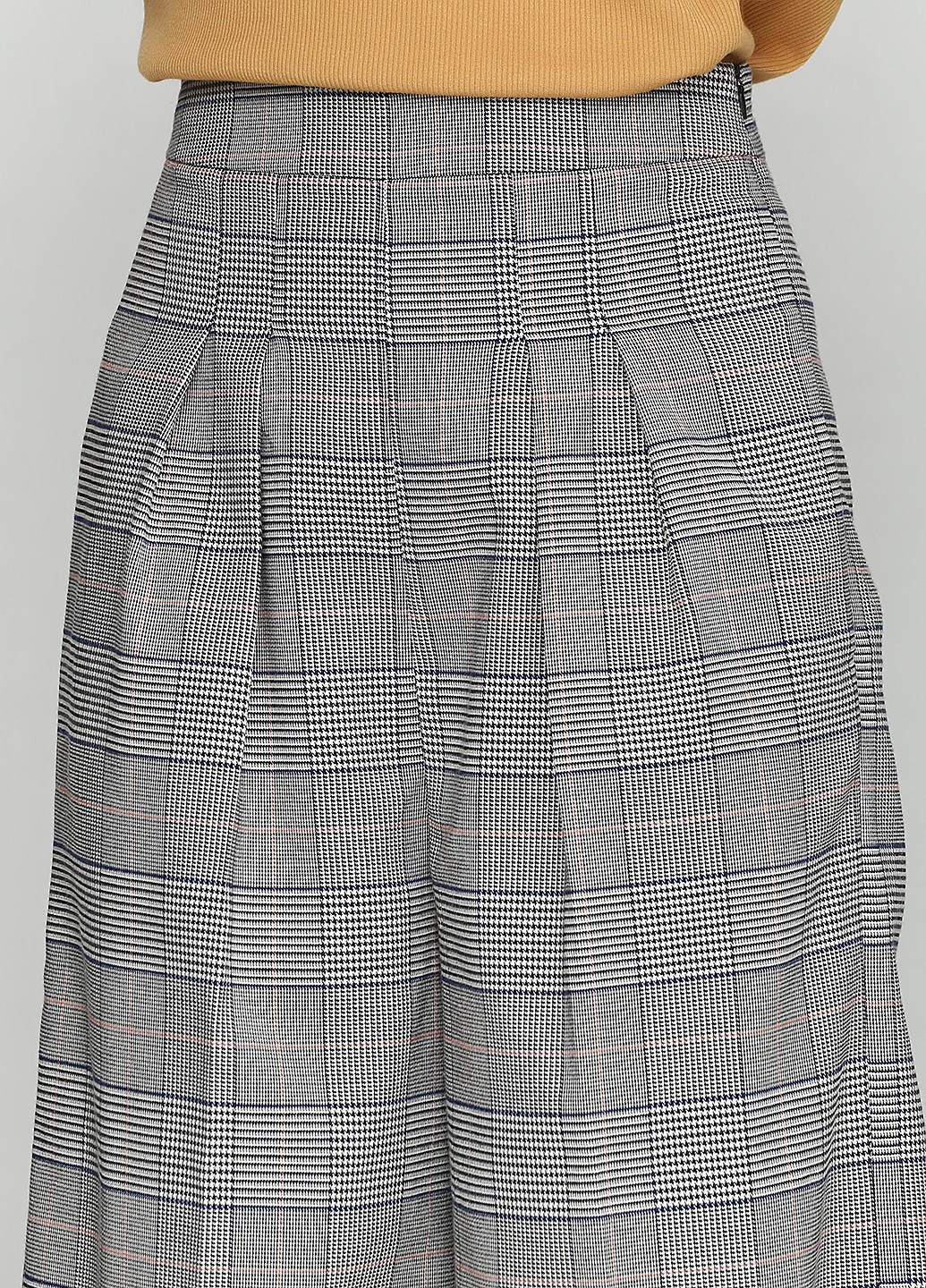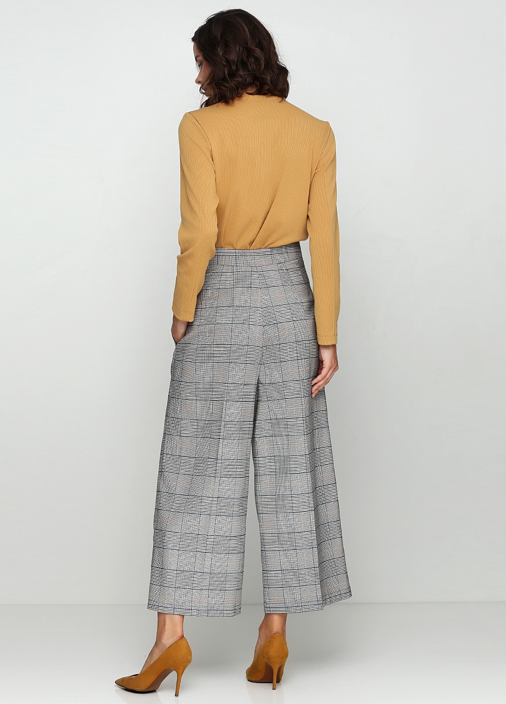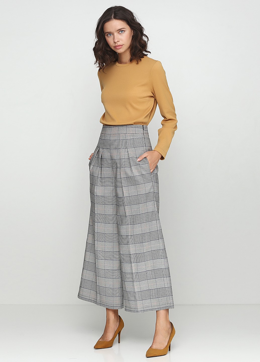 Кюлоты из костюмной ткани в клетку с завышенной талией, со складами, косыми карманами по бокам и потайной змейкой в боковом шве. Удобные в носке, как в классическом стиле так и в повседневной жизни. Как с жакетом или рубашкой и с лодочками, так и с белой футболкой и кроссовками.