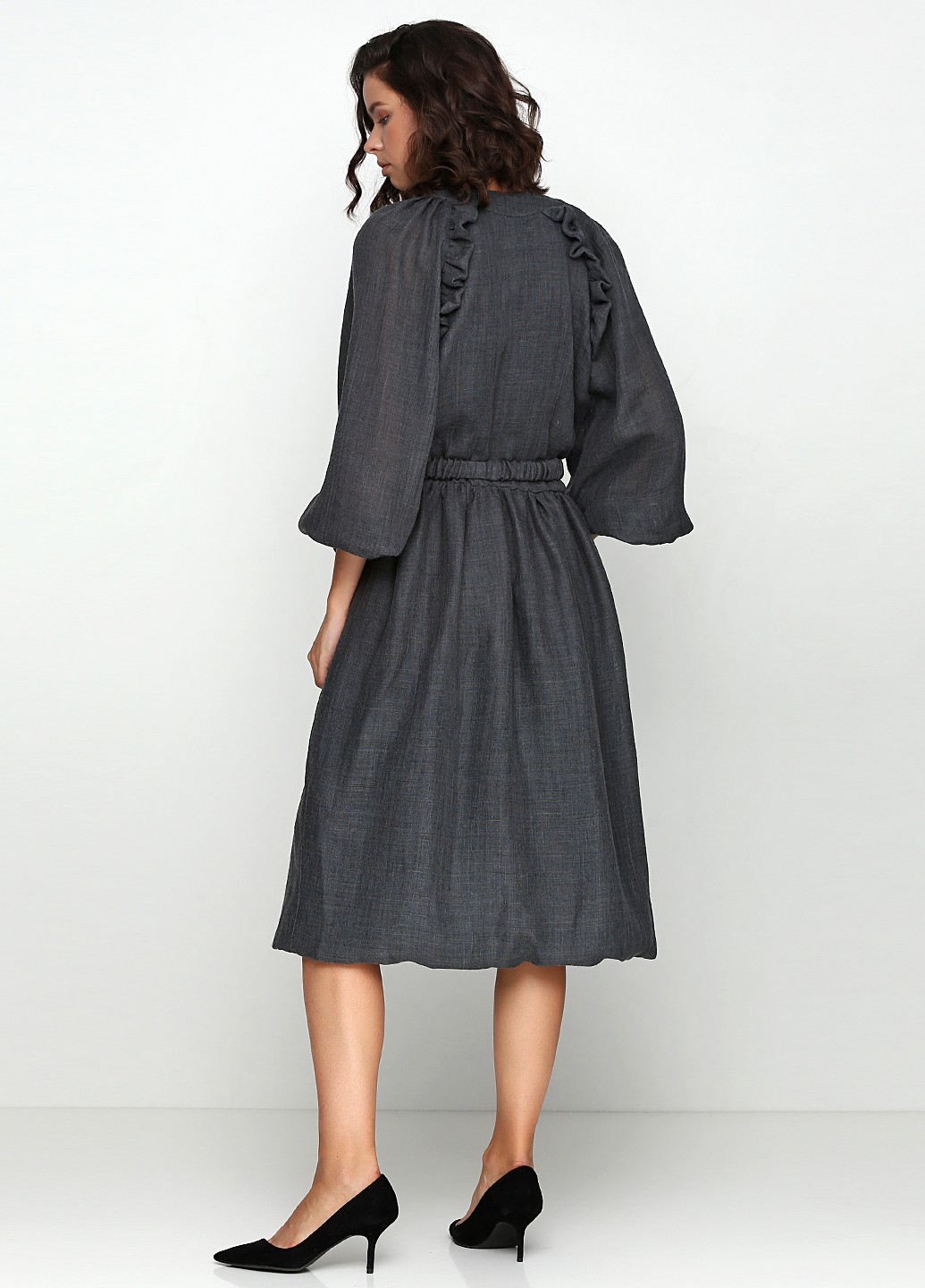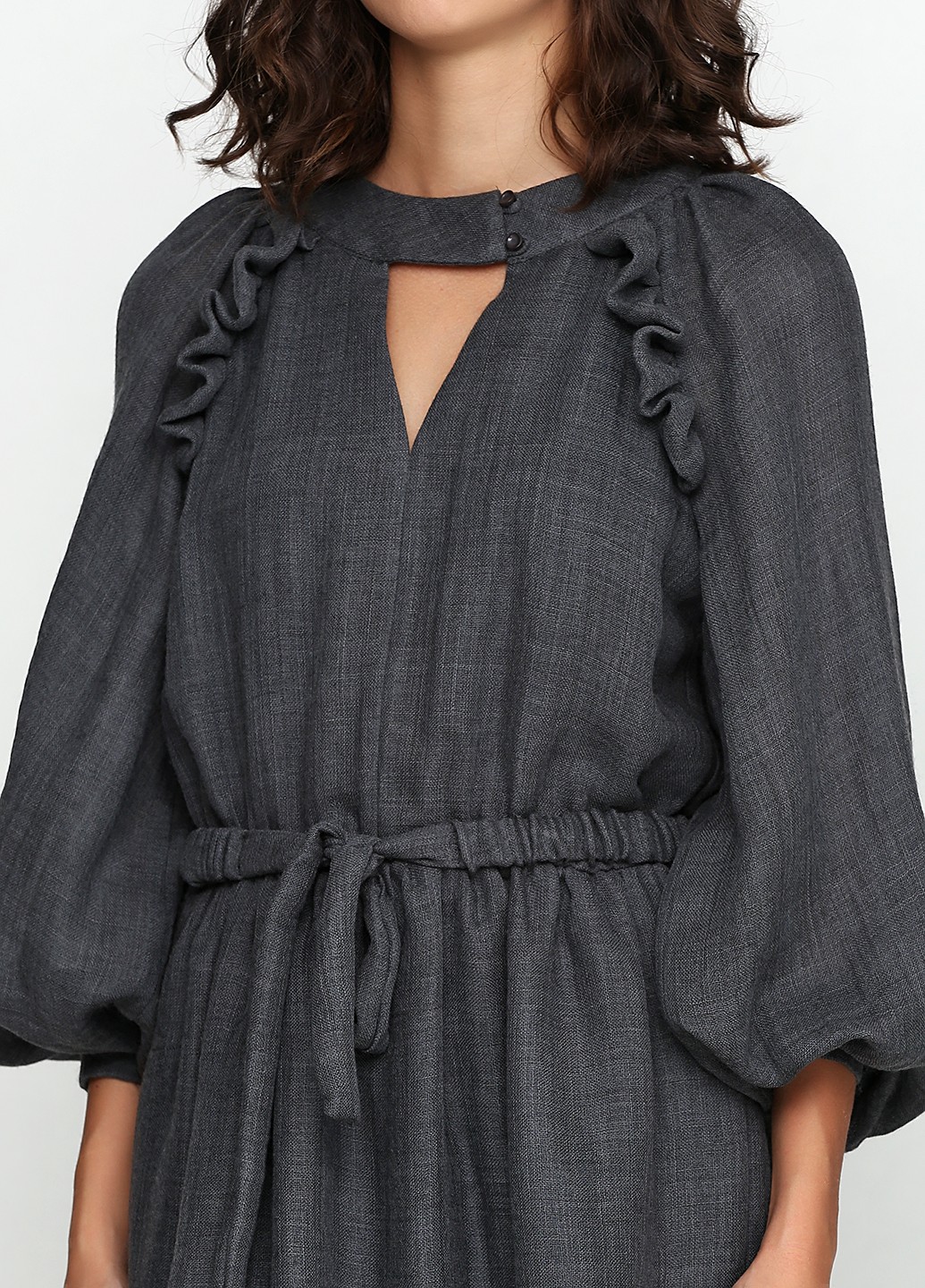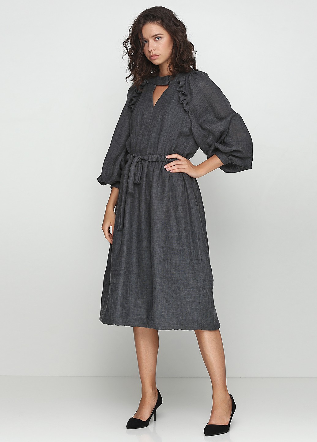 Серое платье из тончайшей шерсти в длине миди. Свобного облегания, по талии резинка, длиный объемный рукав реглан с узним манжетом с навесной петлей. По пройме, спинке и полке втачные рюши, по переду горловины треугольный вырез. По горловине отрезной манжет с навесными петлями. Низ платья с обьемным подворотом, пристроченным к хлопковой подкладке. В комплекте с поясом-резинкой.