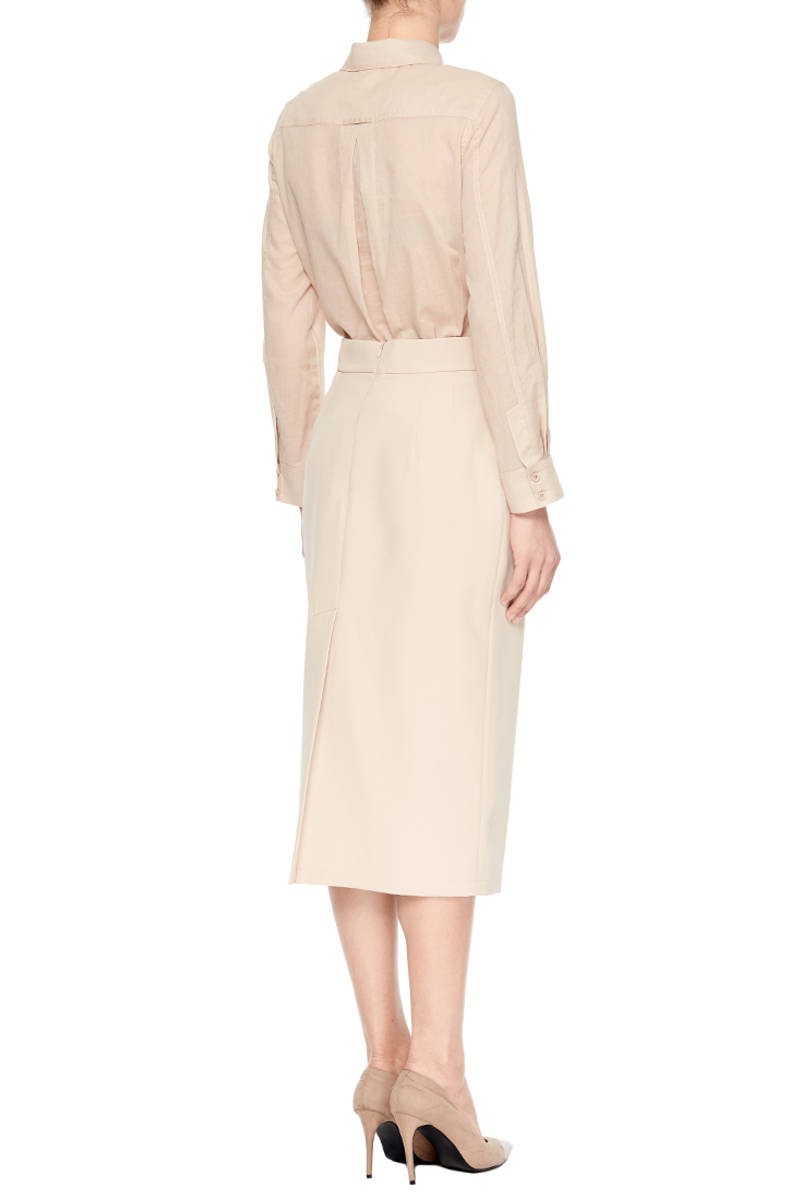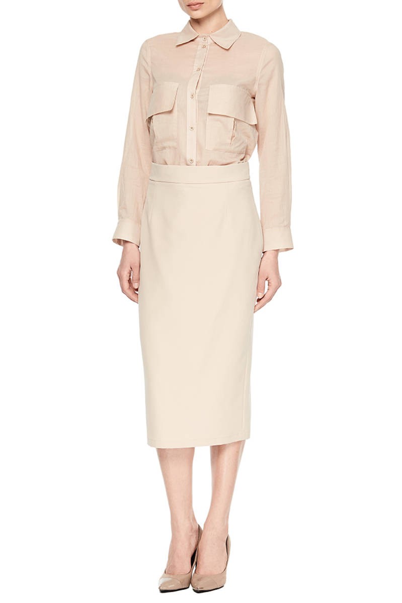 Бежевая юбка-карандаш из костюмной ткани на высокой посадке по талии, замком молния сзади, на вискозной подкладке. Можно сочетать с жакетом и лодочками, базовой футболкой и кроссовками или же топом и босоножками.