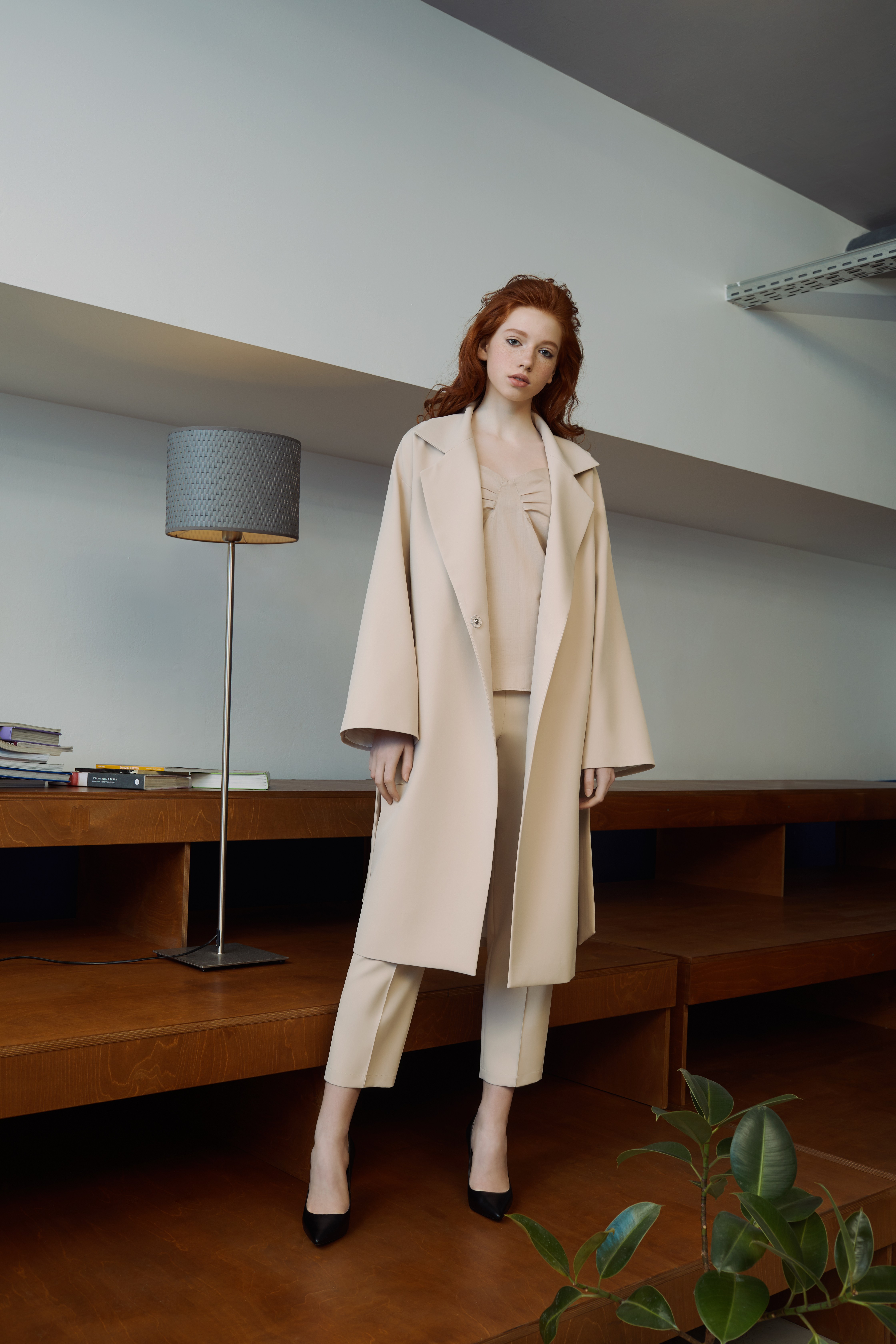Пальто на запах под пояс с объемным английским воротником, спущенным рукавом и накладными карманами .