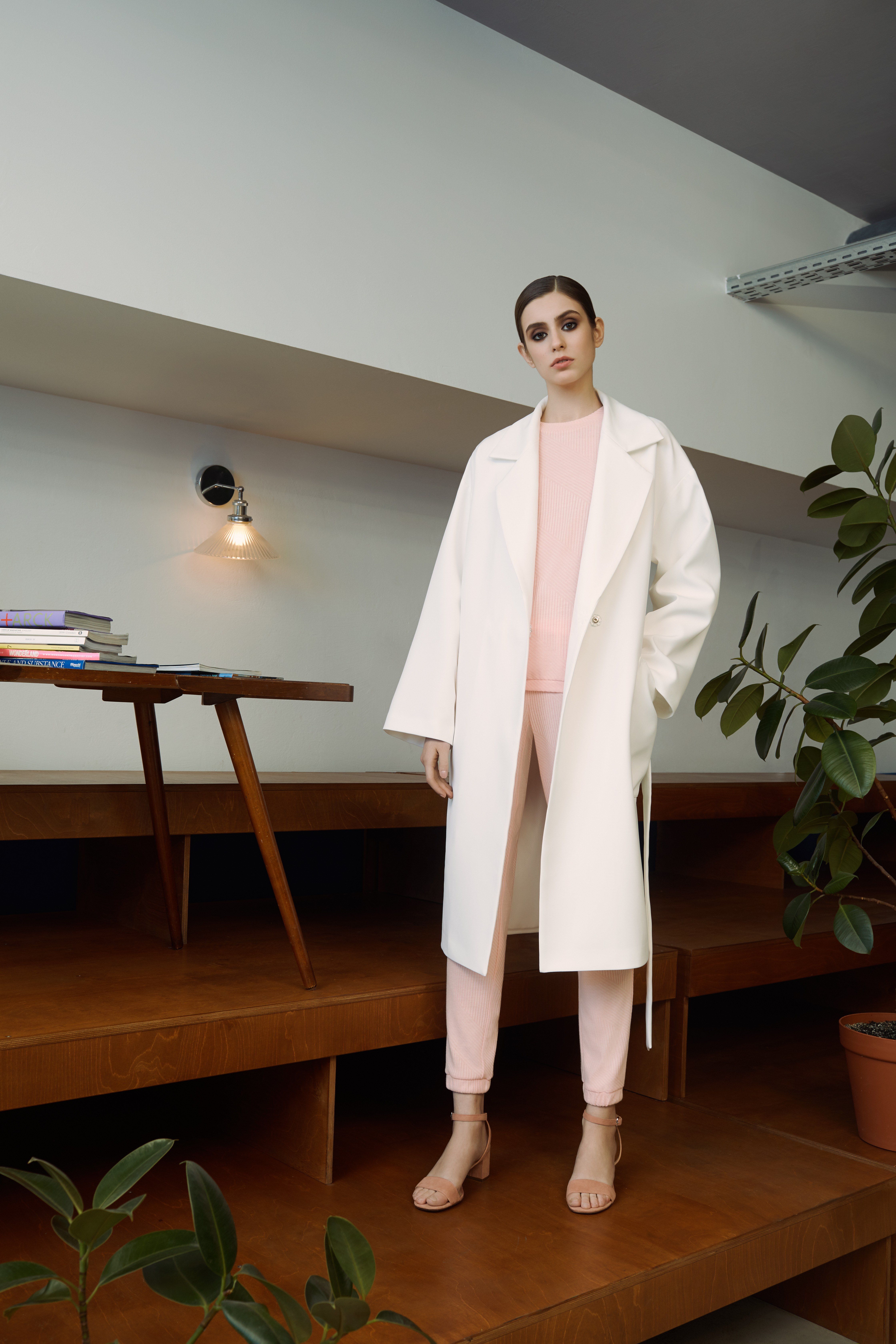 Пальто на запах под пояс с объемным английским воротником, спущенным рукавом и накладными карманами.
