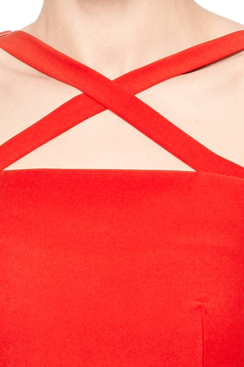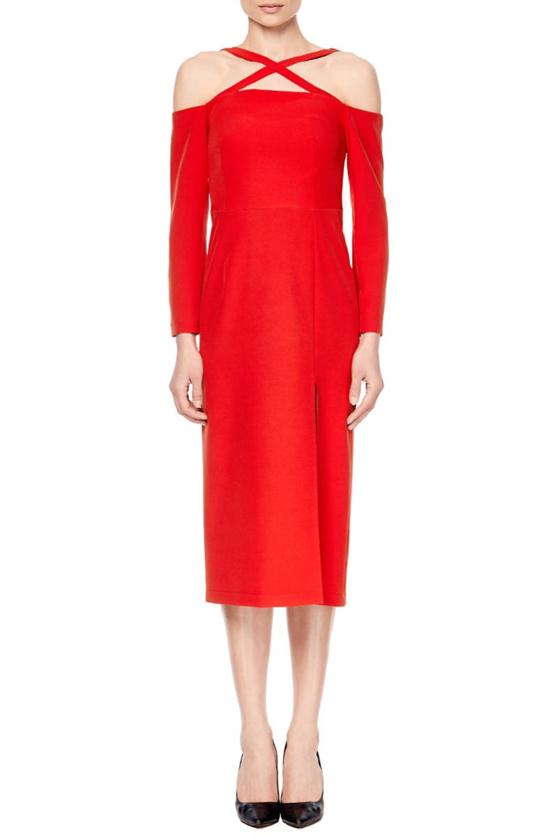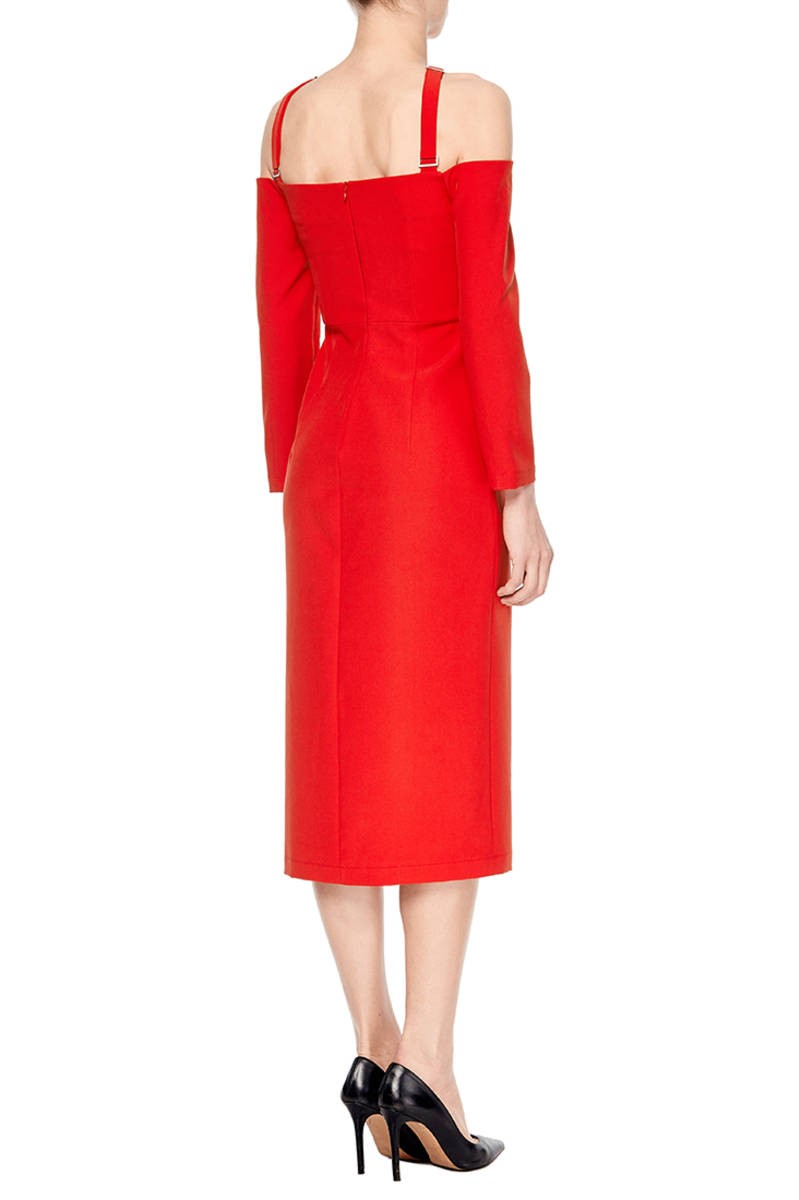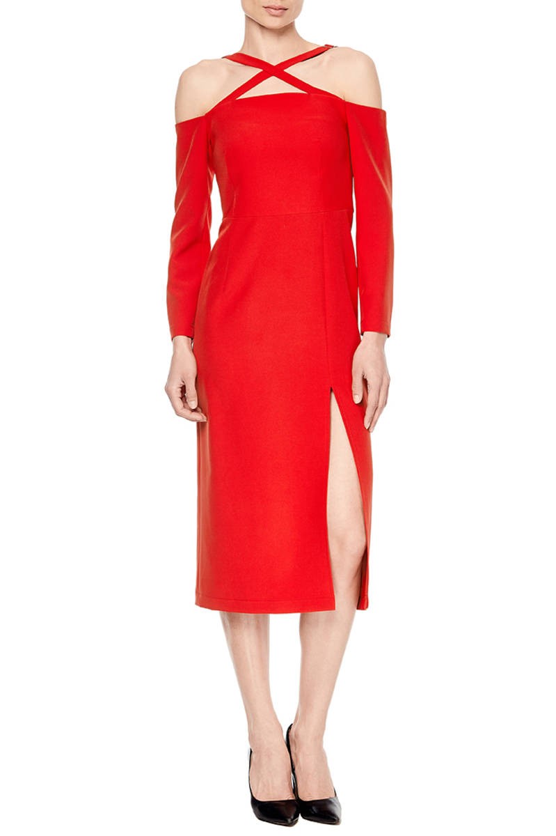 Красное платье-футляр с открытыми плечами - это самоуверенность и роскошь, более привлекательной и женственной модели просто не найти. Яркие детали в виде перекрещённых бретелей и разрез спереди придают шарма и страсти образу. Надев красное платье-футляр невозможно остаться незамеченной, идеальный вариант для торжественных мероприятий, вечеринок и вечерних выходов в свет.