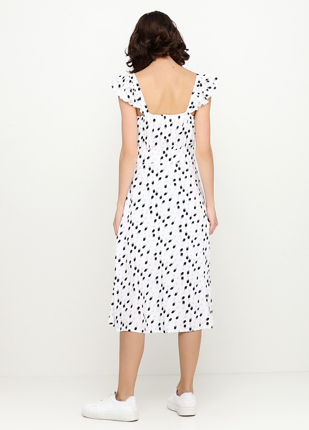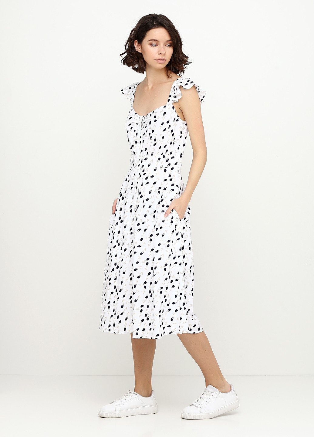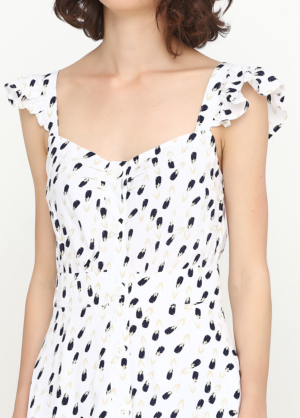 Белый сарафан с мелким цветочным принтом, приталенного силуэта на планке с пуговицами по всей длине (7 шт), на высокой талии, отрезная юбка расклешенная к низу, на бретелях с пристроченными вертикальныими рюшами, маленькими складами по груди, врезными карманами в боком шве, на подкладе из тонкого хлопка.