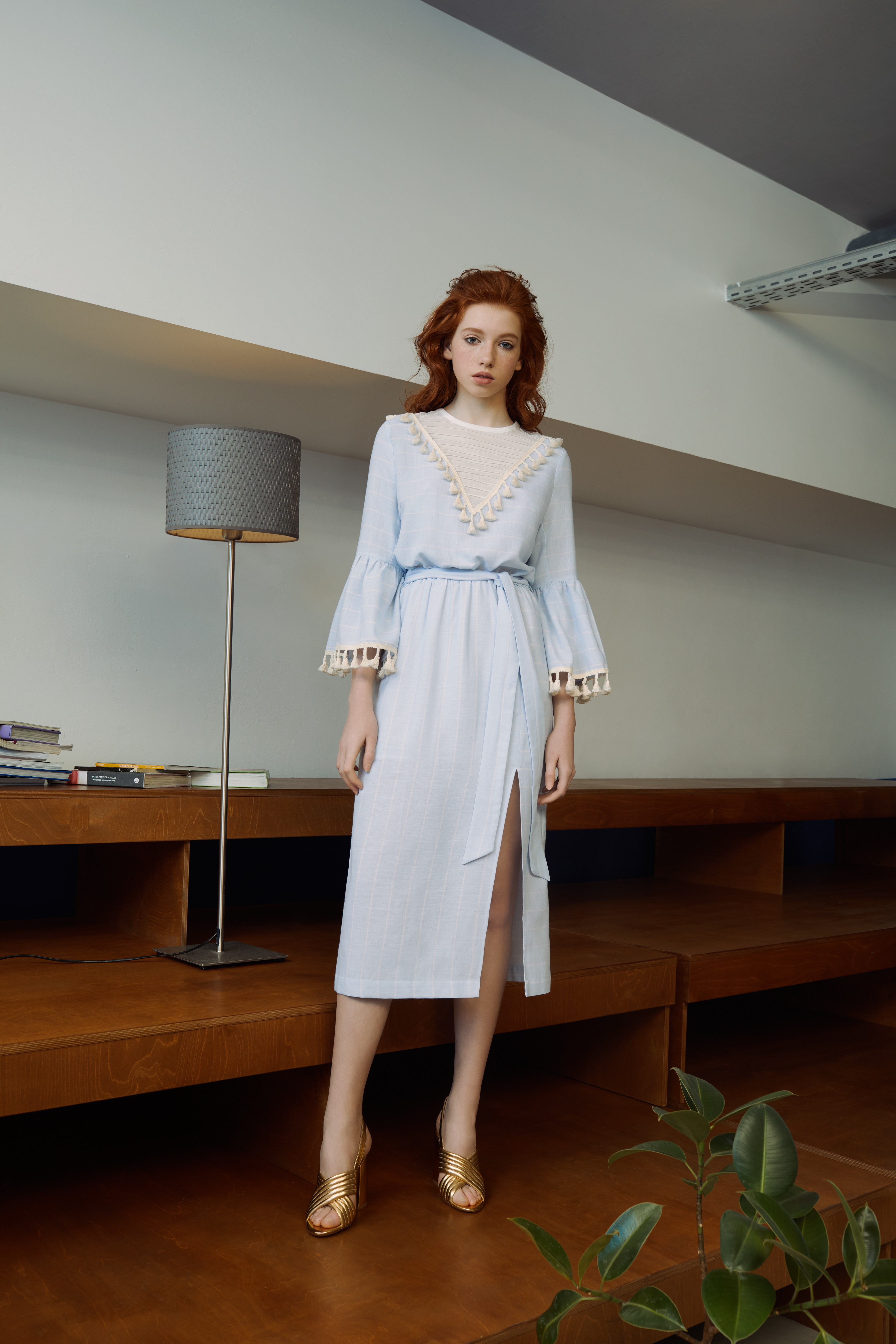 Особенности: Круглый вырез. Вверху вставка треугольной формы из белого хлопка заложенного защипами с нашивными кисточками Рукав втачной с пришивным воланом и настроченными кисточками по низу. Отрезное по талии, на резинке. Разрез по левой стороне впереди юбки. Застежка – потойная молния по центру спинки. Хлопковая подкладка.