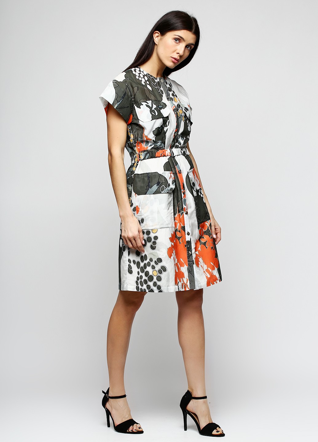 Особенности: Прямой силуэт. Круглый вырез под горло. Планка с 10 пуговицами. Рукав кроя крылышко. На полках по два накладных кармана с клапаном. Пояс-резинка с декоративной пряжкой. Низ платья на подкладе.