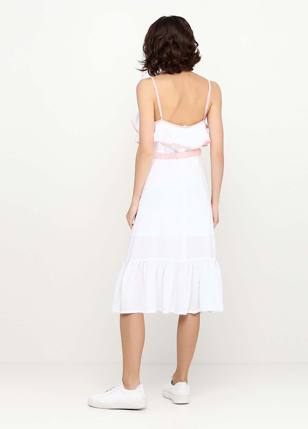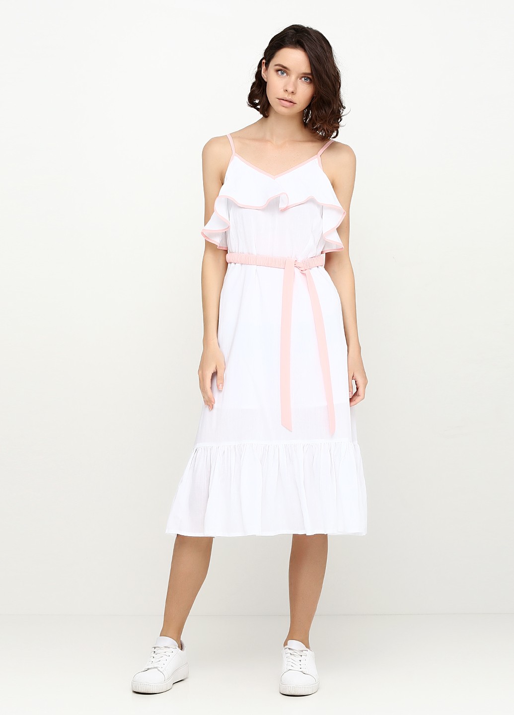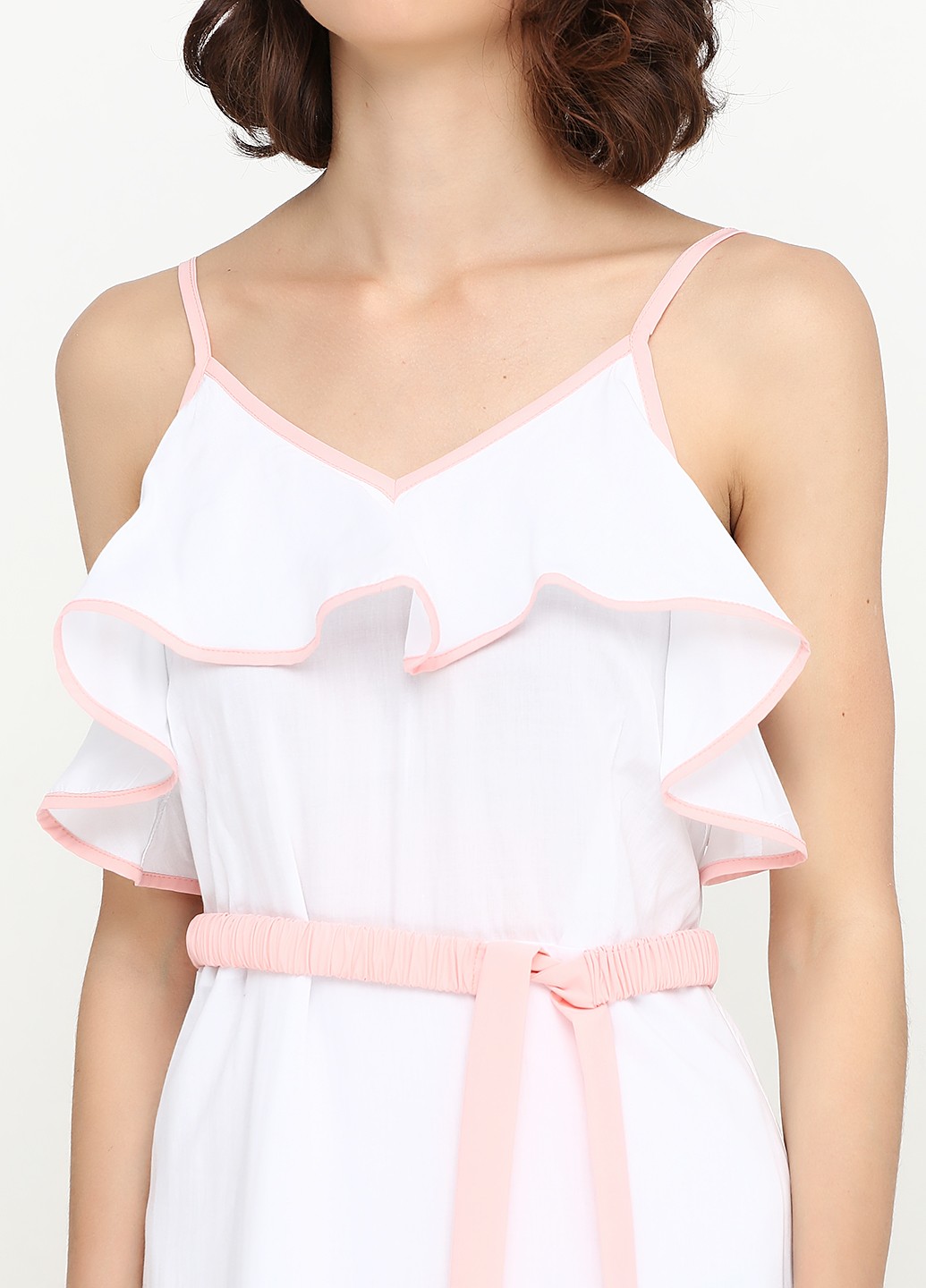 Белый сарафан полуприлегающего силуэта, отрезной по линии талии, лиф на тонких бретелях, в качестве декора на лифе волан, рюша по низу юбки, застежка потайная молния, пояс пудрового цвета на резинке. Окантовка по периметру платья пудрового цвета. Подклада из тонкого хлопка.