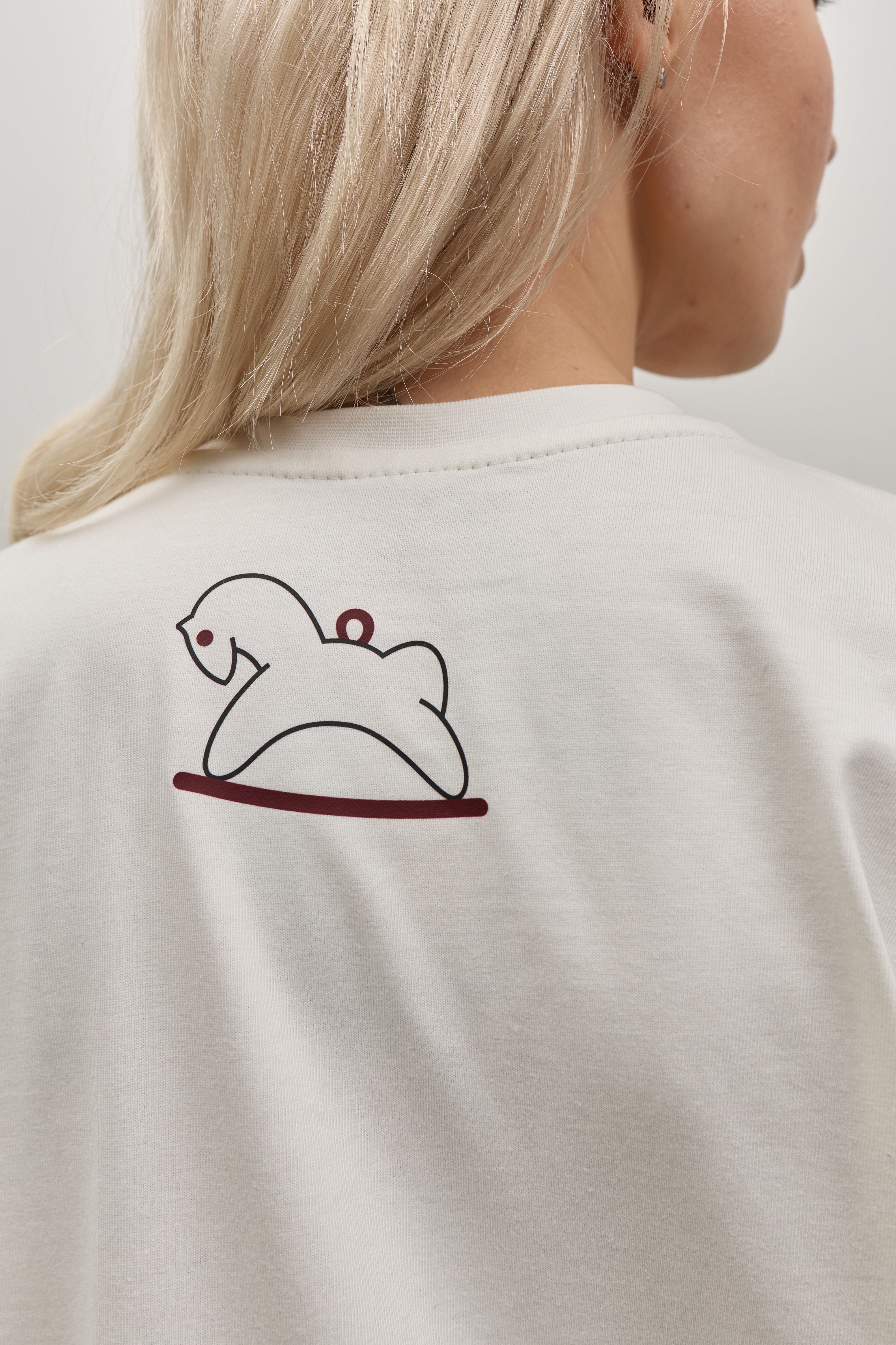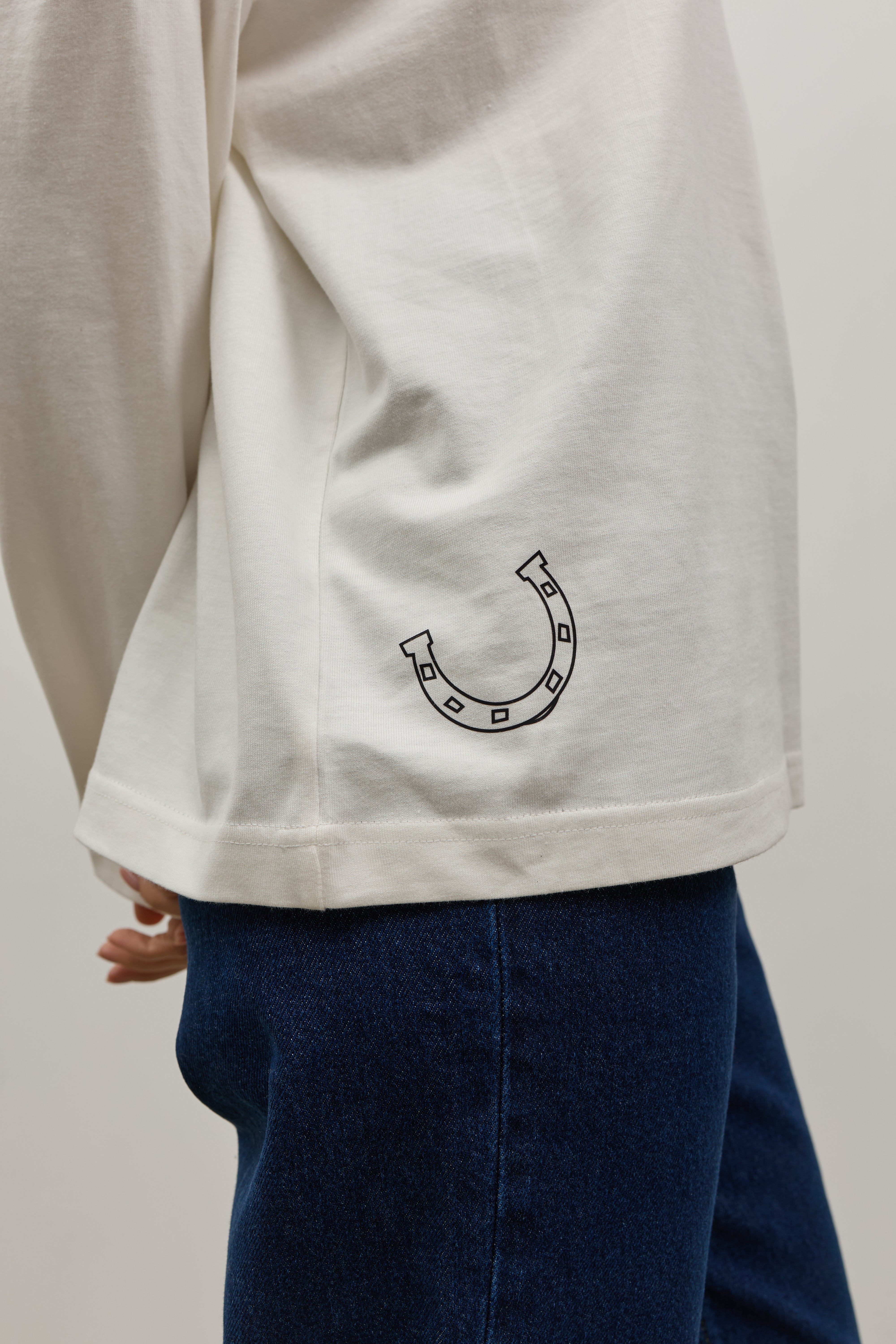 Білий лонгслів зі спущеним рукавом та друком