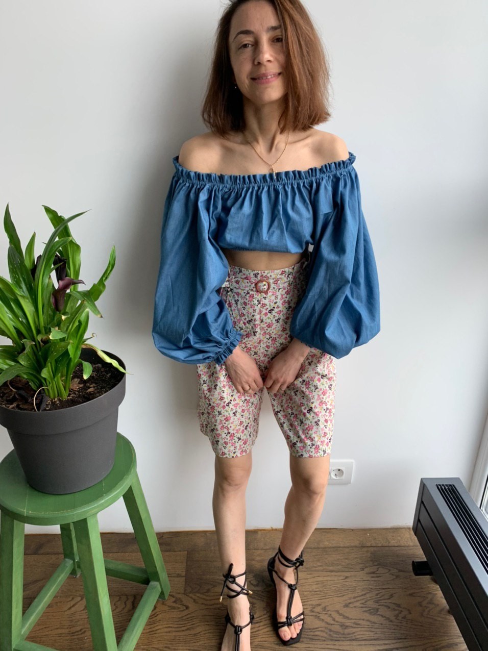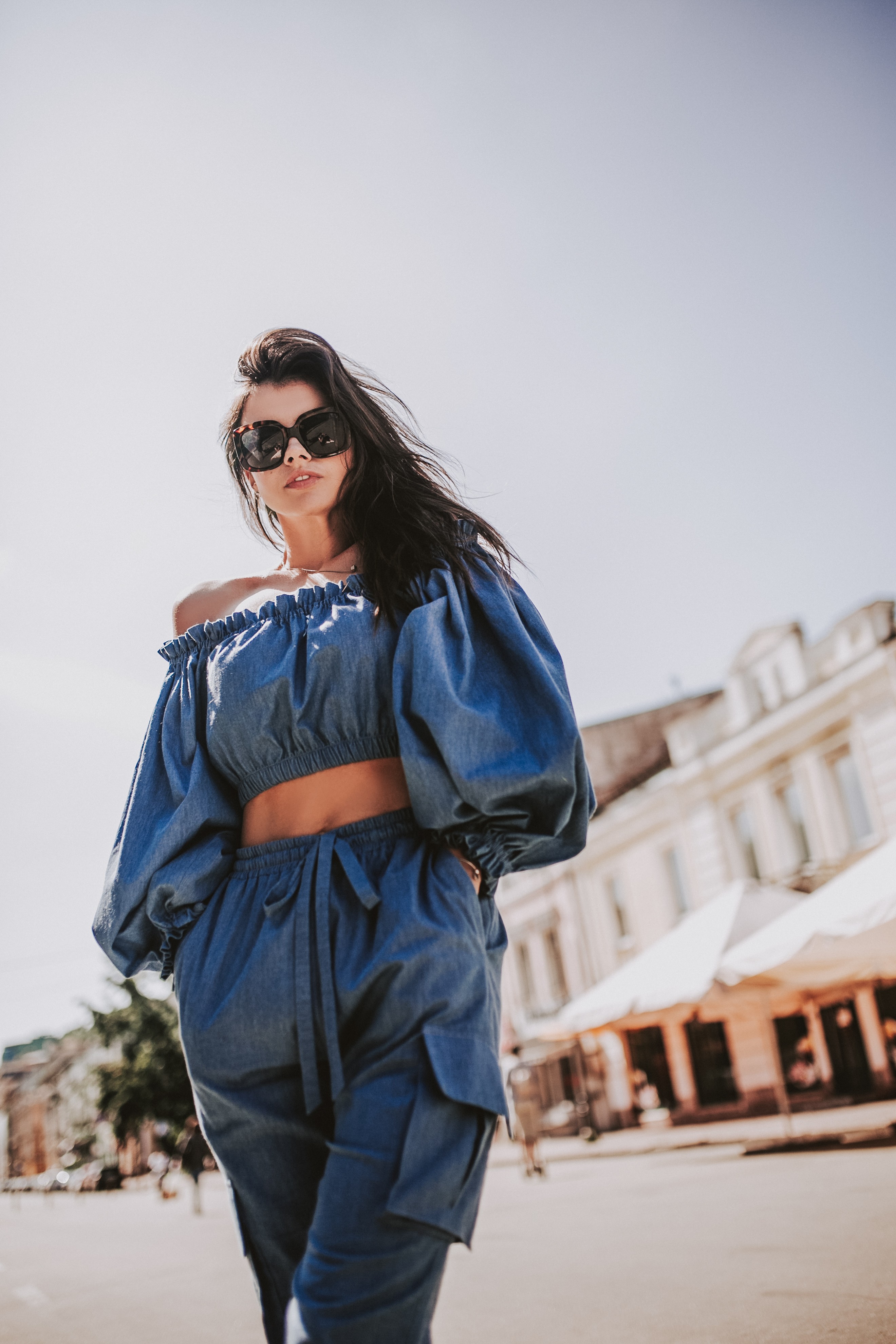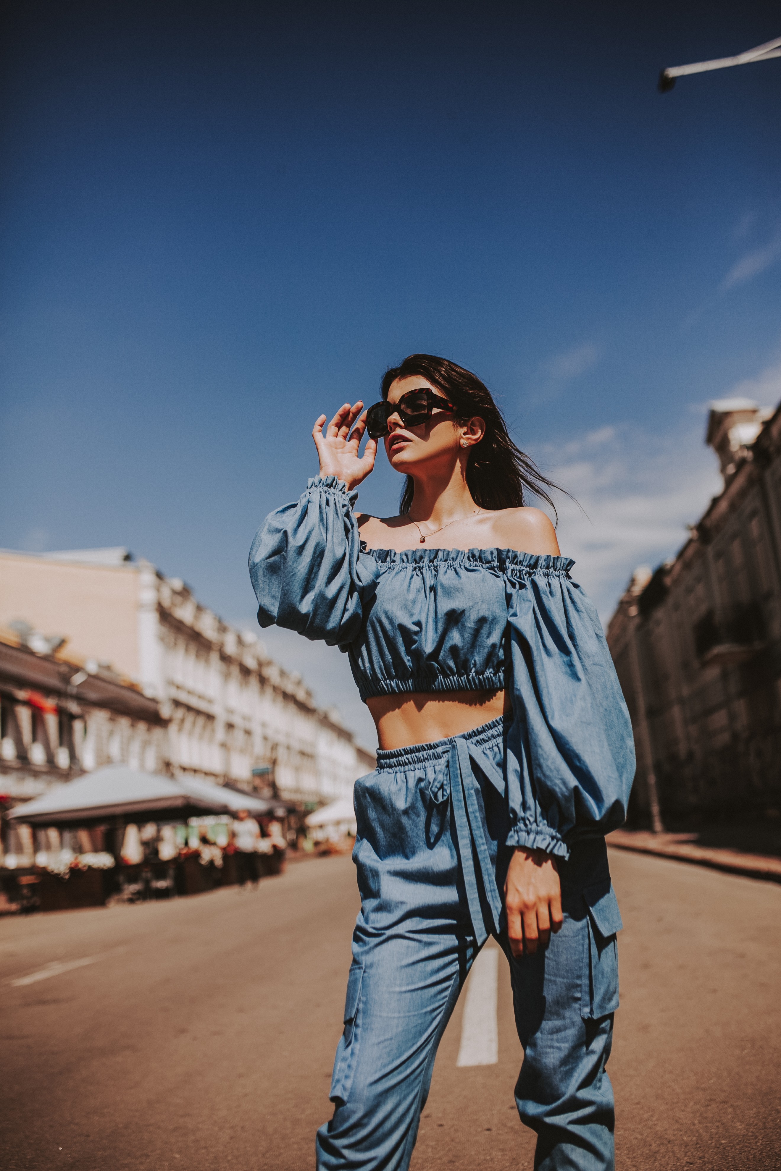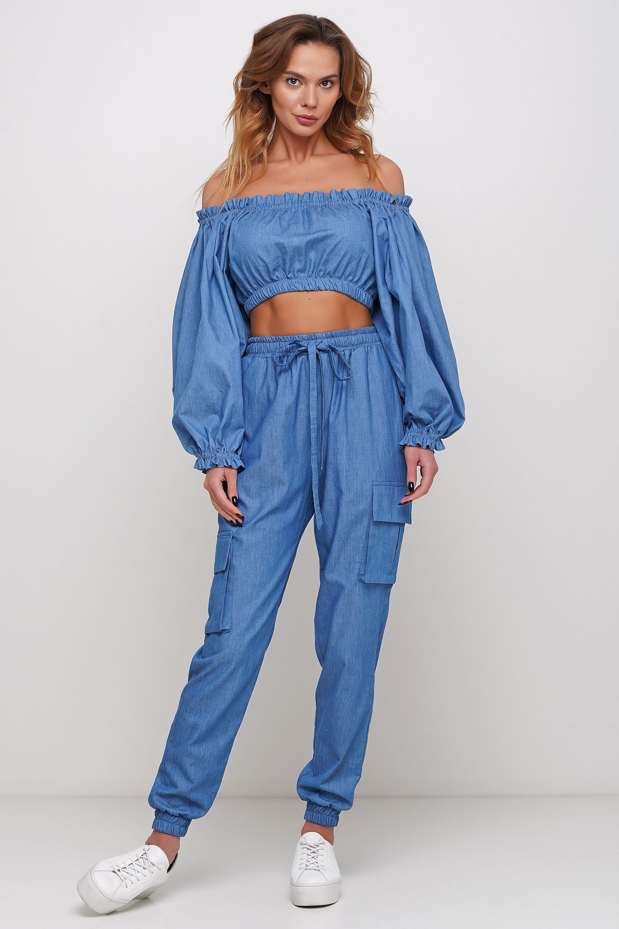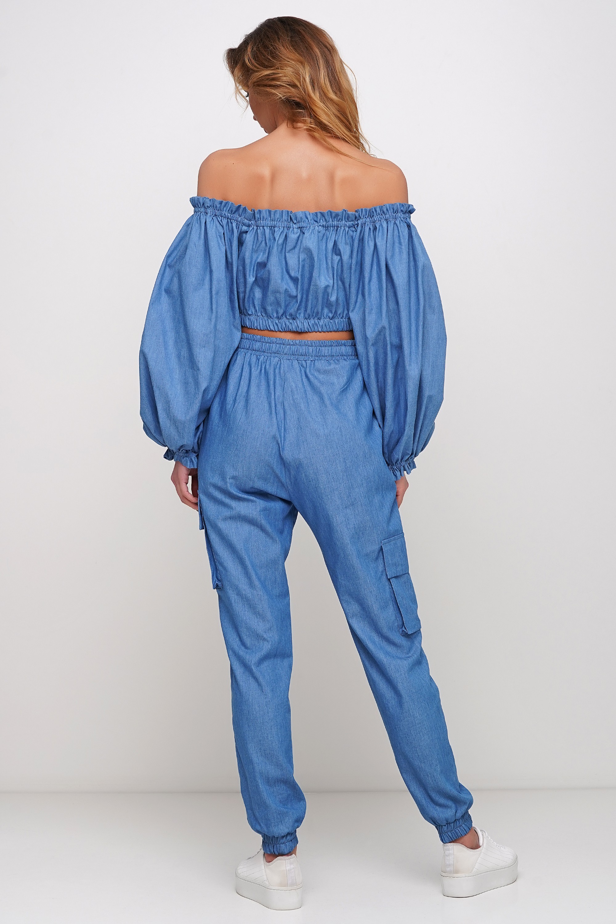 Укорочена блуза блакитна з голими плечами та пишним рукавом на манжеті-гумці. Блуза виконана з тонкого деніму, що робить її дуже практичною та комфортною в носінні. Блуза з деніму підходить як для святкового та повсякденного гардеробу, відмінно поєднується зі спідницею, брюками, джинсами на високій талії.