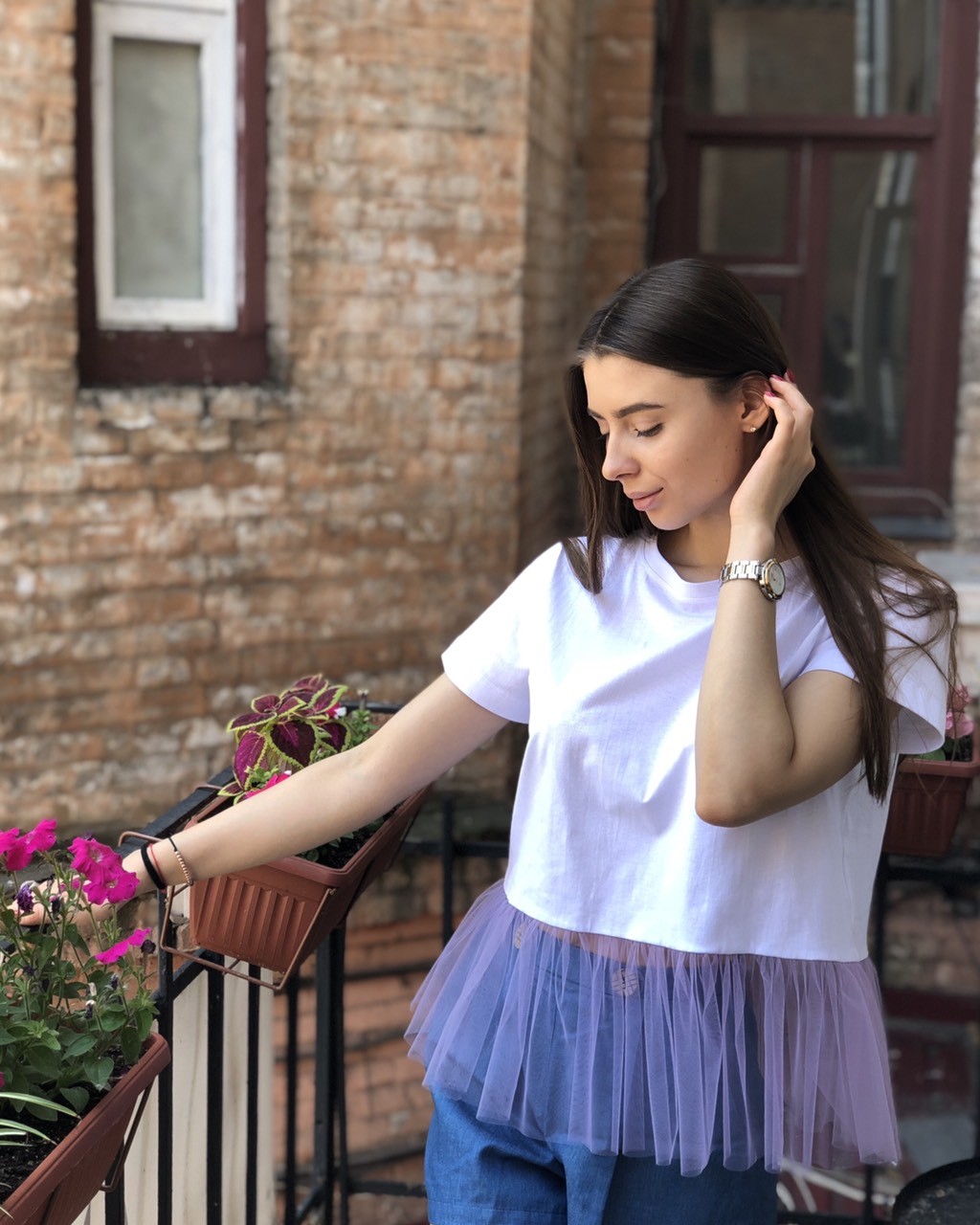 Біла футболка з коротким рукавом та фіолетовим фатином рюшів по низу.