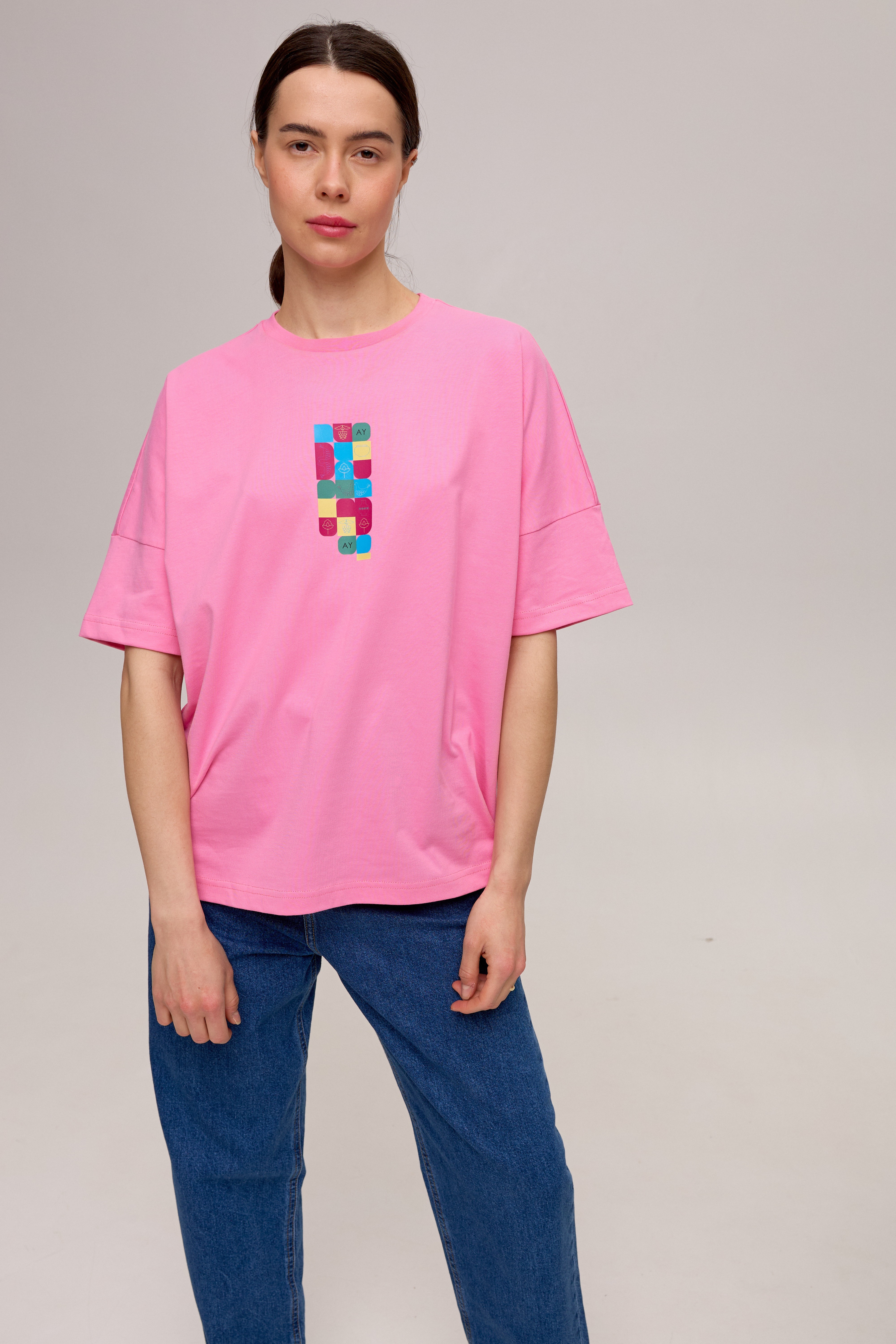 Рожева футболка зі спущеним плечем та друком
