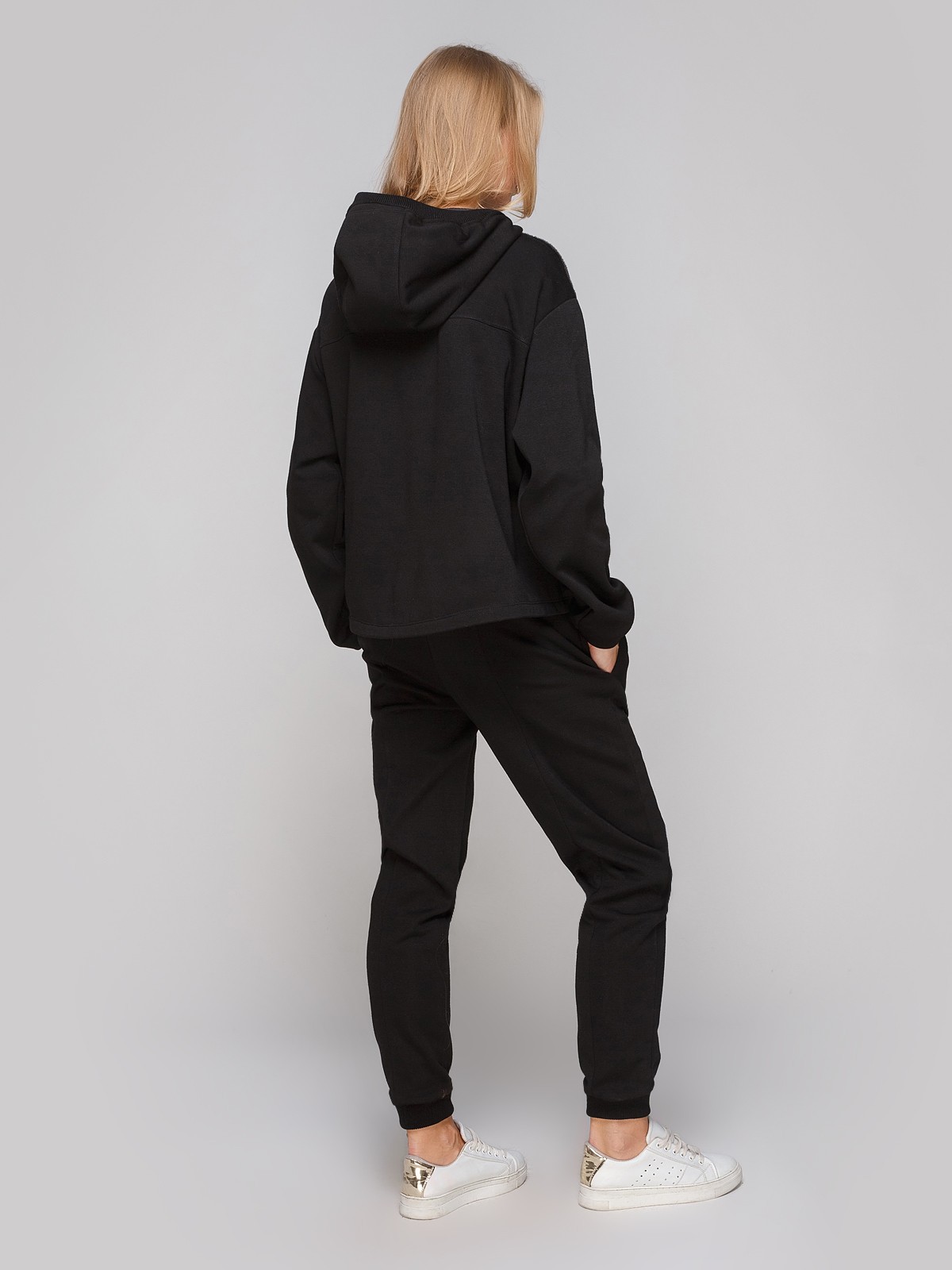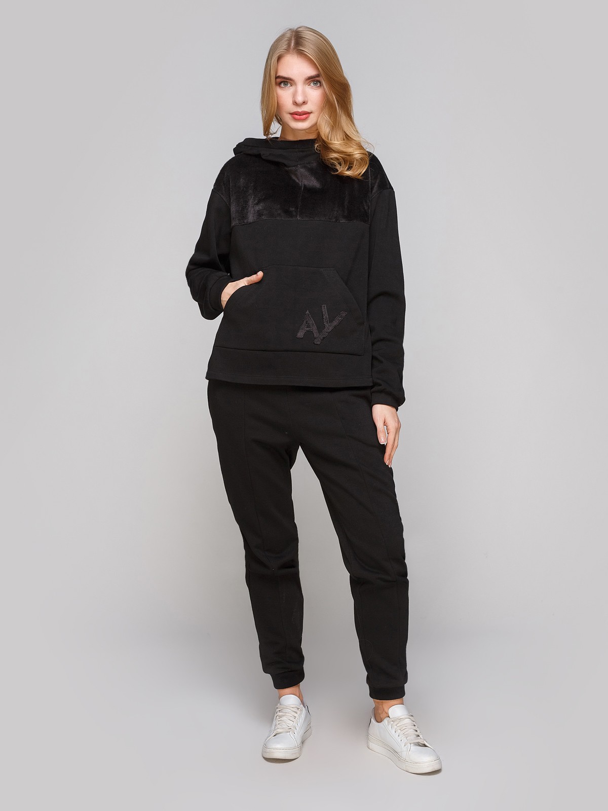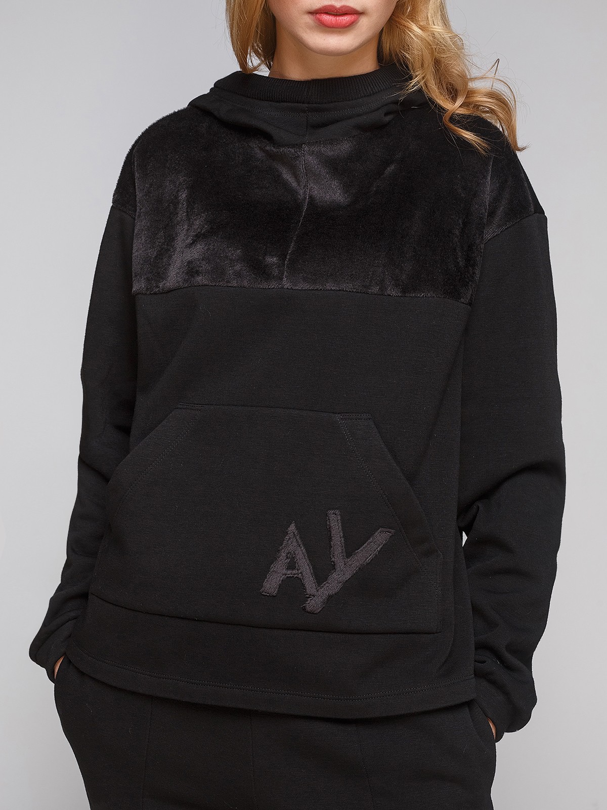 Теплый худи оверсайз с капюшоном черного цыета, накладным карманом впереди с апликацией AY, со спущенным плечем и манжетом на рукаве и.