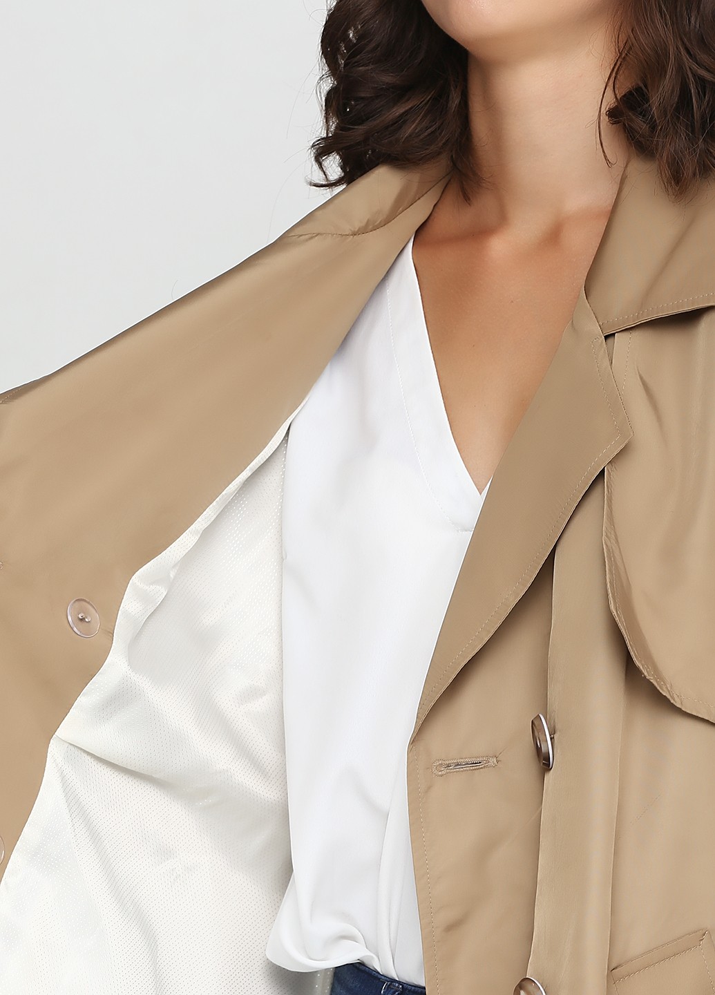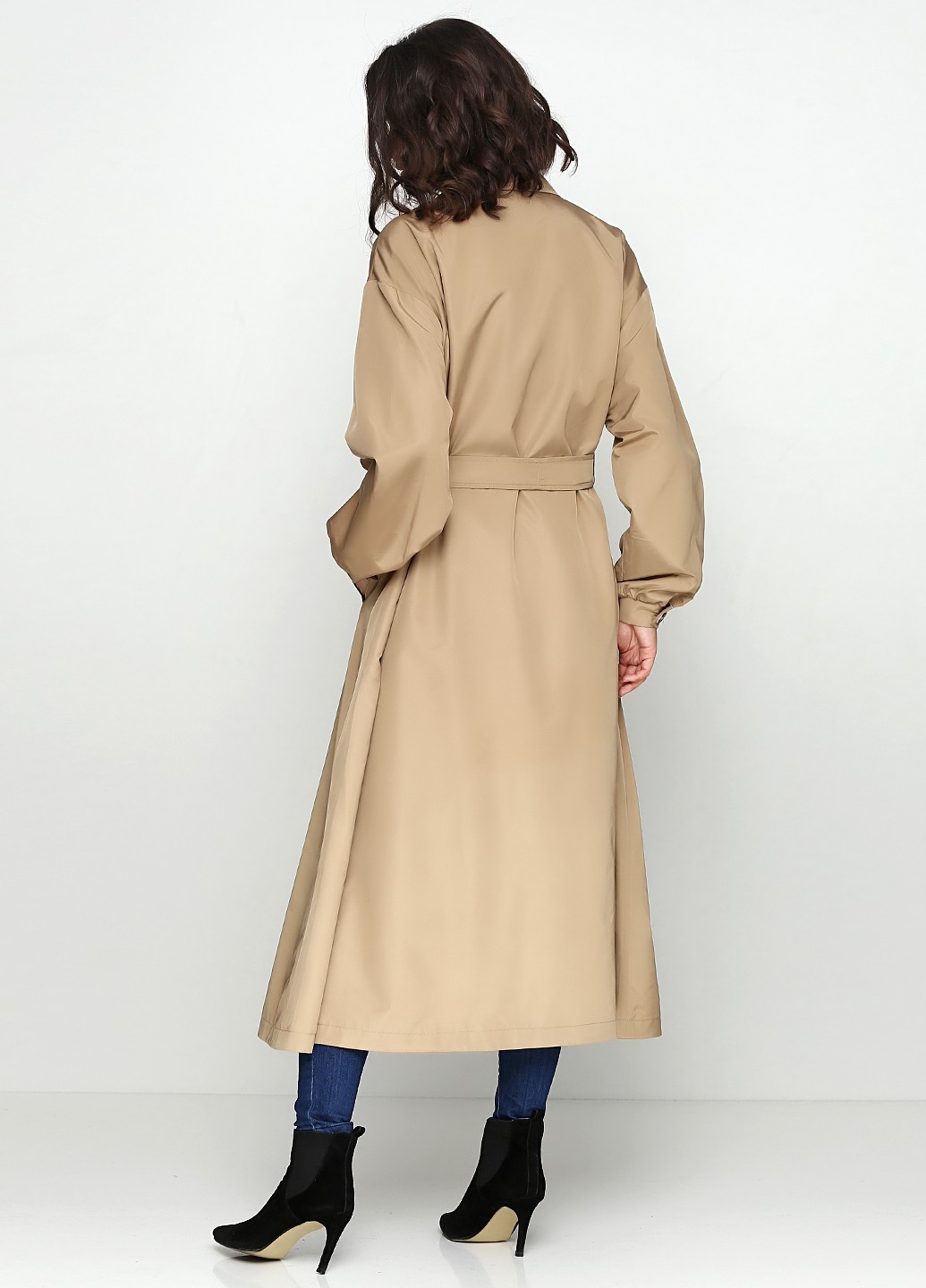 двубортный плащ прямого силуэта под пояс, с английским воротником, втачным широким рукавом собранным на манжет, косыми карманами, на подкладе
