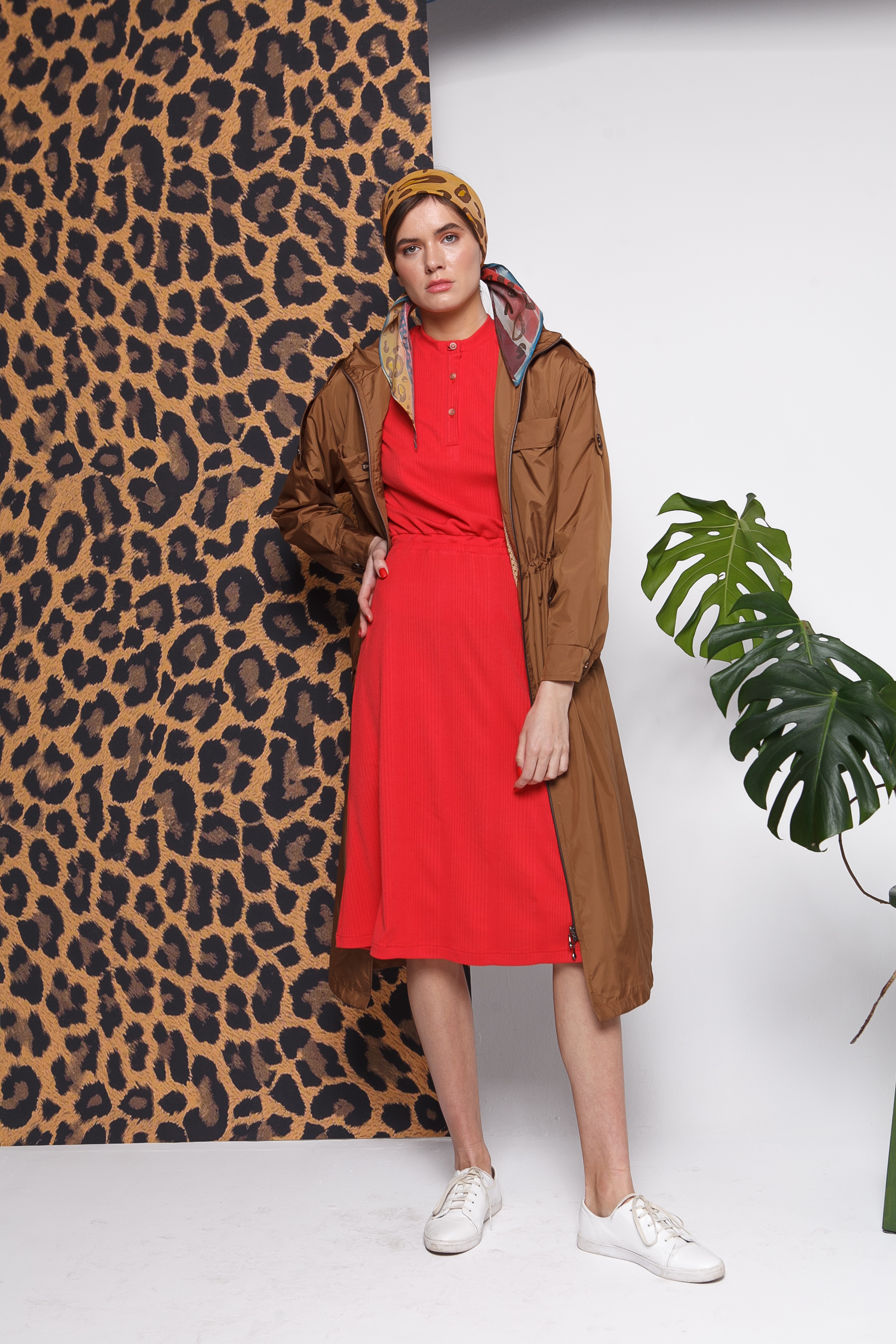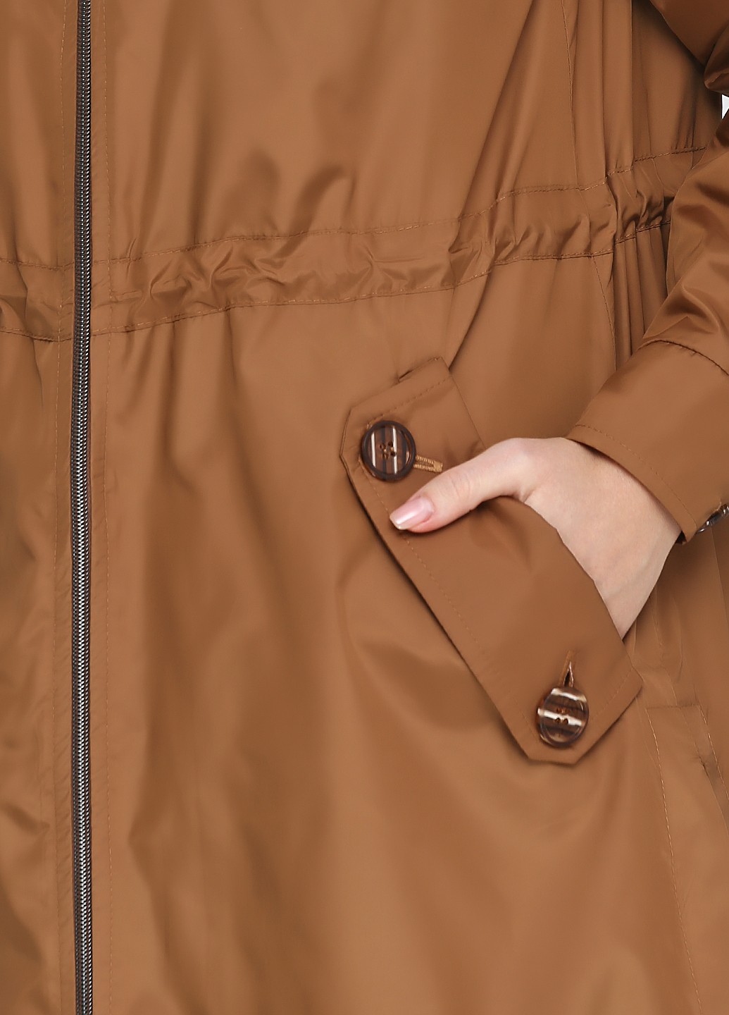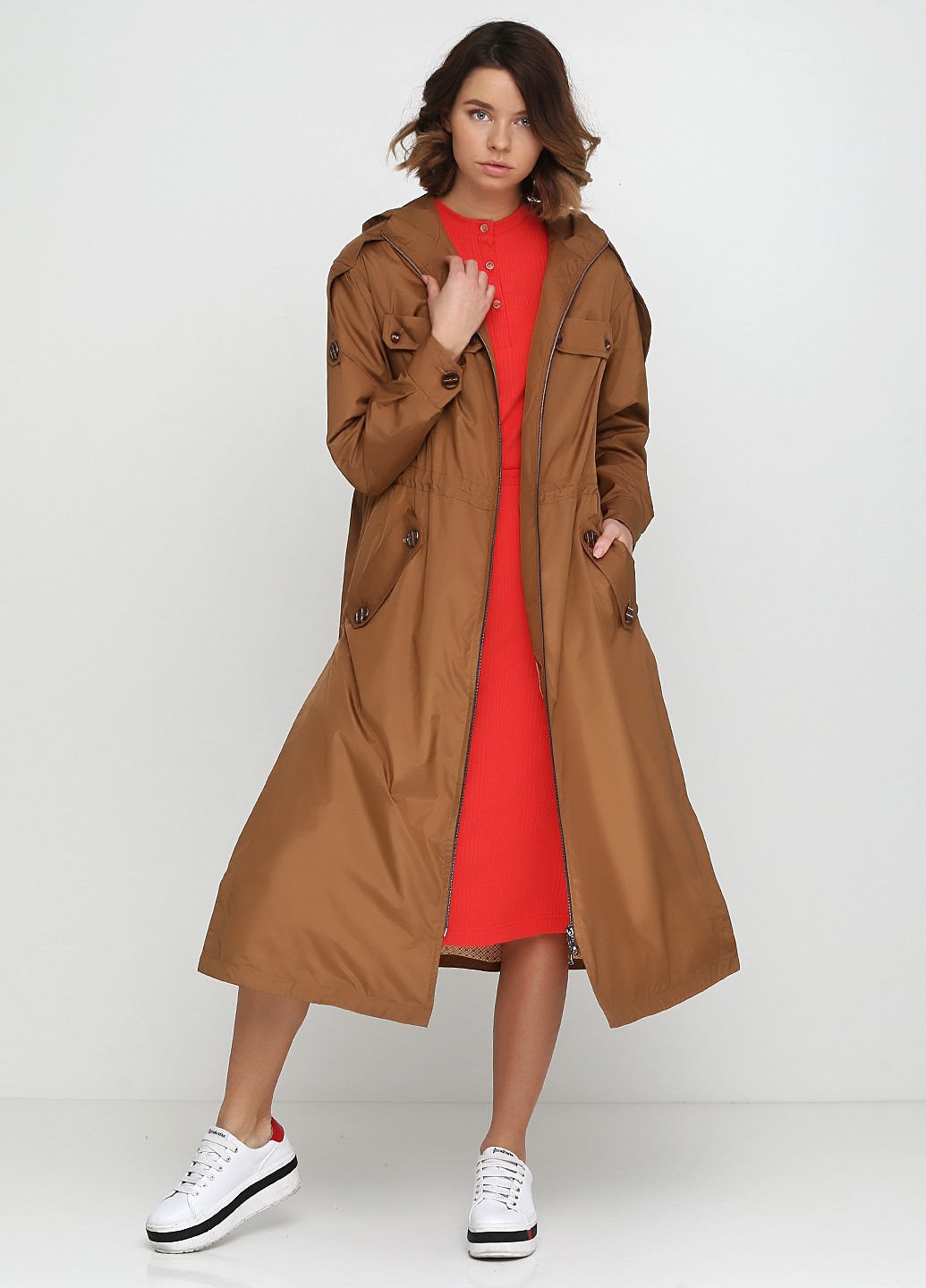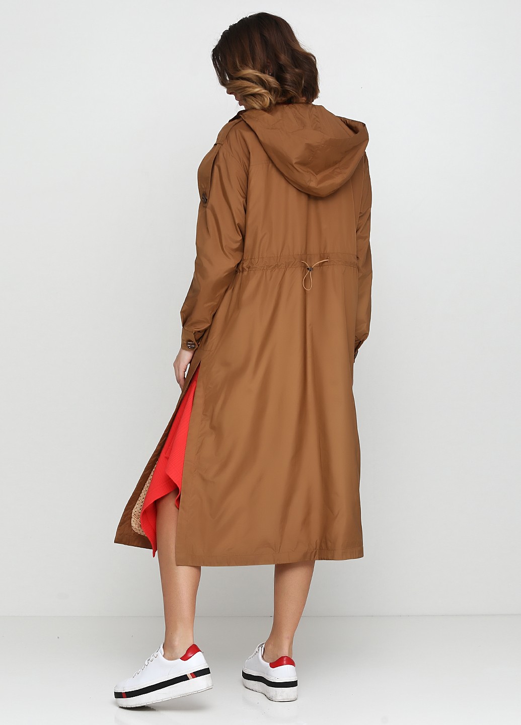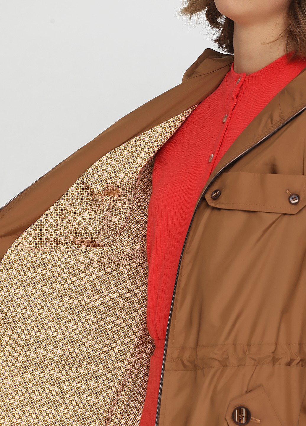 Длинная парка из коричневой плащевой ткани, свбодного силуэта с капюшоном и высокими разрезами в боковых швах с замком молния и кулисой по талии. Рукав свободного облегания с манжетом на пуговице с длинным патом на плече. Карманы рамка с отложным клапаном на пуговицах. Подклада 100% хлопок.