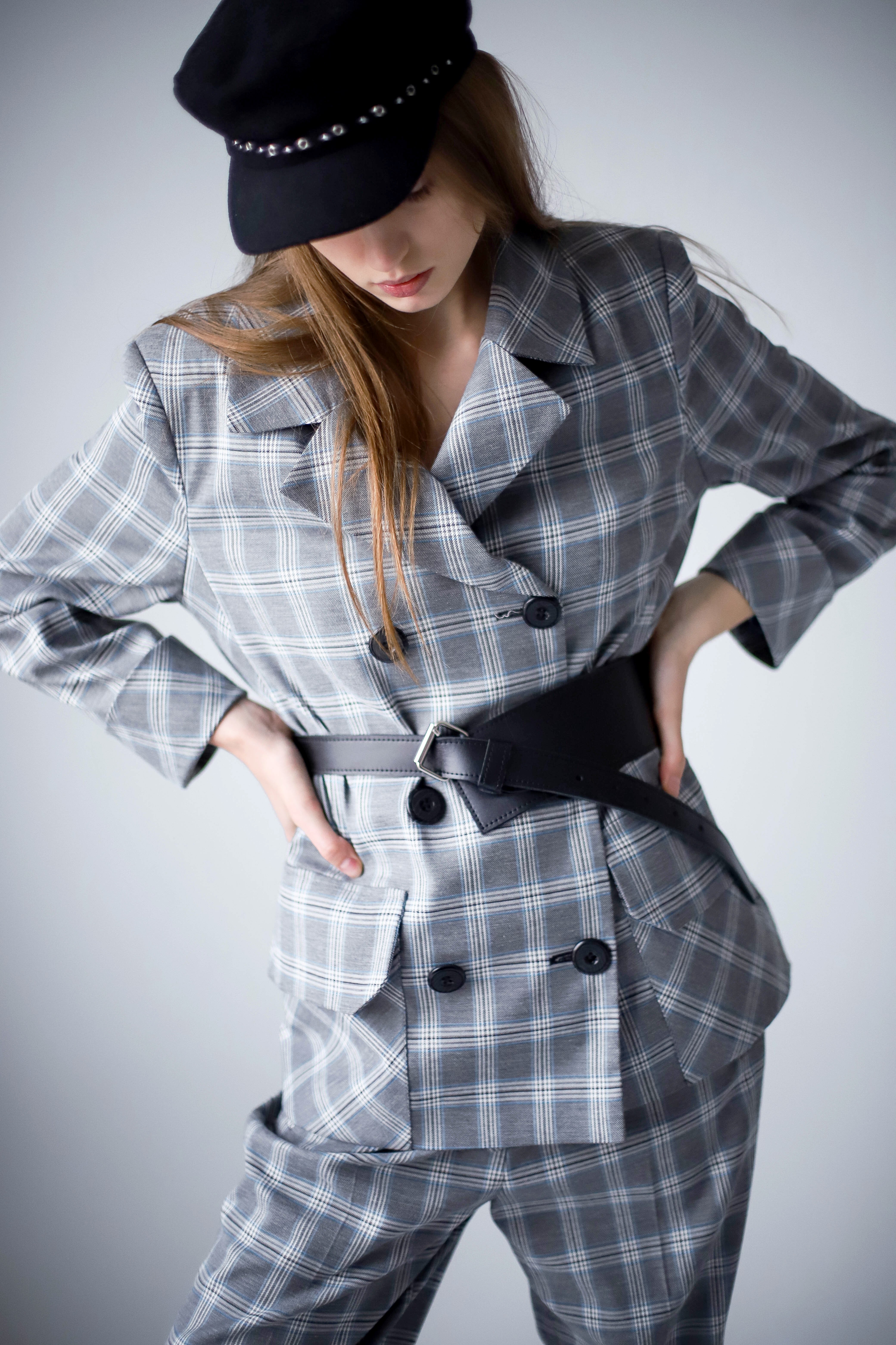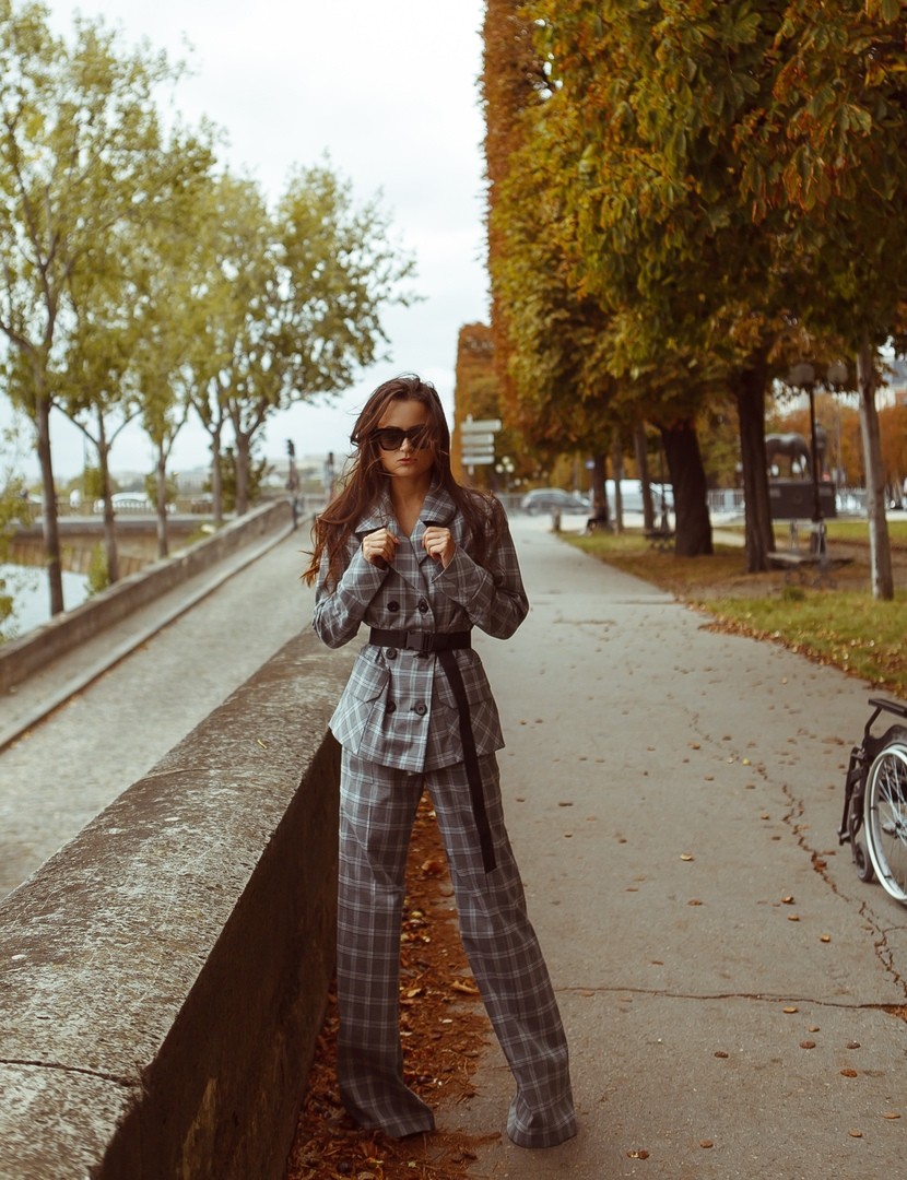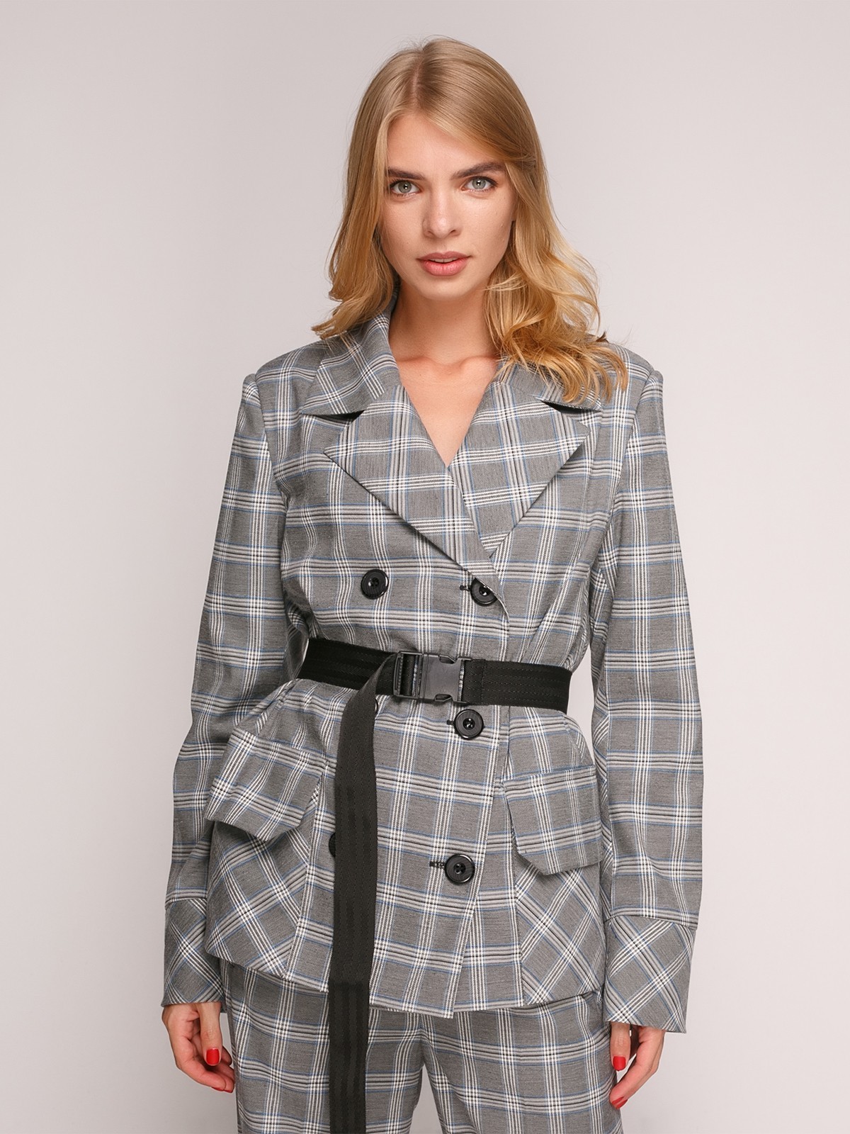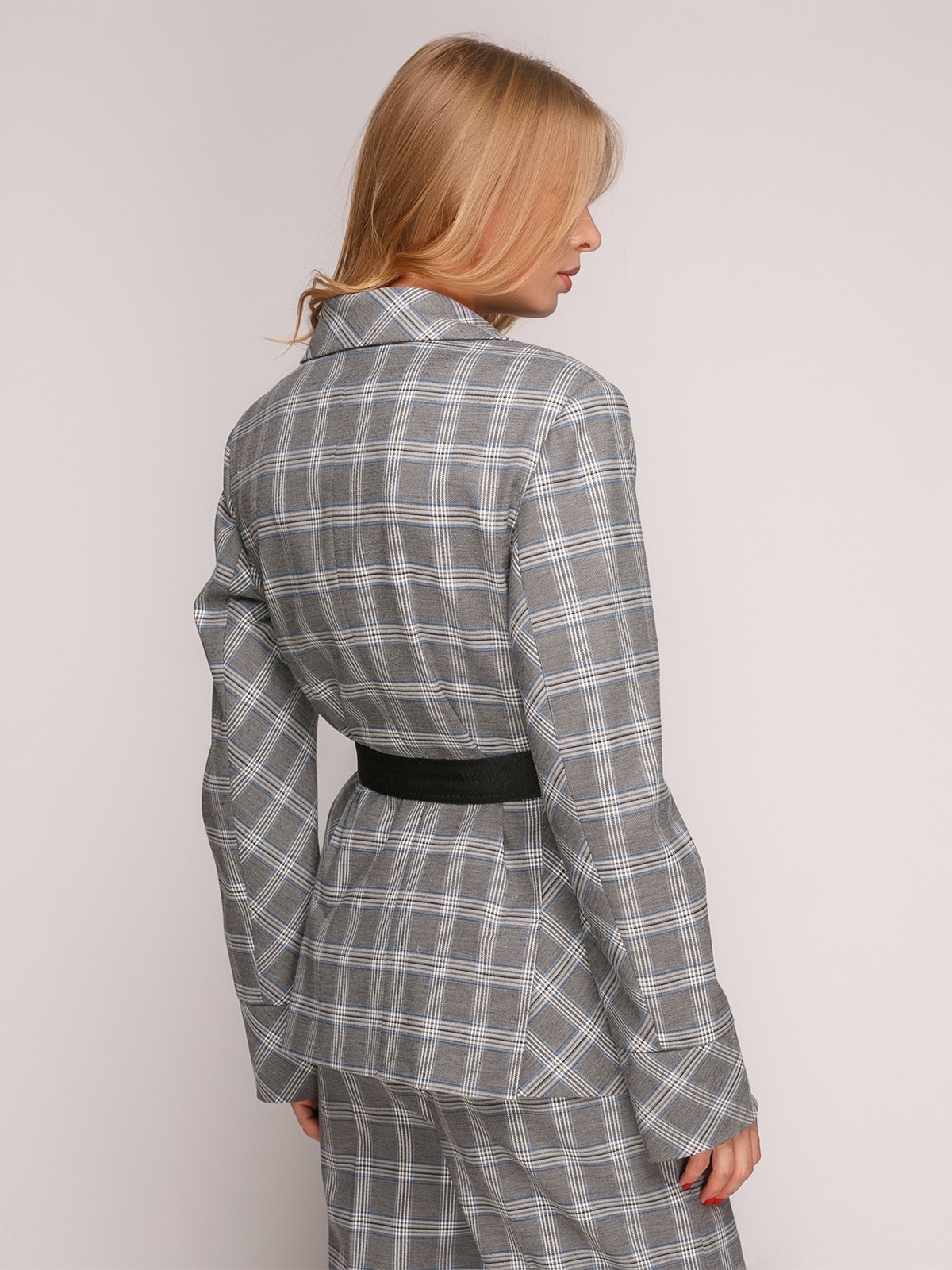 Свободный жакет из костюмной ткани серого цвета в клетку, прямого силуэта с отложным воротником, с накладным карманами с клапаном впереди, со шлицами по спинке и длинным втачным рукавом с отворотом. В комплекте с длинным поясом черного цвета на застежке.