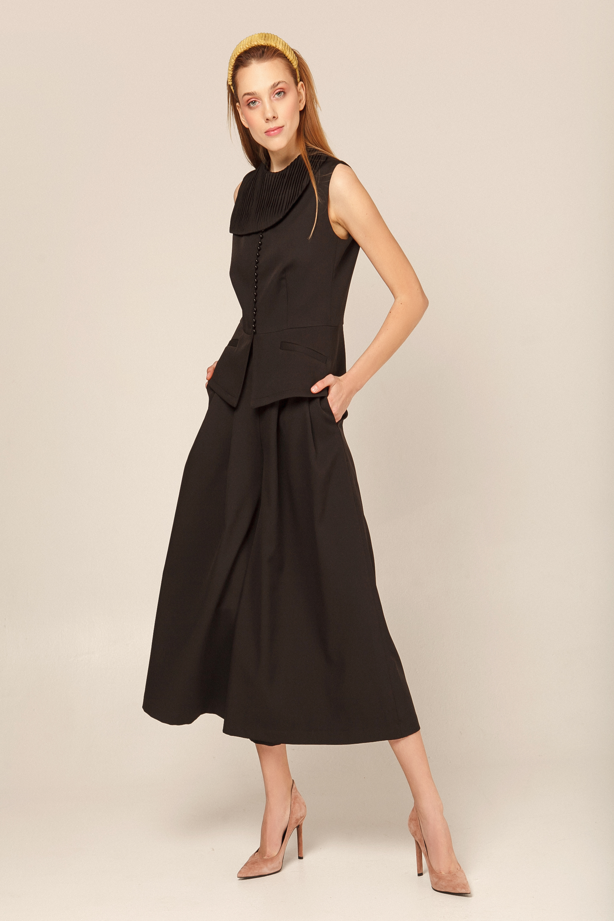 Розкльошені кюлоти чорного кольору, набувають силуету вільної спідниці міді довжини, що дозволяє з абсолютно будь-яким взуттям.
