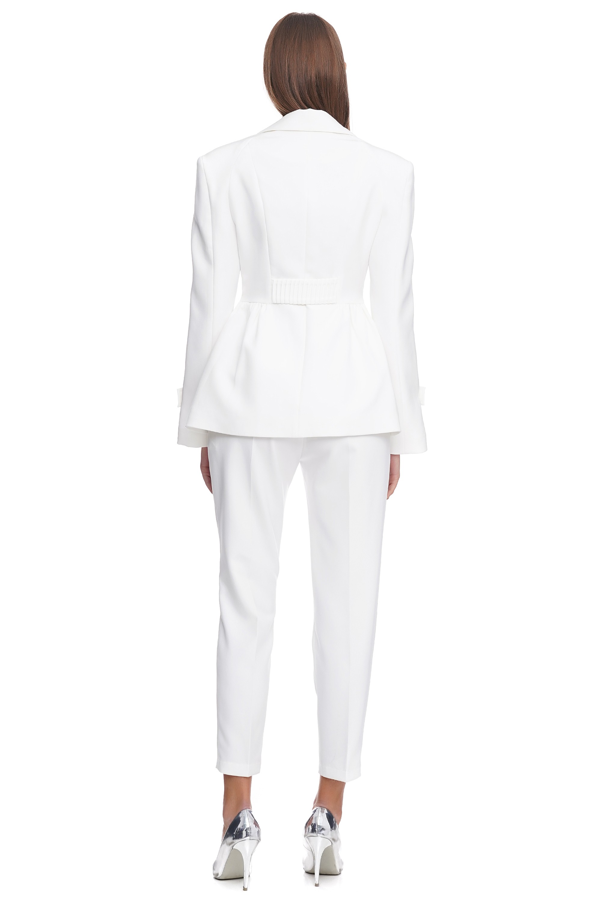 Штани з молочної костюмної тканини, з високим підйомом по талії, із замком блискавка, з косими кишенями, попереду зі складом, вільного силуету, звужені до низу, одна кишеня з клапаном ззаду.
