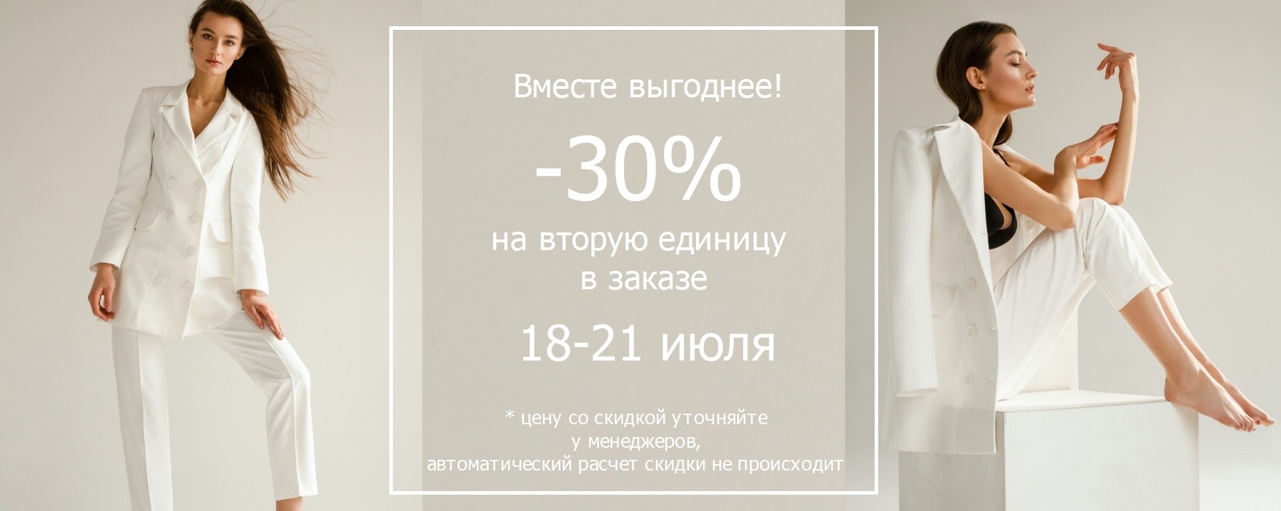 С 18го по 21е июля у нас действует акция "Вместе выгоднее". При покупке двух товаров - Вы получаете -30% скидки на вторую единицу заказа (с меньшей стоимостью). При покупке более двух товаров скидка на КАЖДУЮ ВТОРУЮ единицу в чеке (не на все после первой). Скидки не суммируются! На акционные предложения скидка не распространяется.