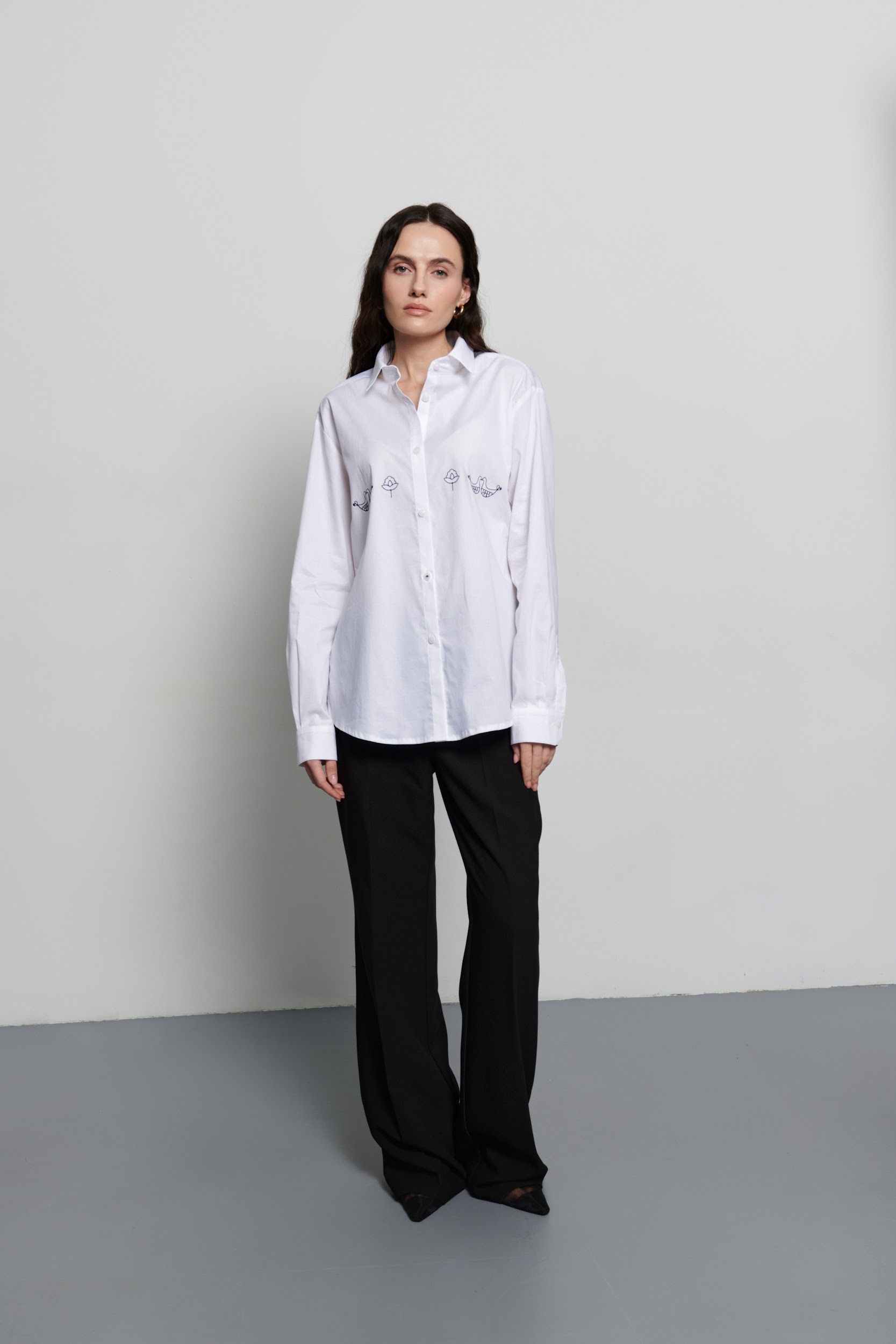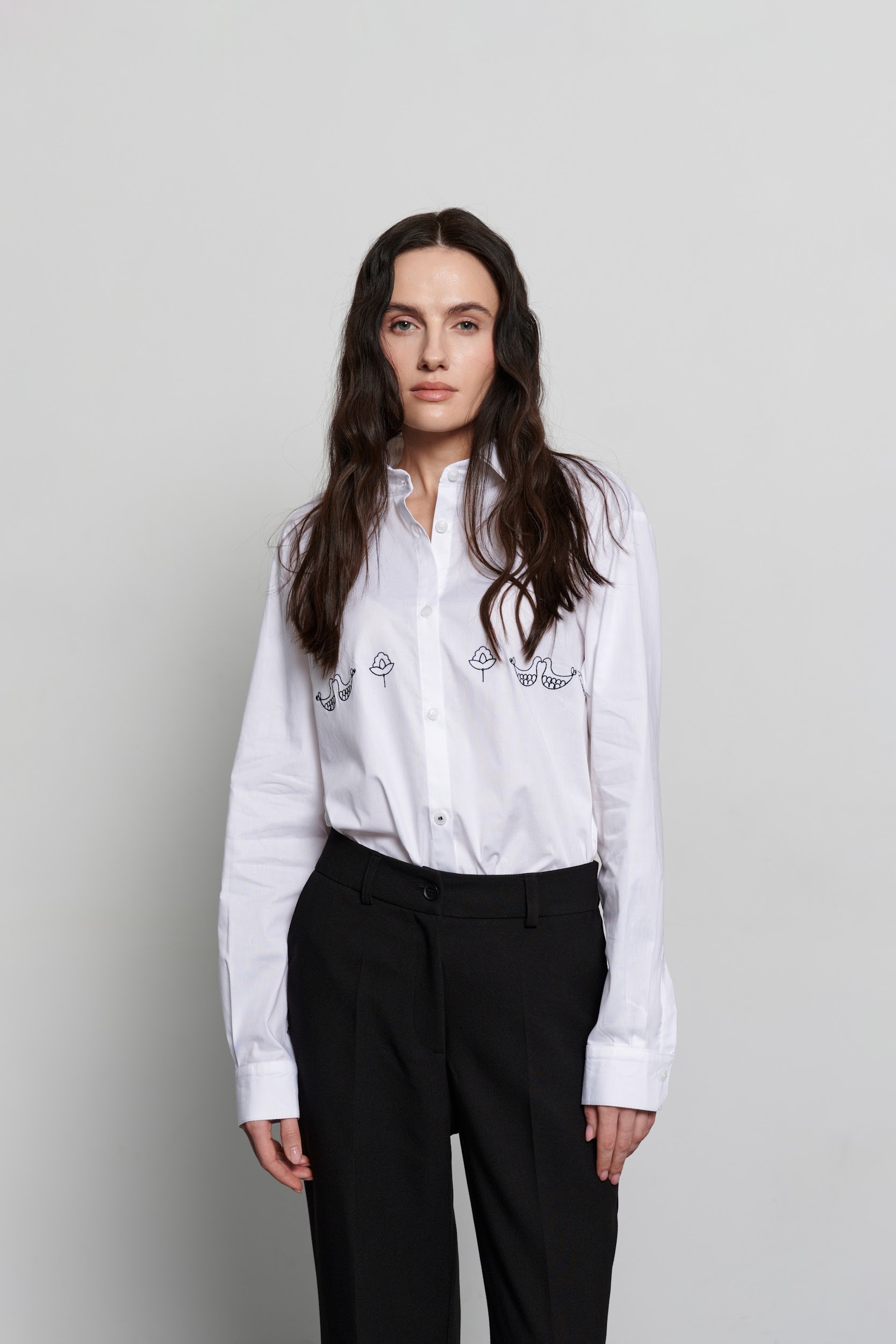 Стриманий силует білої сорочки поєднується з вишивкою натхненою мотивами Опішнянської кераміки. Графічна вишивка зображує стилізовані квіти та птахів, що символізують гармонію та відродження. Сорочка має вільний крій, класичний комір та застібку на ѓудзики, що робить її універсальним елементом як офісного, так і кежуал гардеробу.