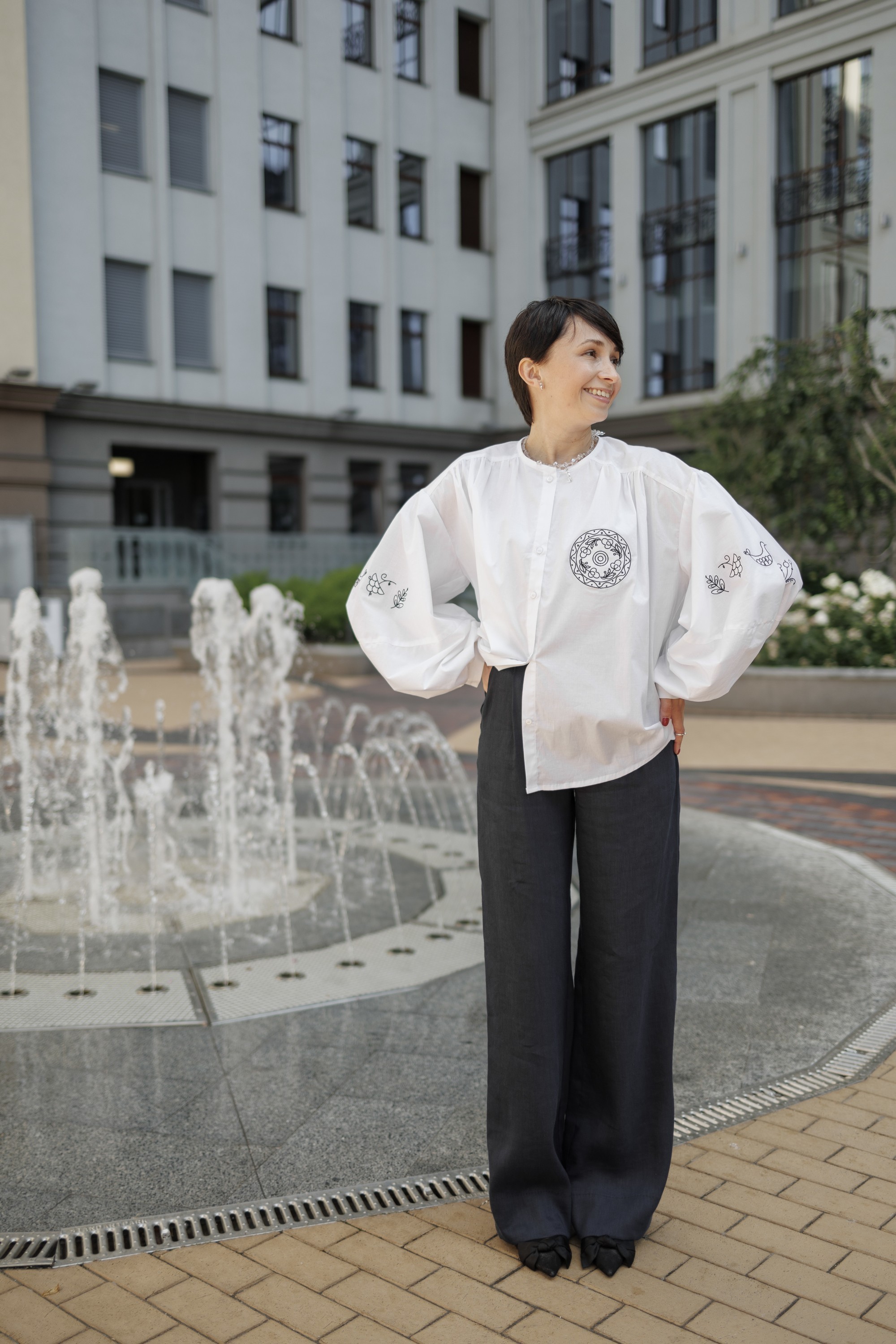 З орнаментом чорного кольору, виконаним за мотивами Опішнянської кераміки, який відображає автентичні деталі: кругла композиція з квітами на грудях, птахи як символи миру та гармонії на рукавах, а також витончені рослинні елементи, що додають природньої легкості.