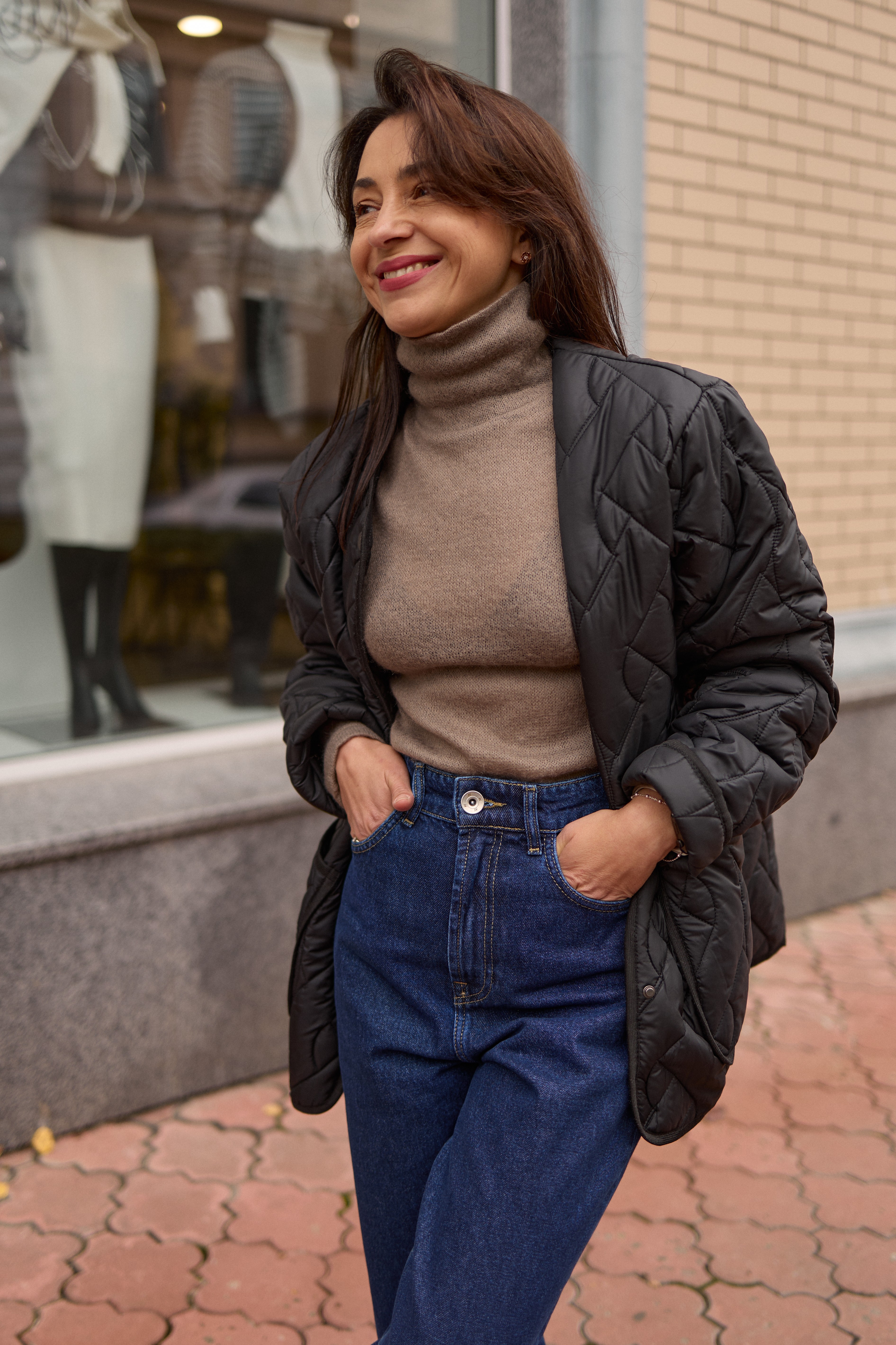 Чорна стьобана куртка з накладними кишенями