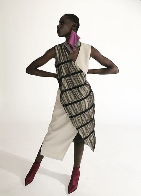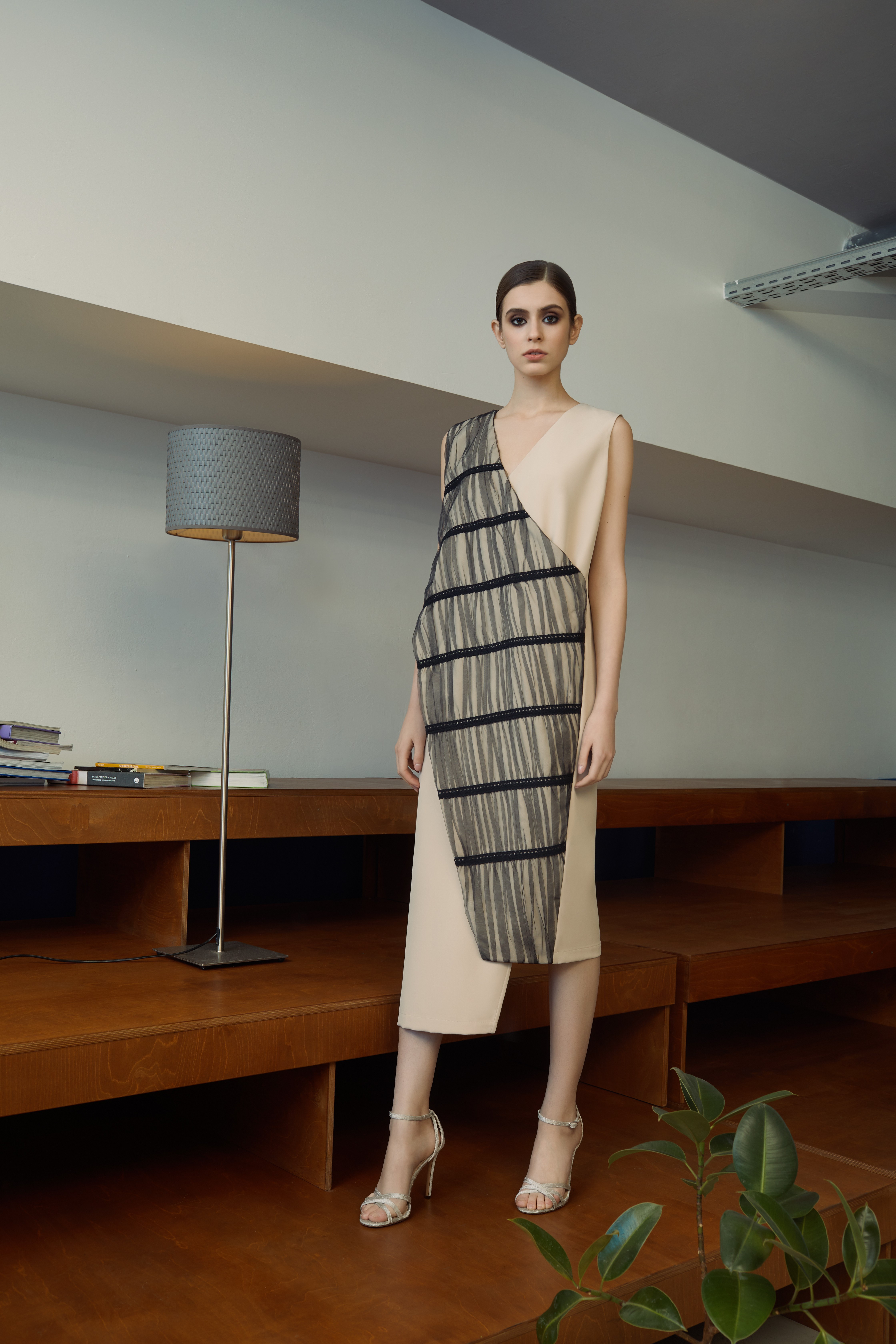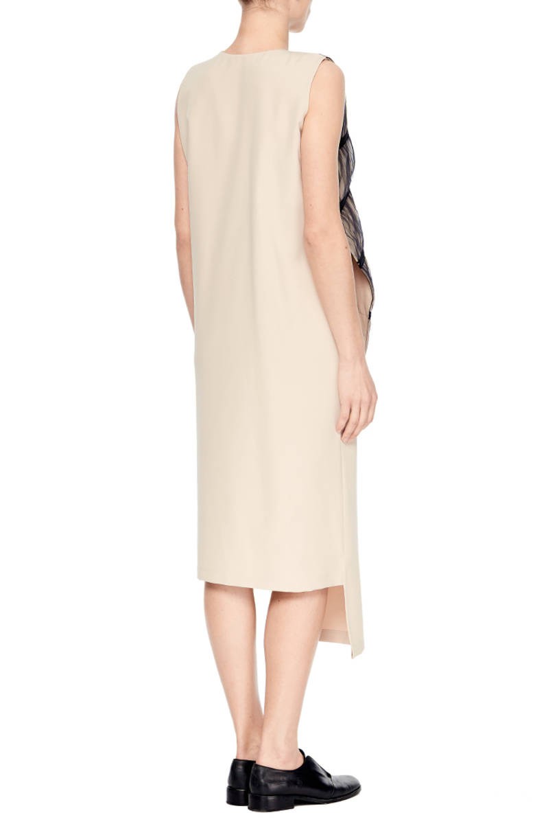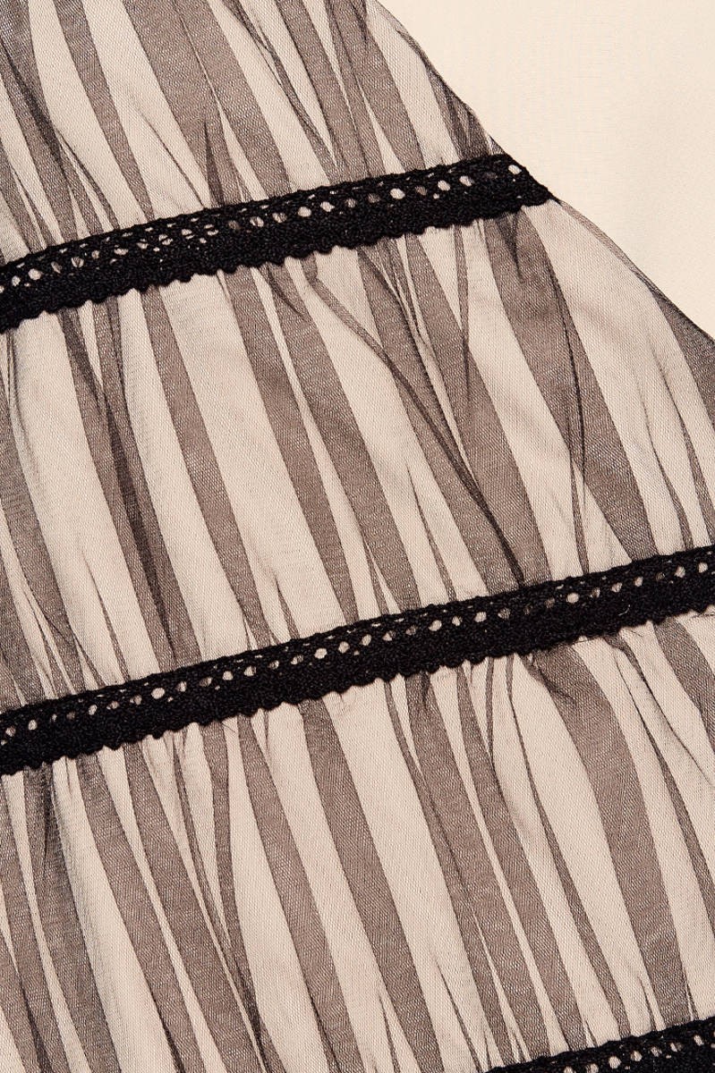 Особливості: Поєднання двох видів тканини: бежева костюмна і бавовняна бежева декорована чорним фатином і бавовняним мереживом. Асиметрія довжини по полиці. V-подібний виріз горловини.