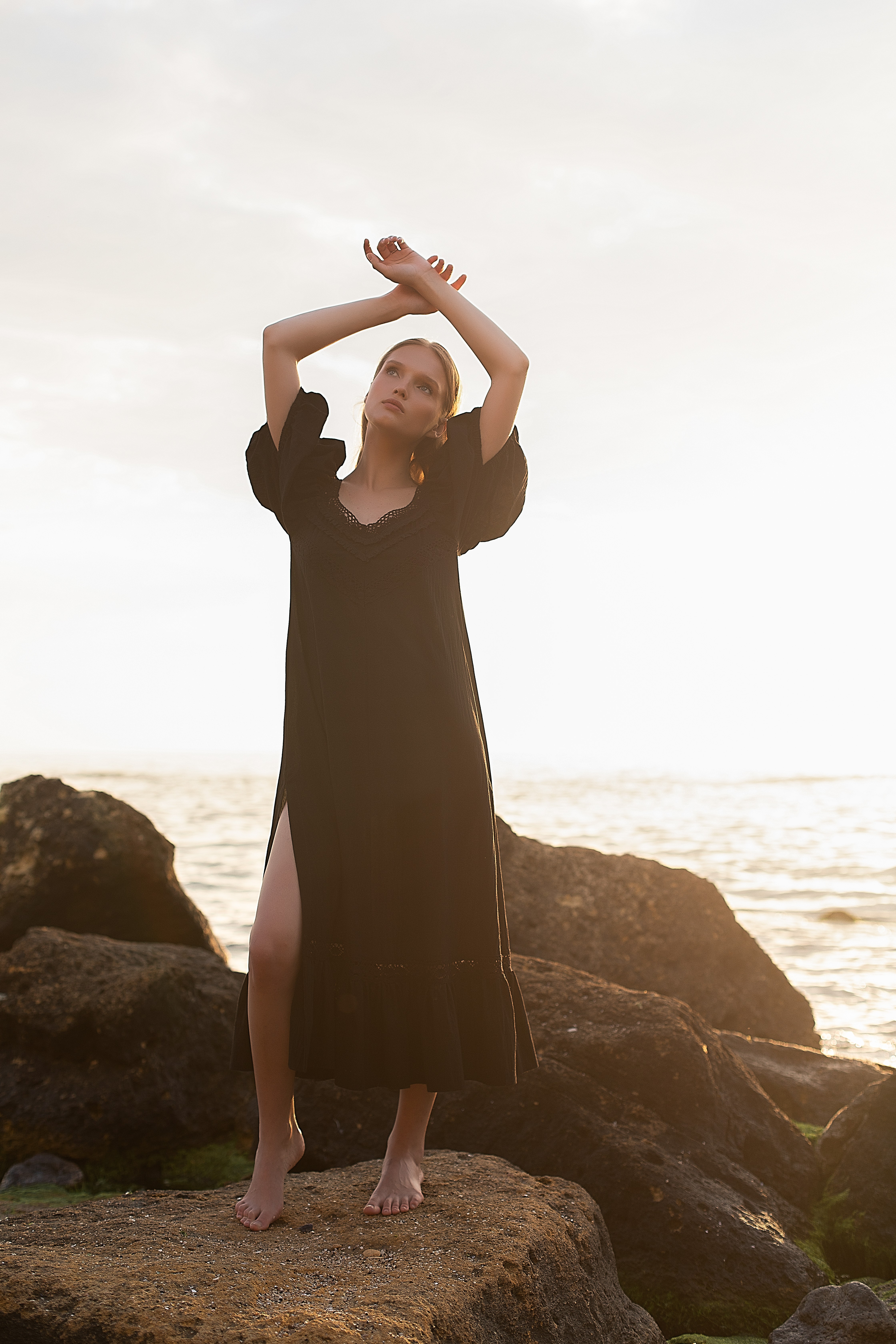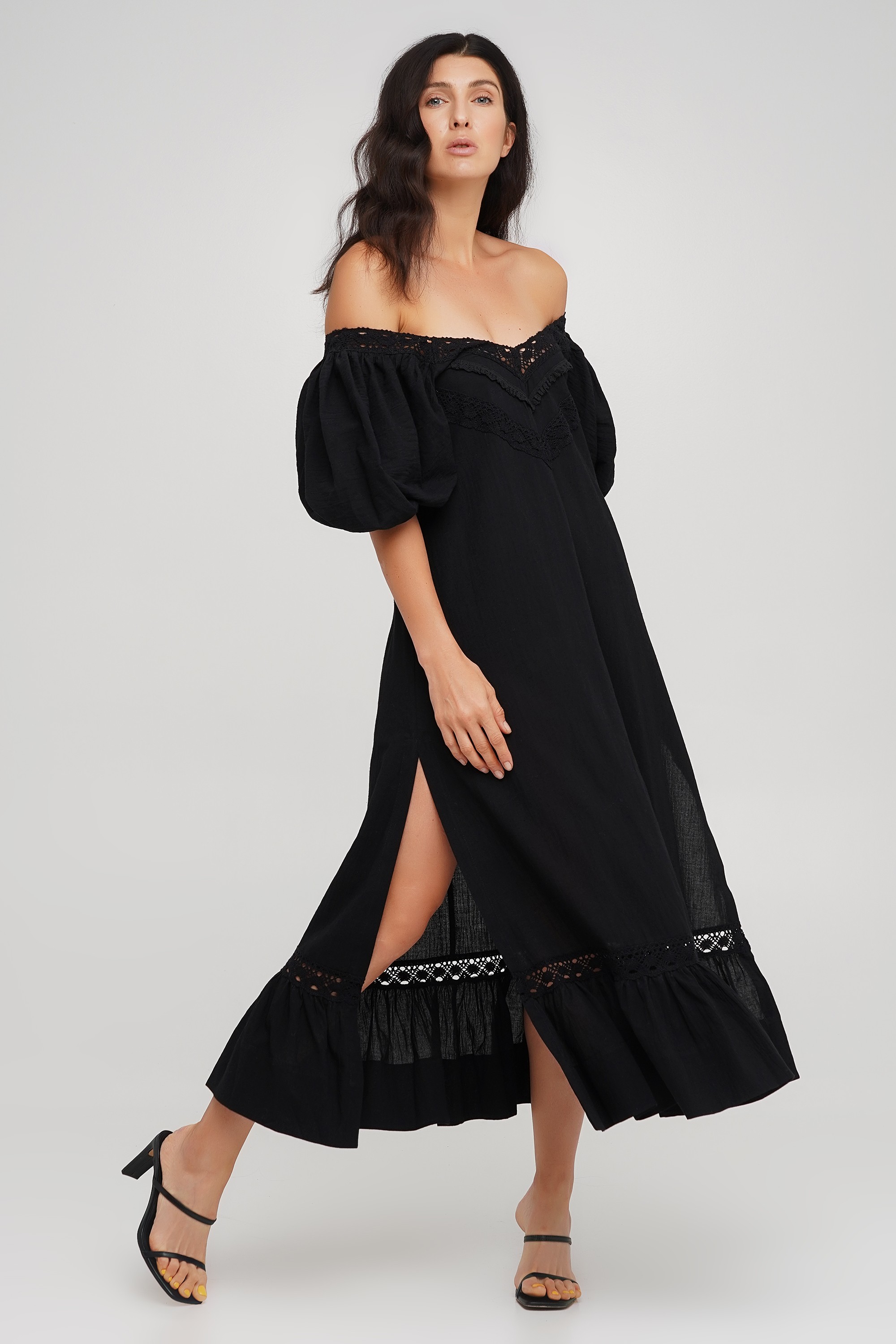 Сукня силуету трапеція, з об'ємним рукавом, мереживом в обробці.