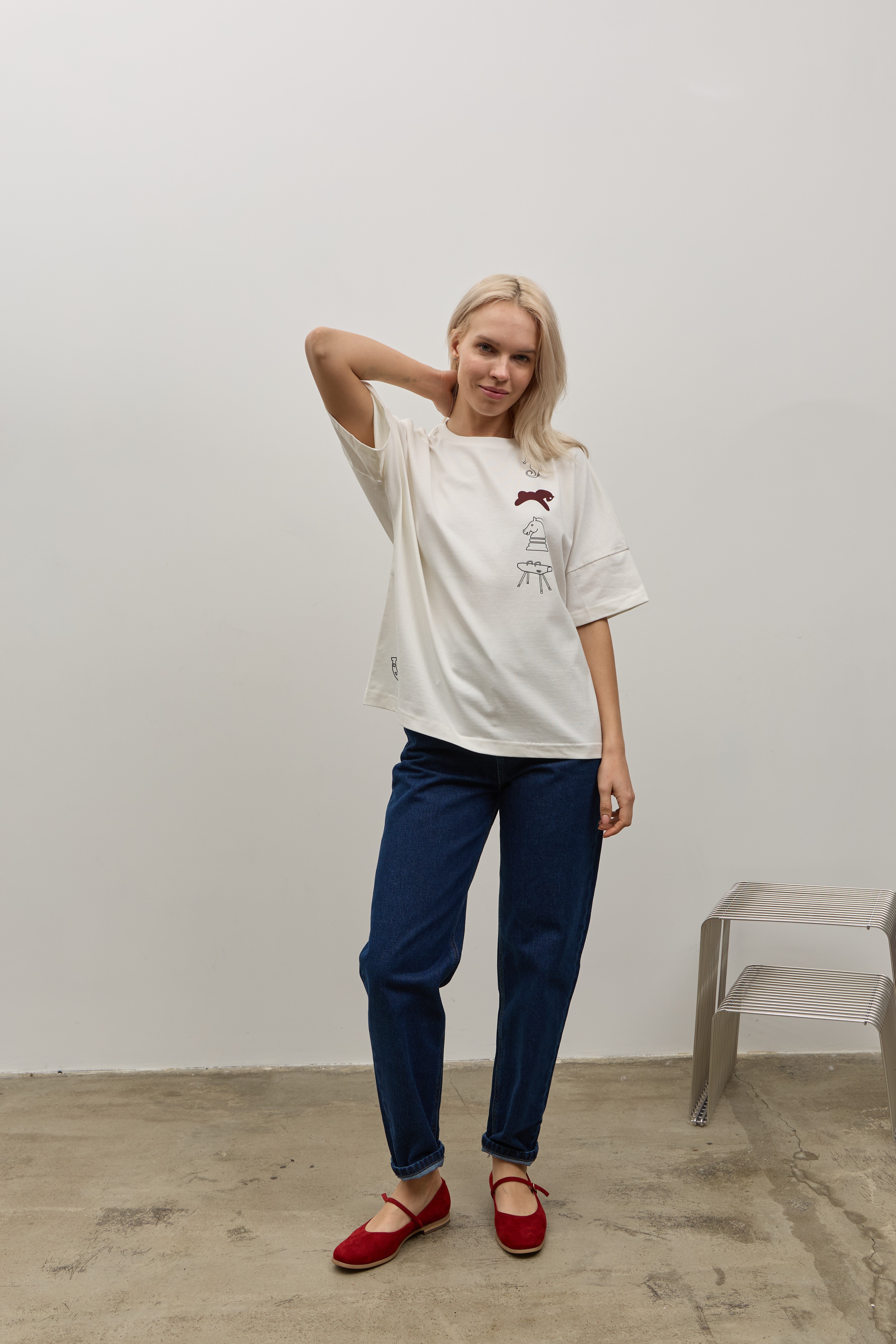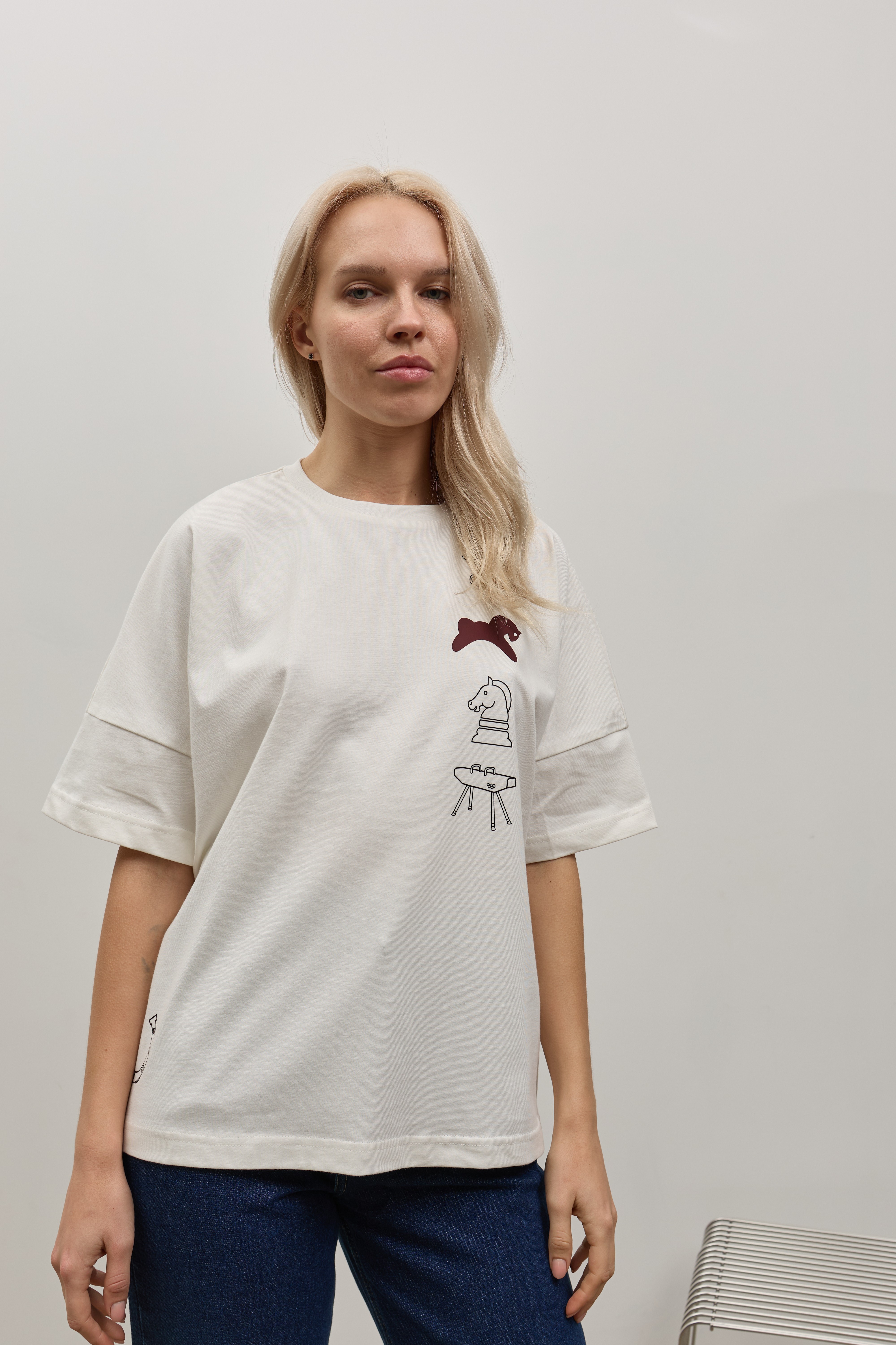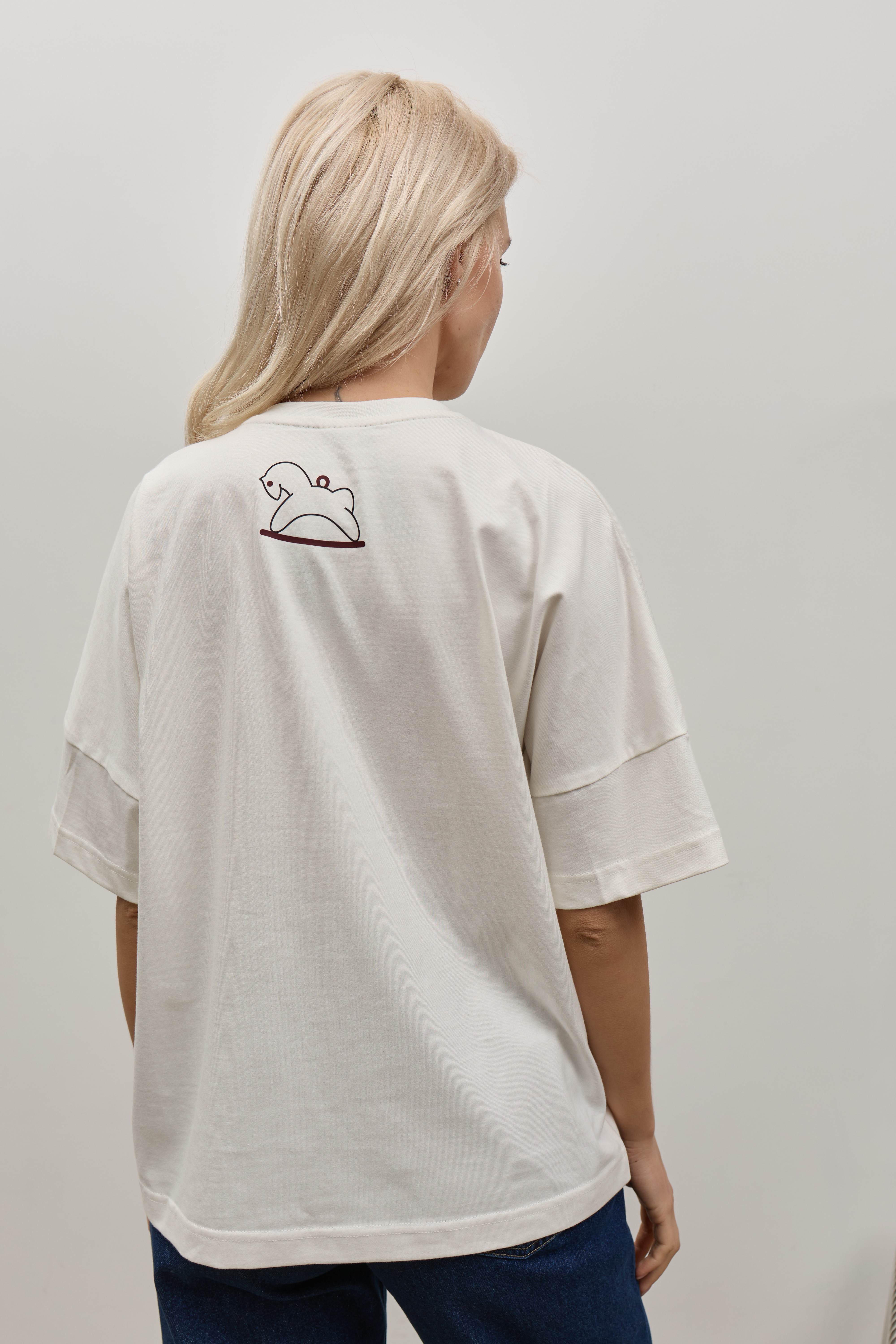 Біла футболка зі спущеним рукавом та друком