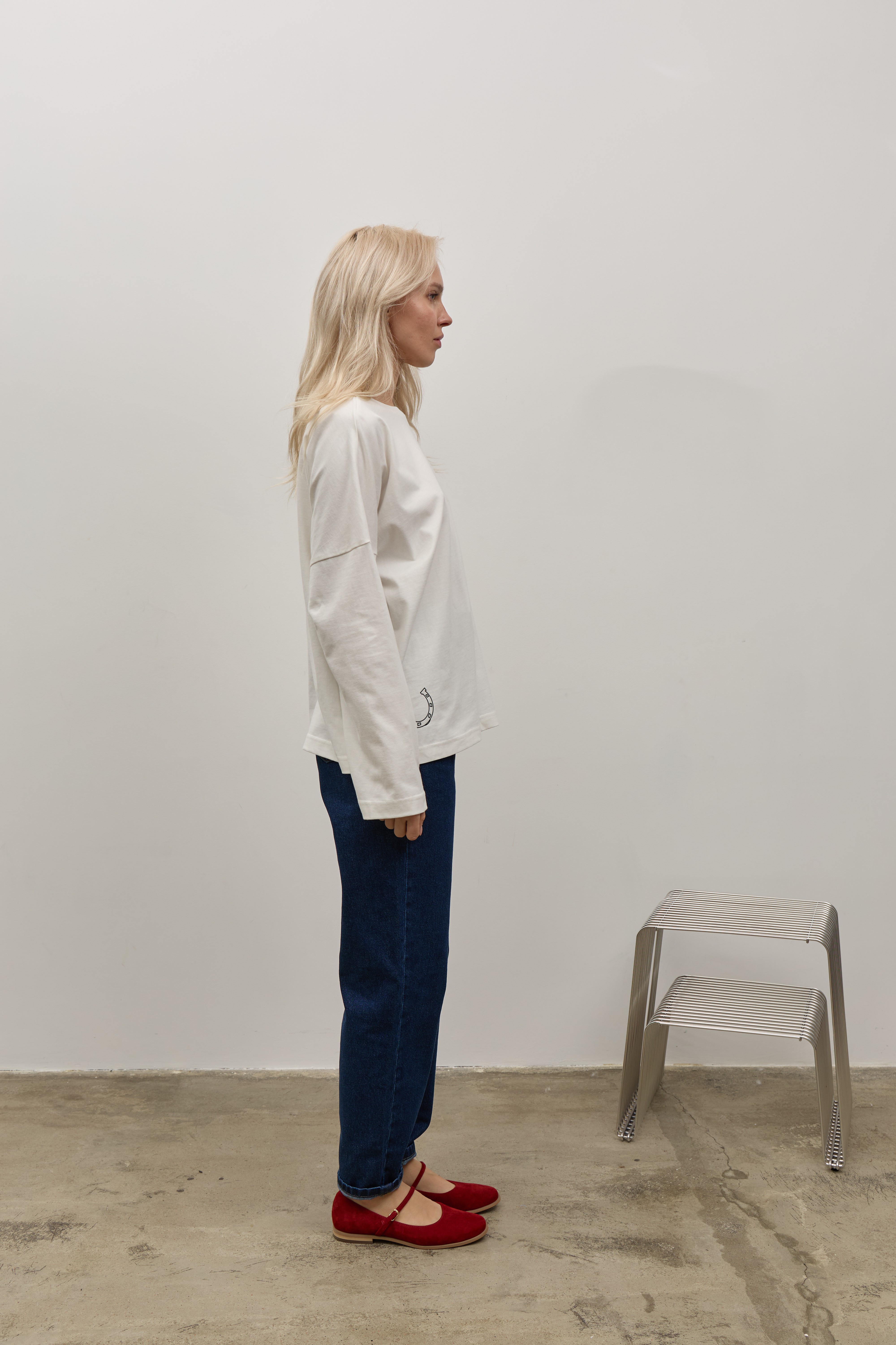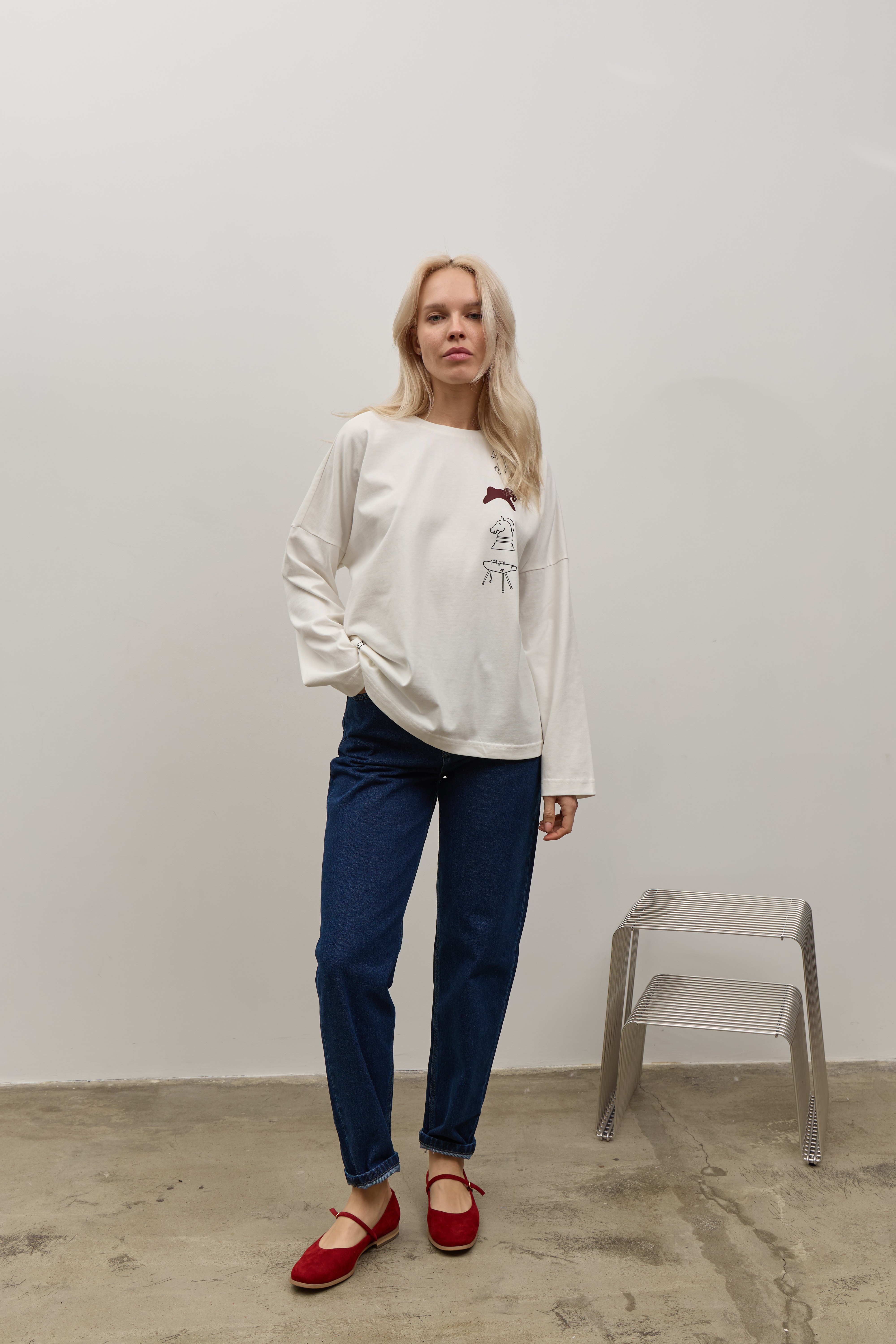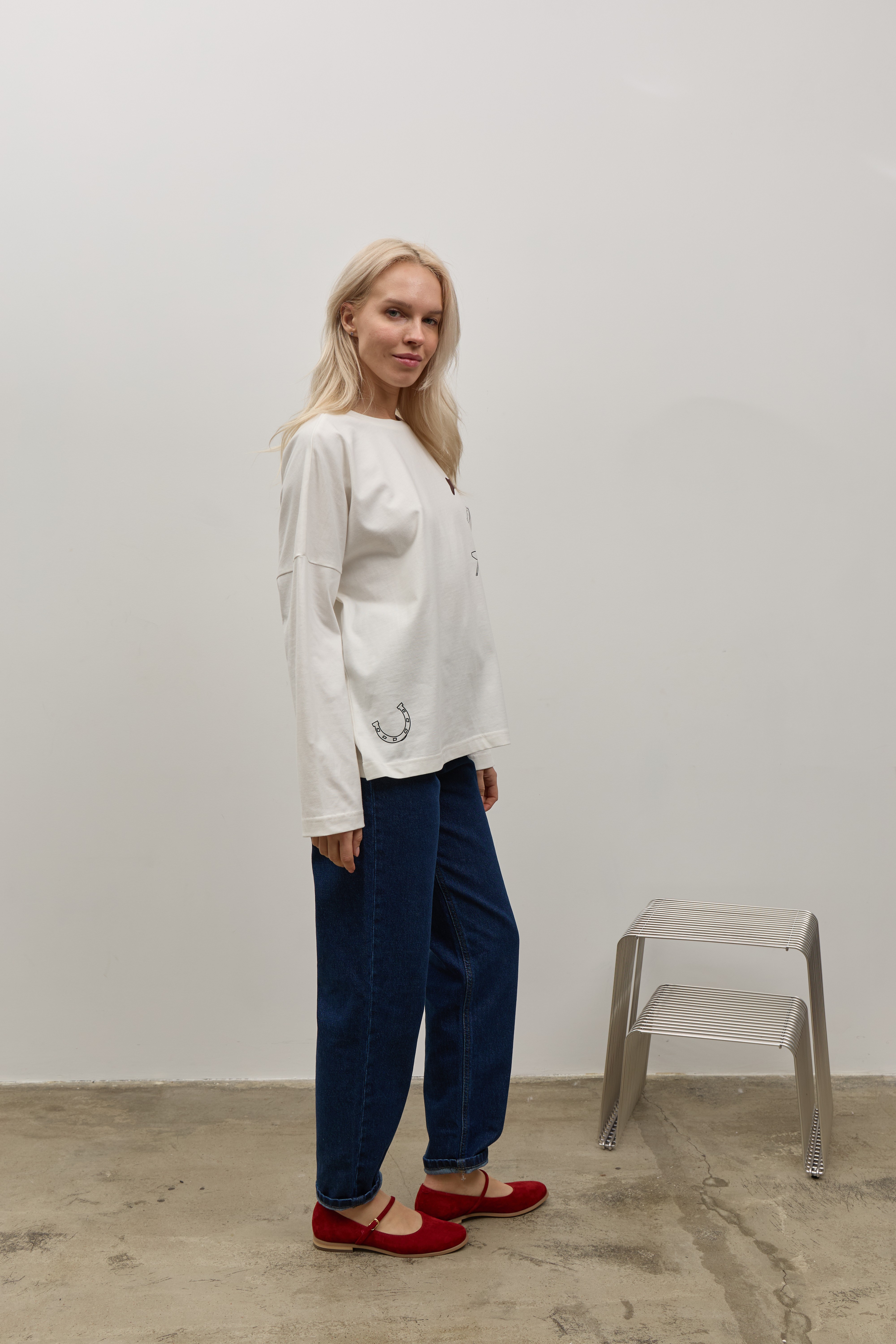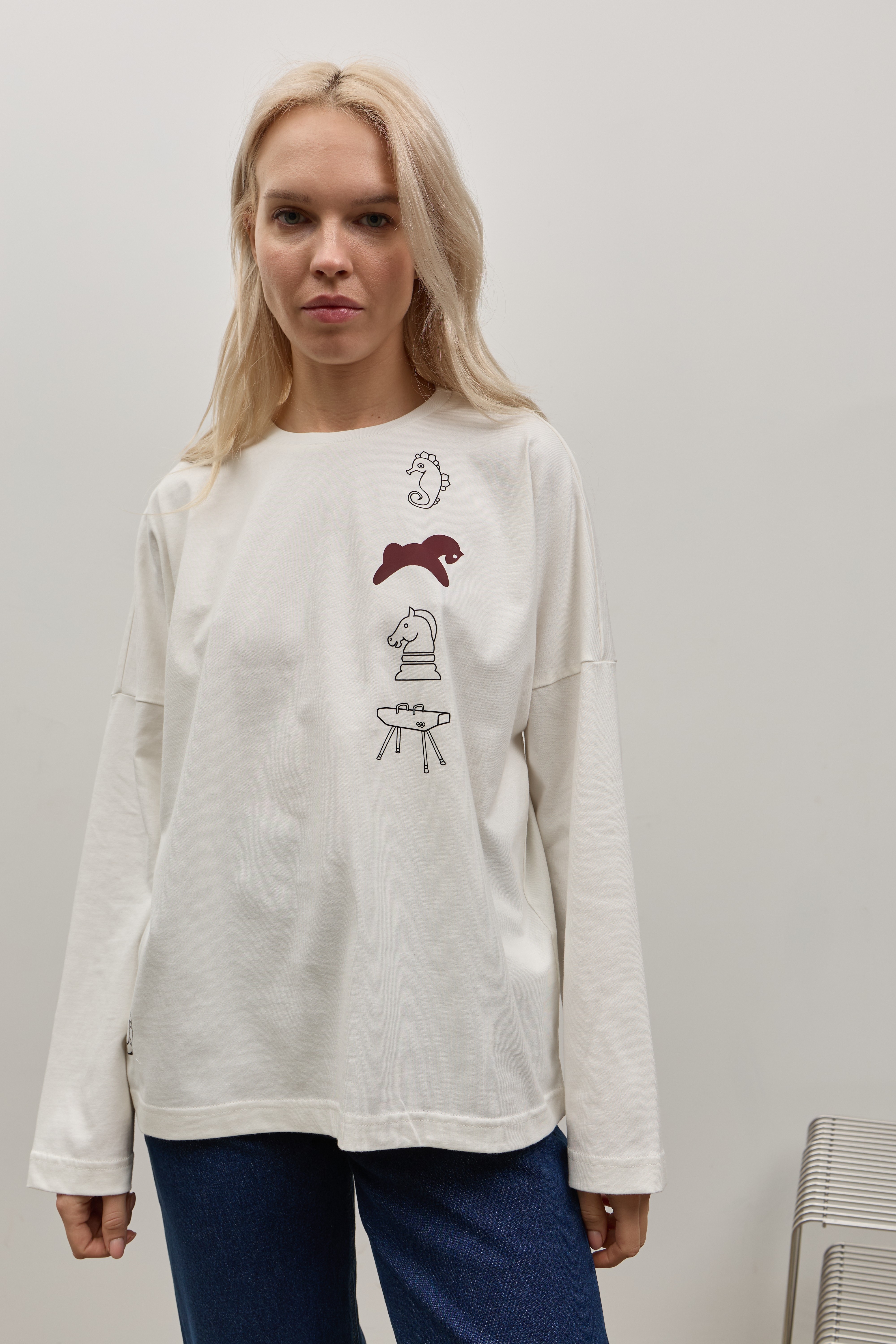 Білий лонгслів зі спущеним рукавом та друком